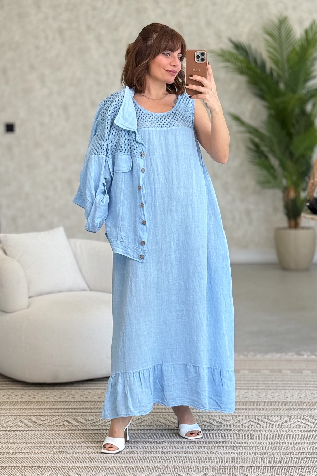Üst Kısımları Fileli Elbise Ve Ceketli Keten Takım Bebe Mavi Renk