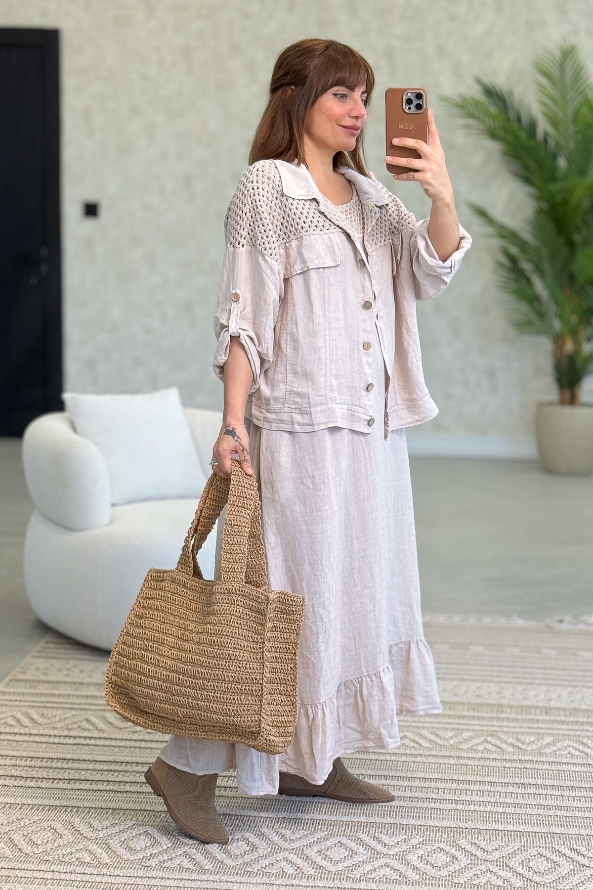 Üst Kısımları Fileli Elbise Ve Ceketli Keten Takım Bej Renk