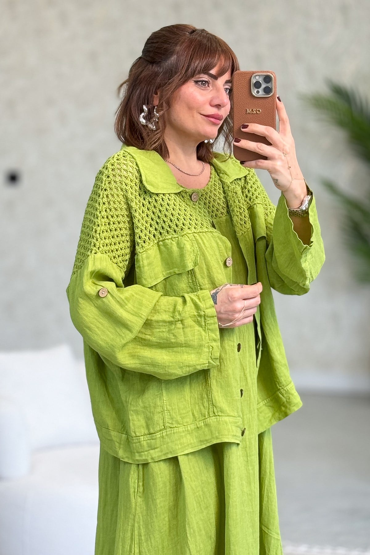 Üst Kısımları Fileli Elbise Ve Ceketli Keten Takım Fıstık Yeşil Renk