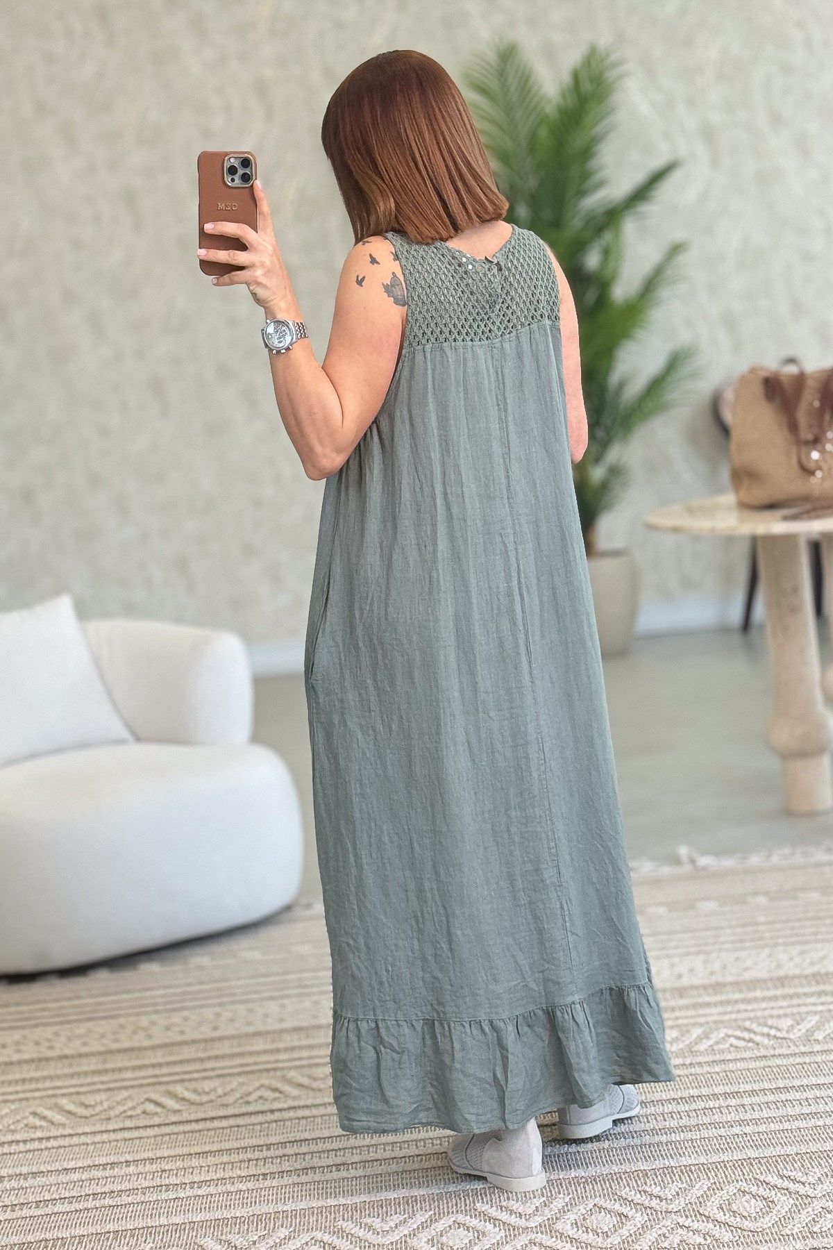 Üst Kısımları Fileli Elbise Ve Ceketli Keten Takım Haki Renk