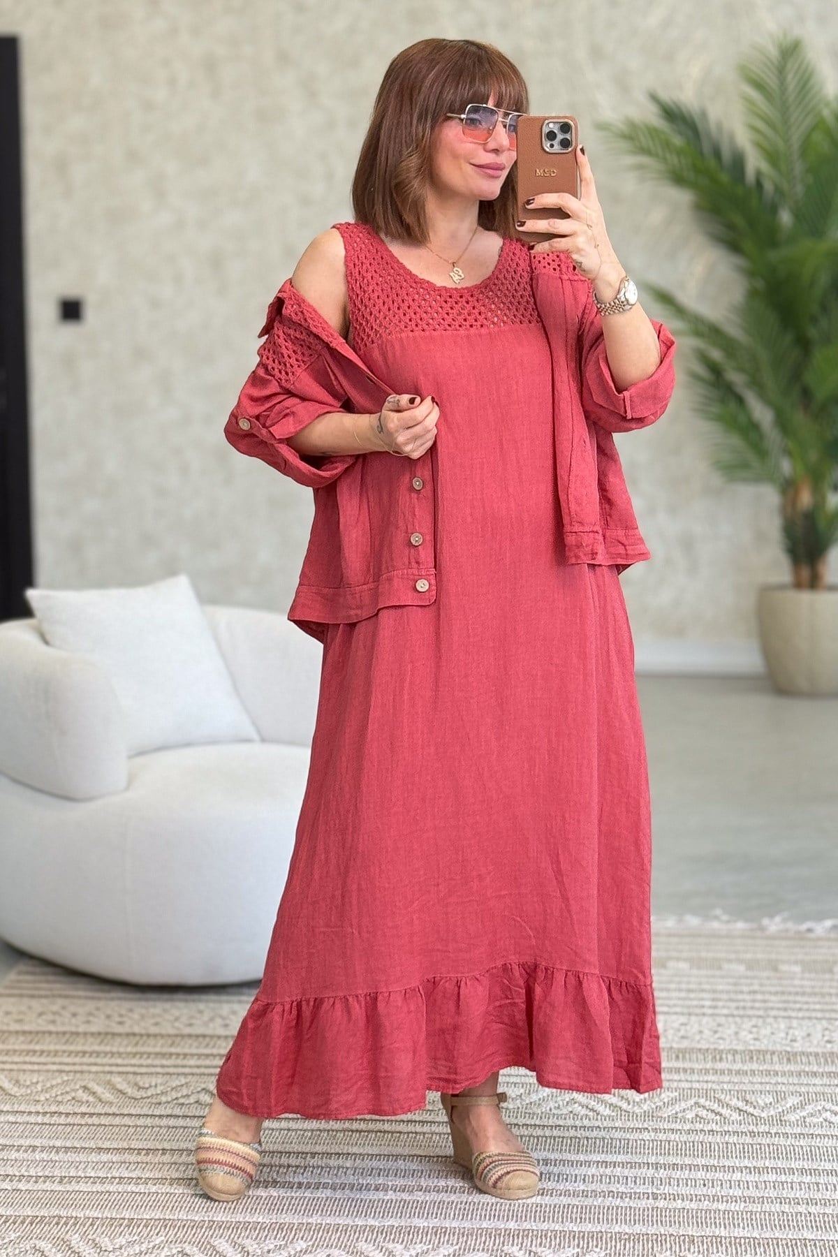 Üst Kısımları Fileli Elbise Ve Ceketli Keten Takım Kiremit Renk