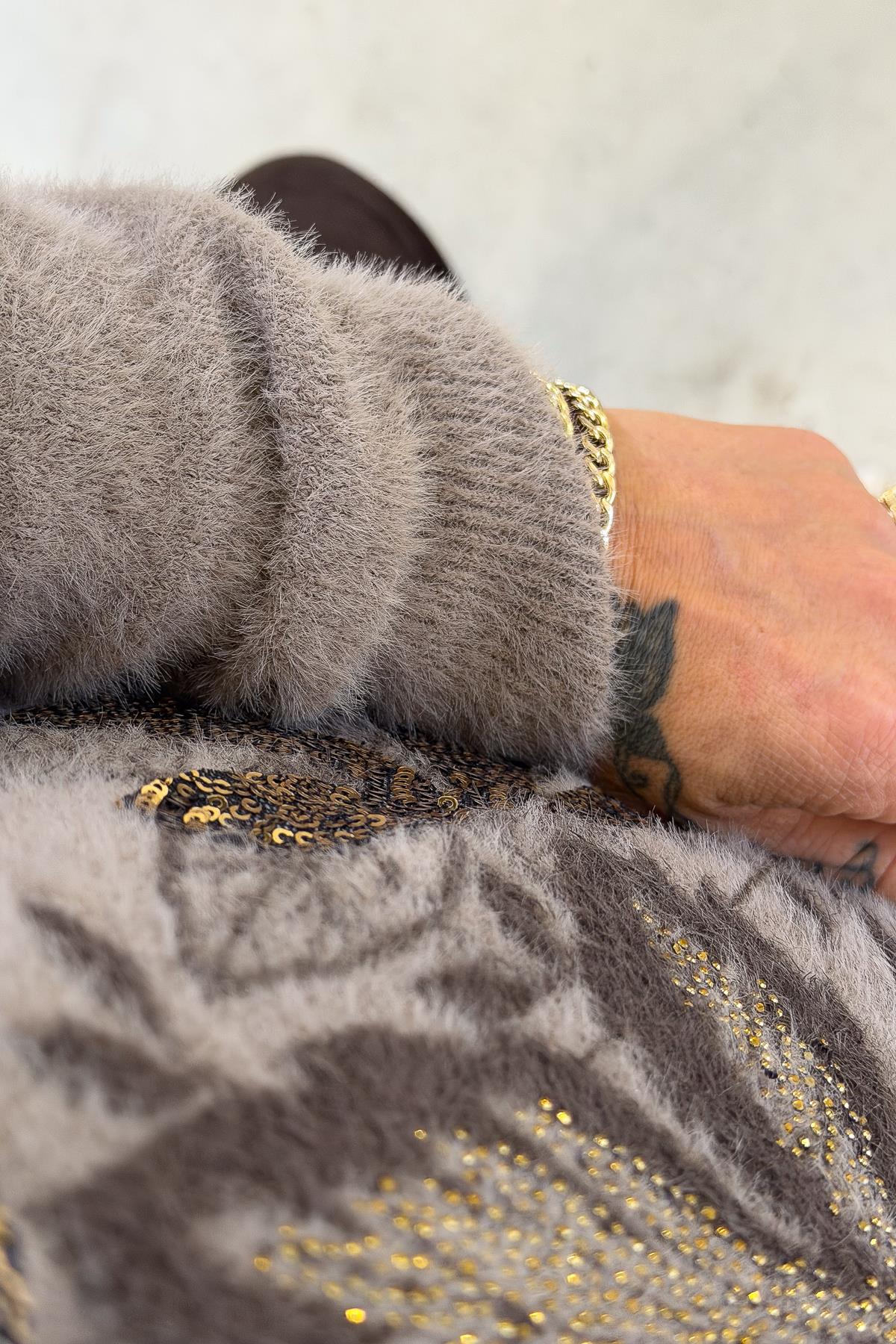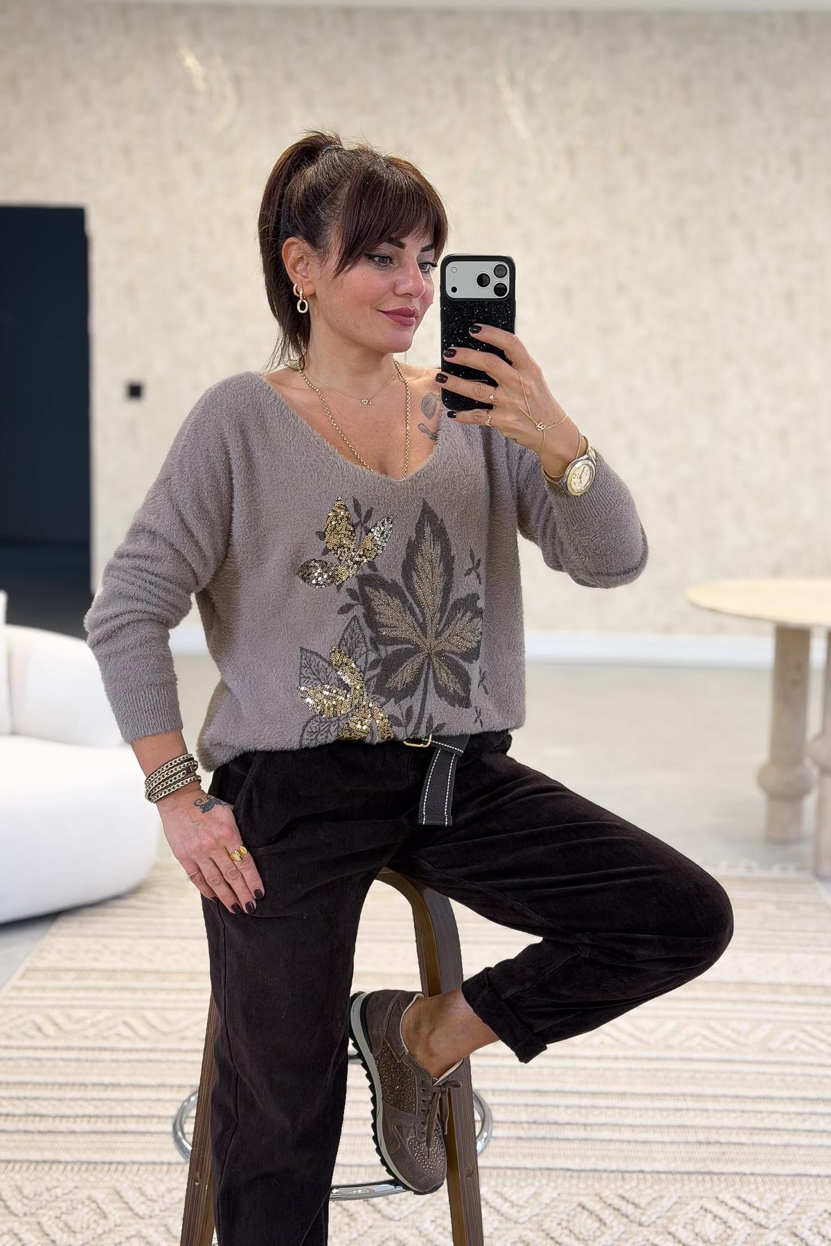 Yaprak Desenli V Yaka Angora Kazak Vizon Renk