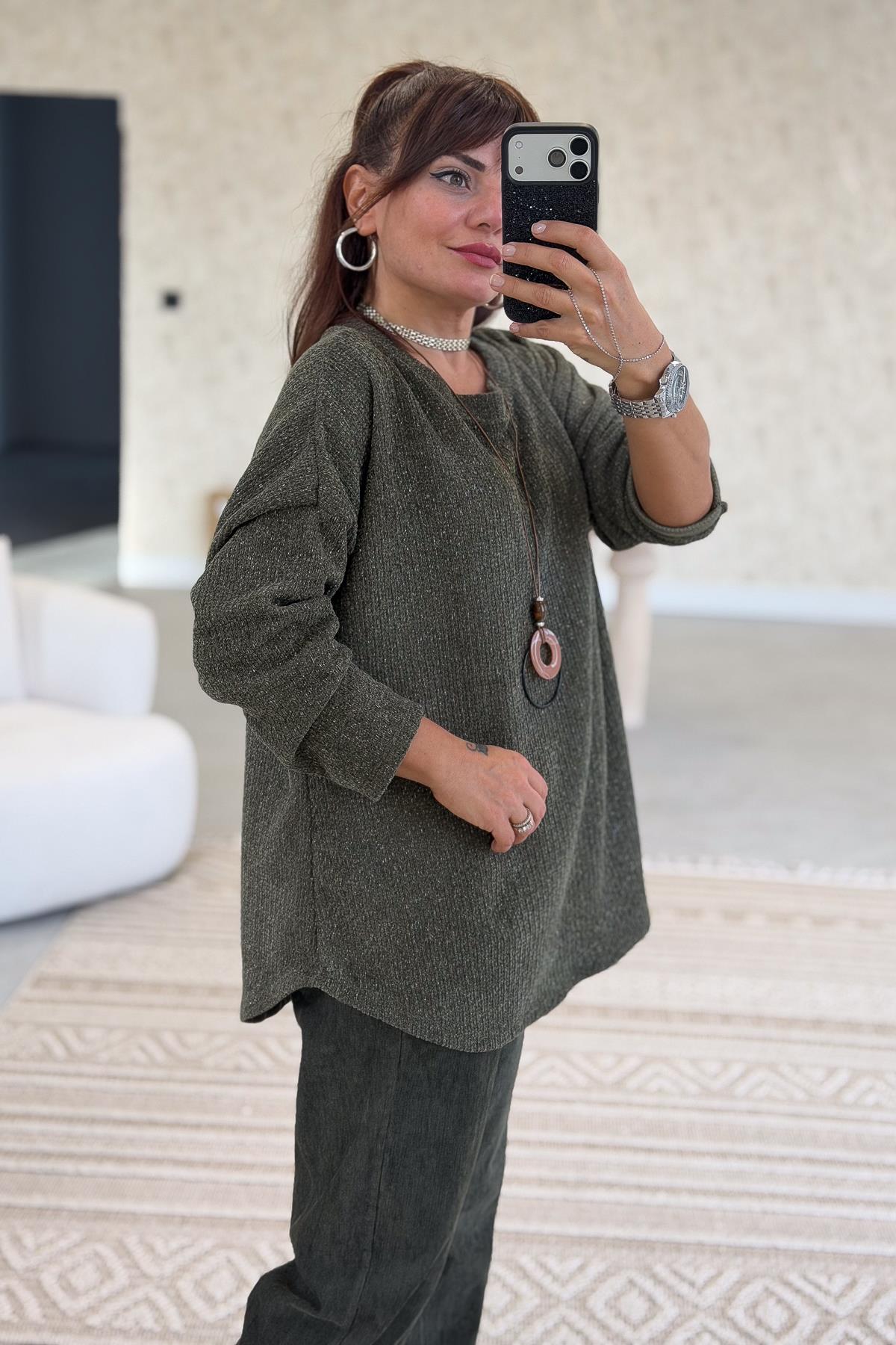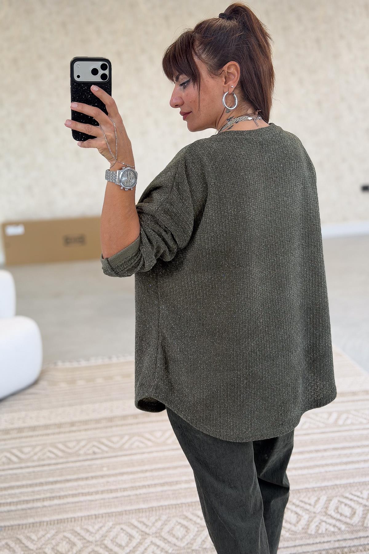 Yuvarlak Yaka Simli Kadife Bluz Haki Renk