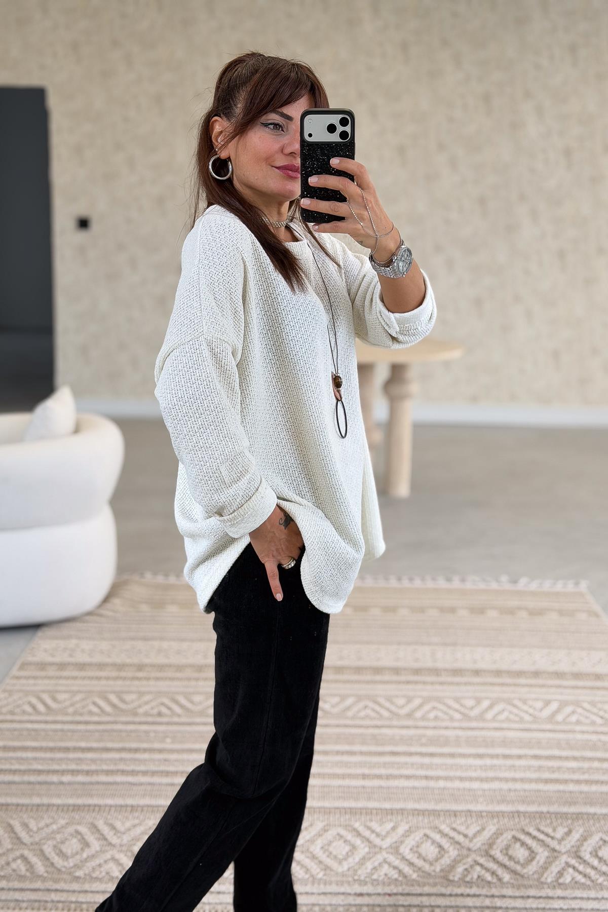Yuvarlak Yaka Simli Kadife Bluz Krem Renk