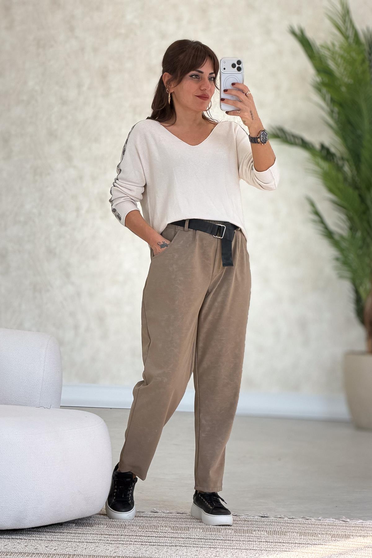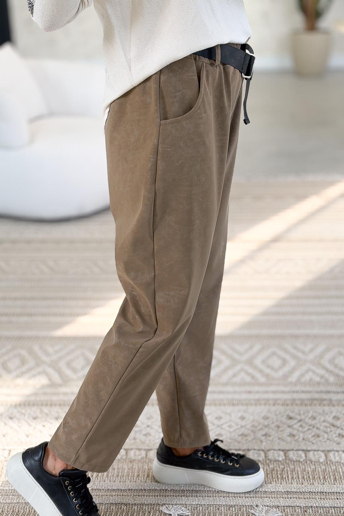 Eskitme Deri Görünümlü Pantolon Camel Renk