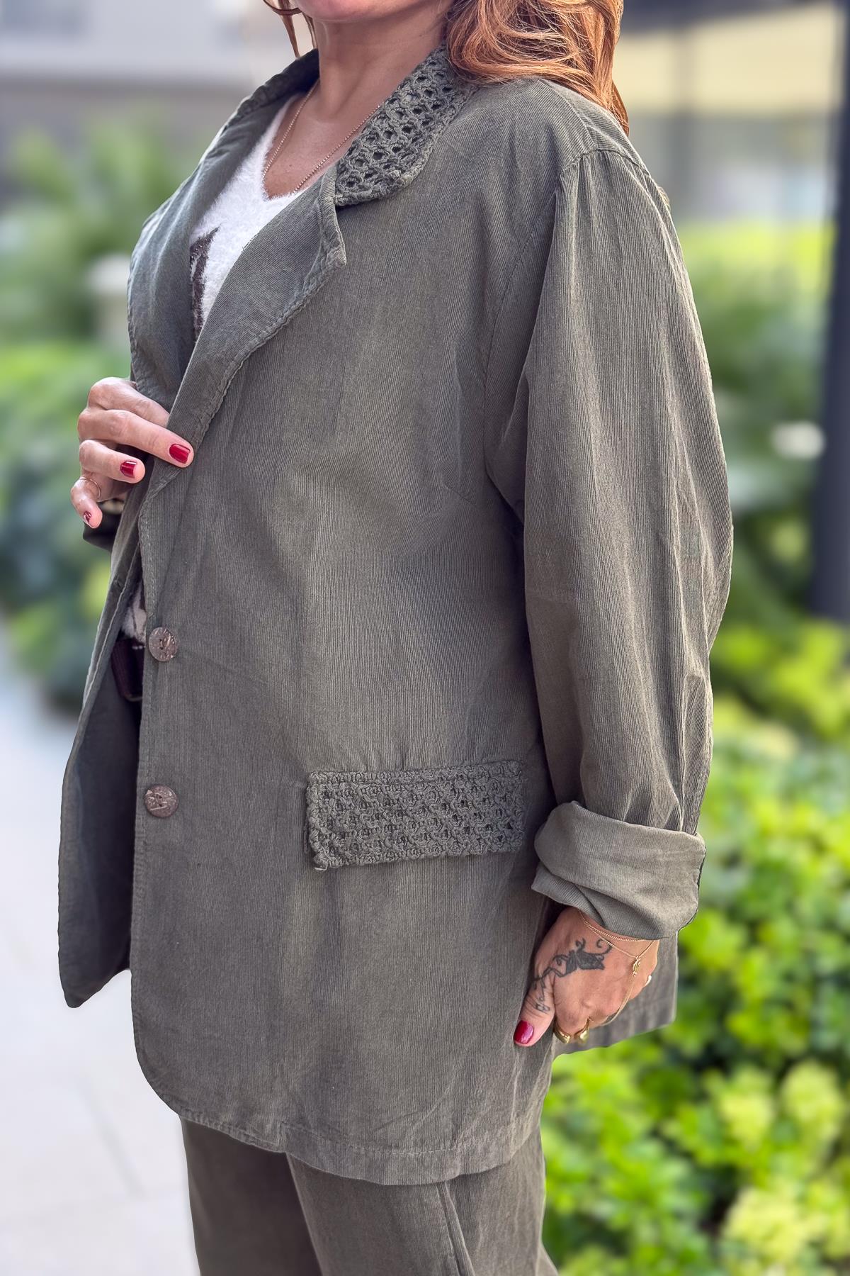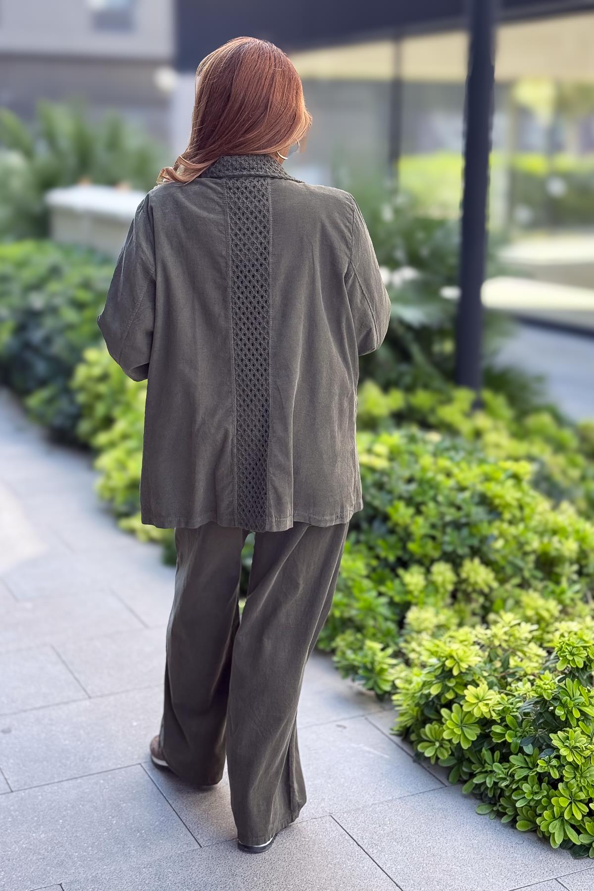 File Yaka Detaylı İnce Fitilli Kadife Blazer Ceket Haki Renk