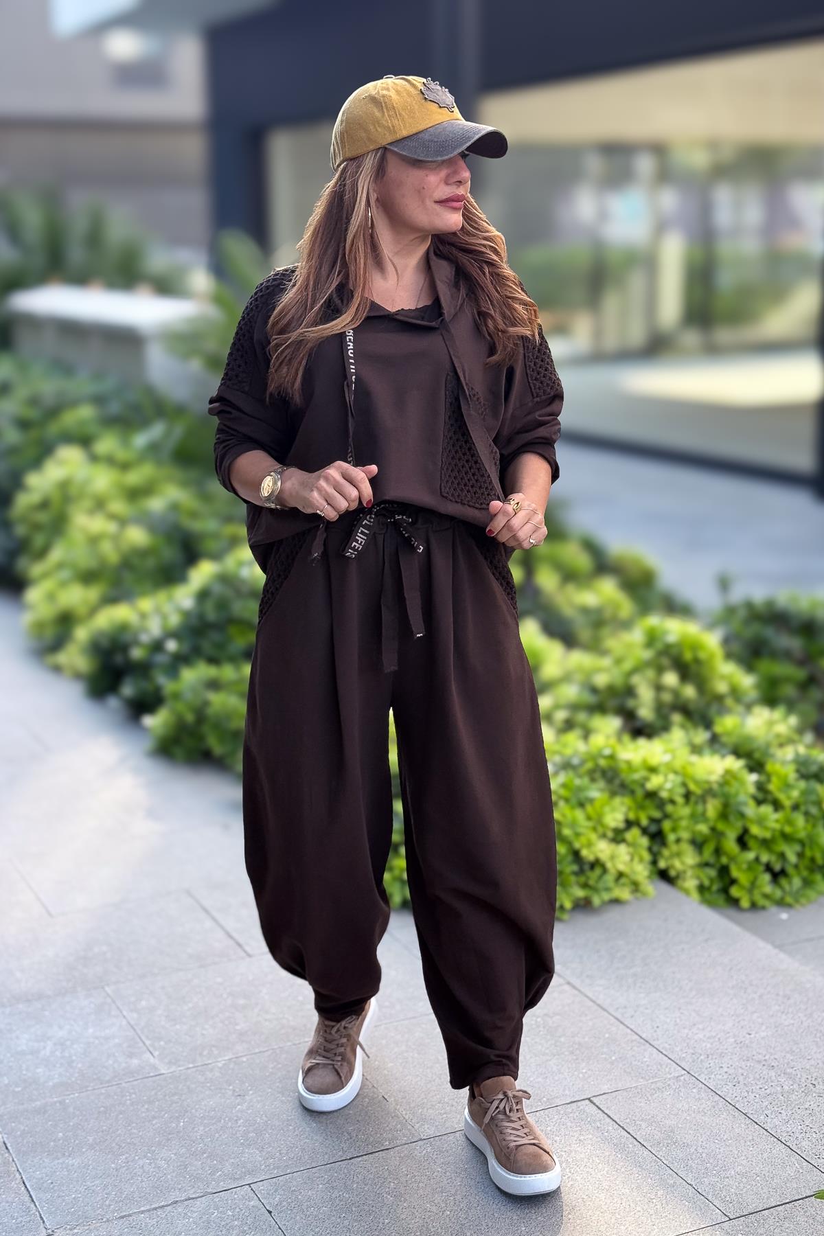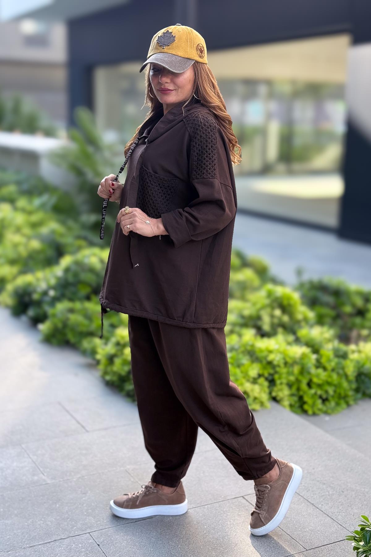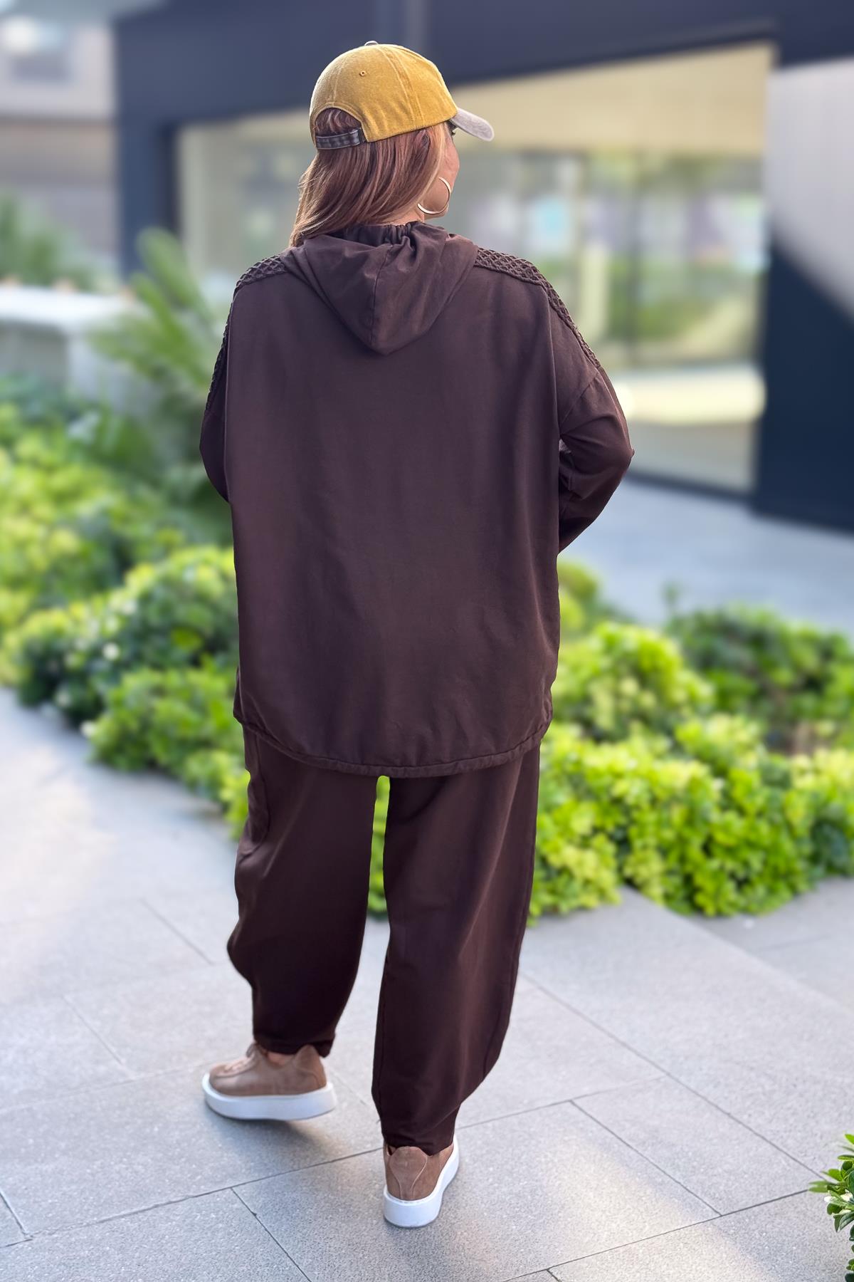 File Yama Detaylı Alt Üst Kapüşonlu Eşorfman Takım Kahverengi Renk