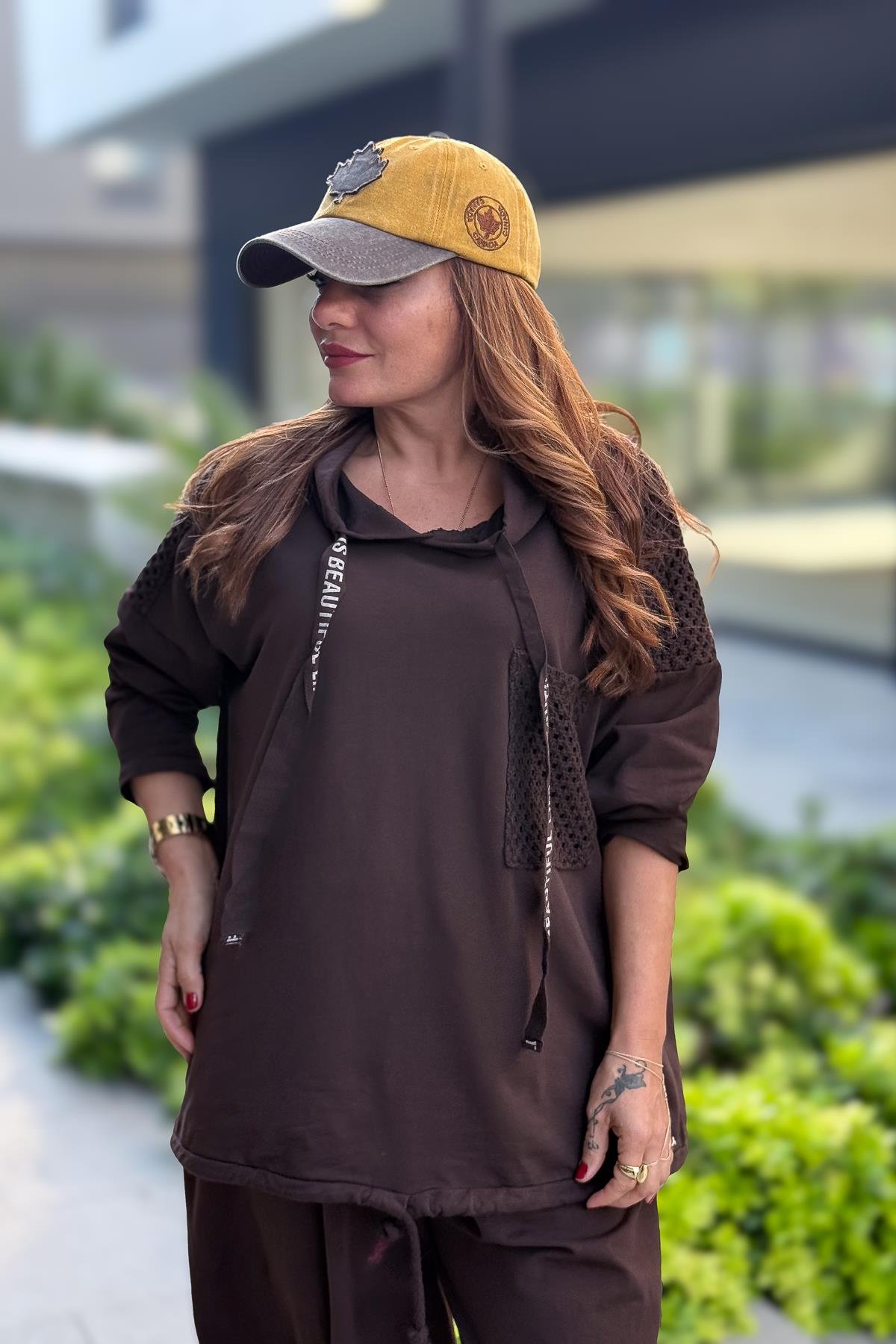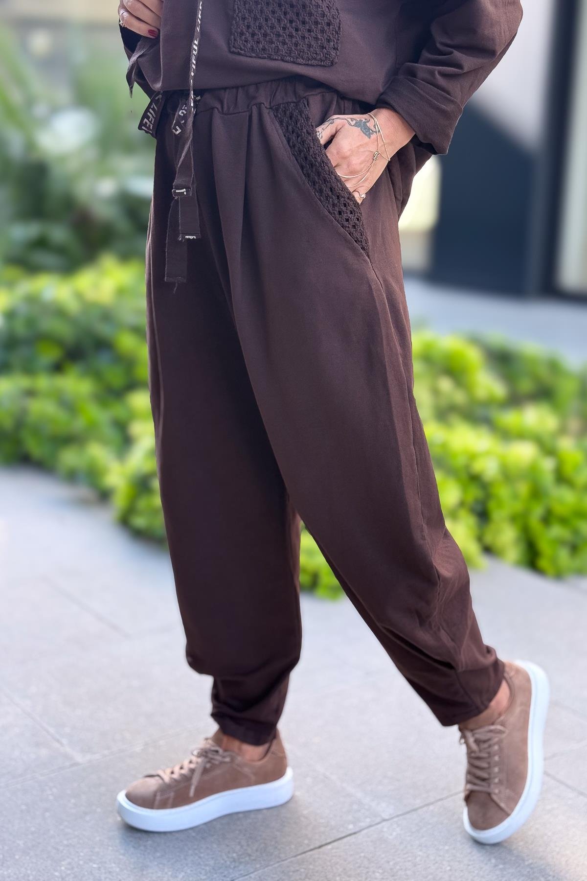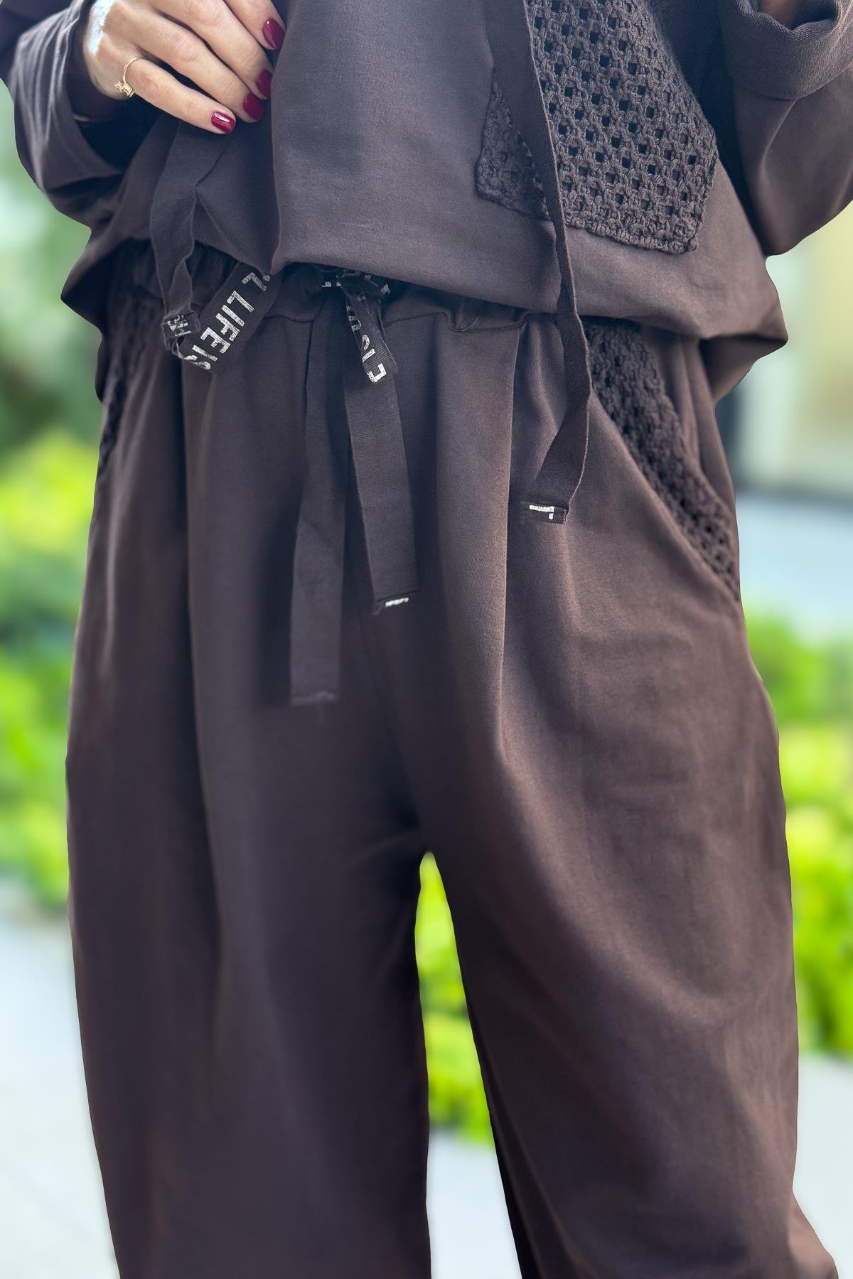 File Yama Detaylı Alt Üst Kapüşonlu Eşorfman Takım Kahverengi Renk
