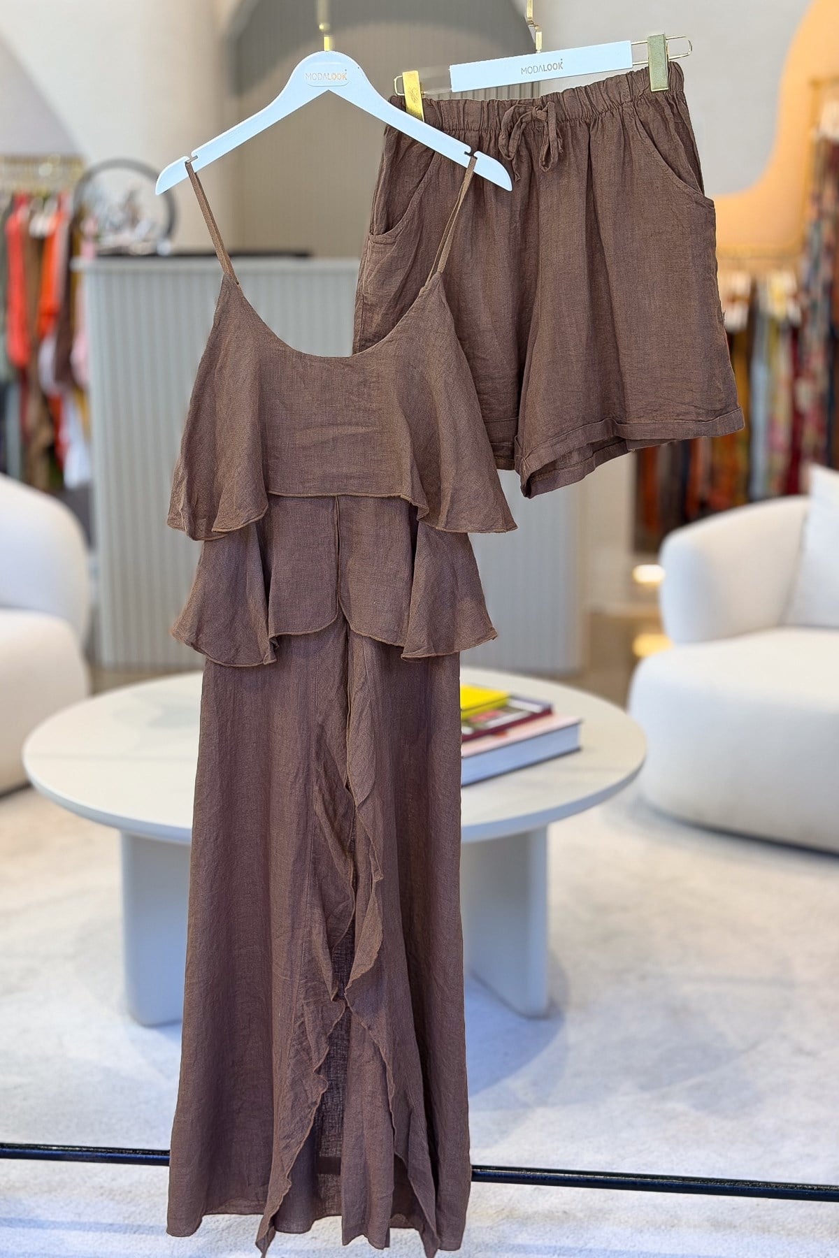 Fırfır Detaylı Alt Üst Şortlu Keten Takım Kahverengi Renk