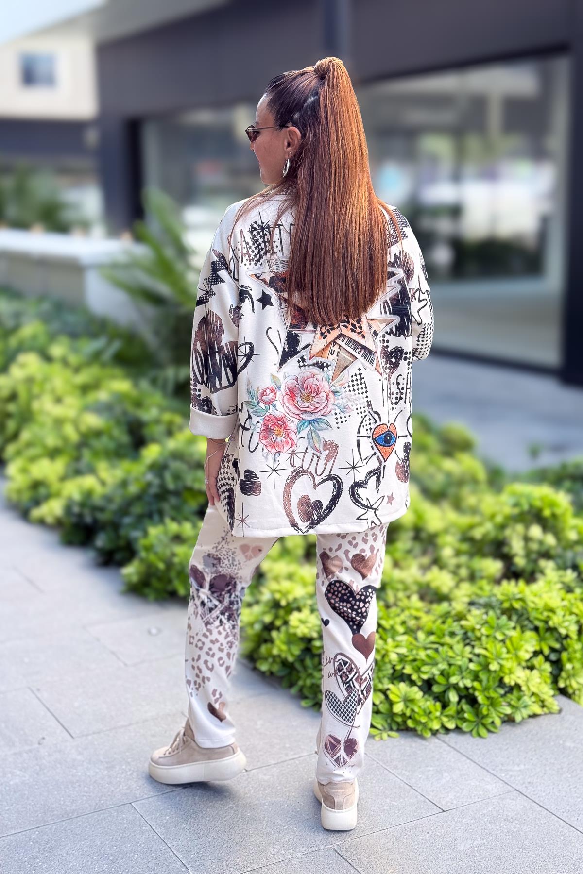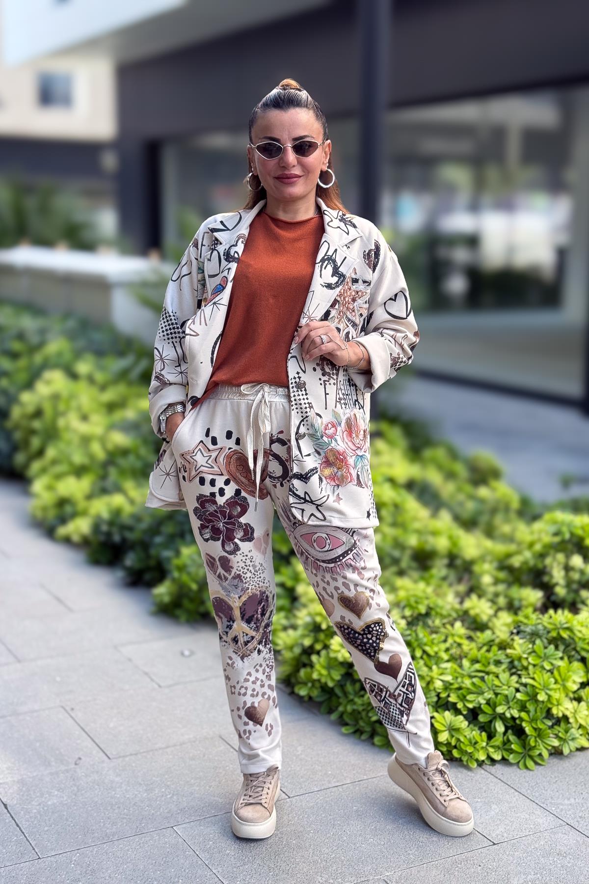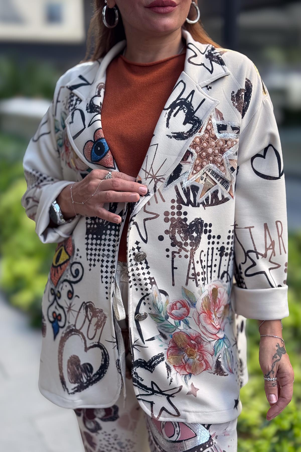Gold Desen Baskılı Modal Blazer Ceket Krem Renk