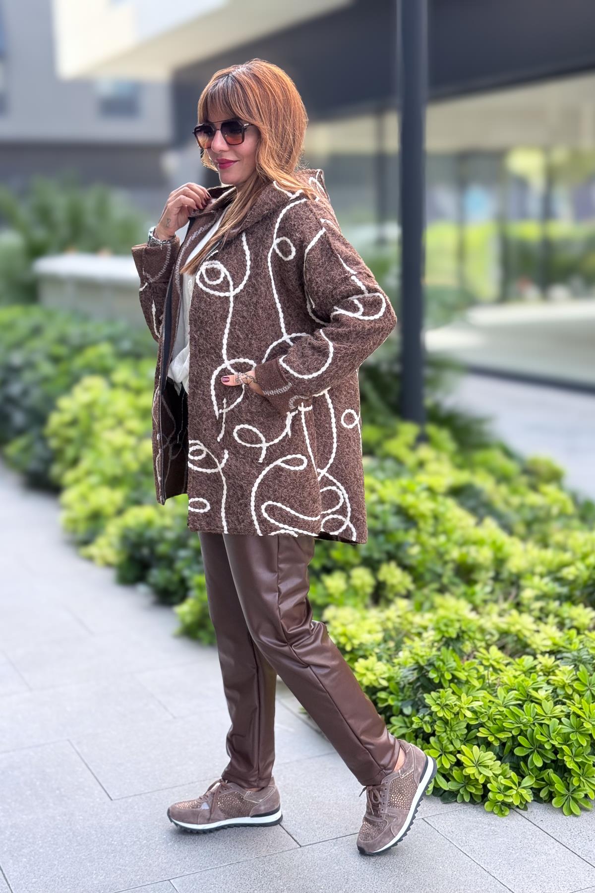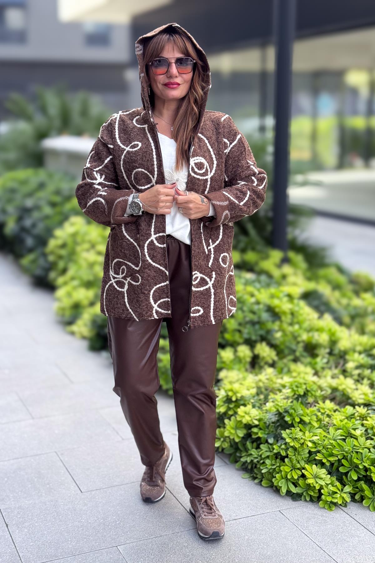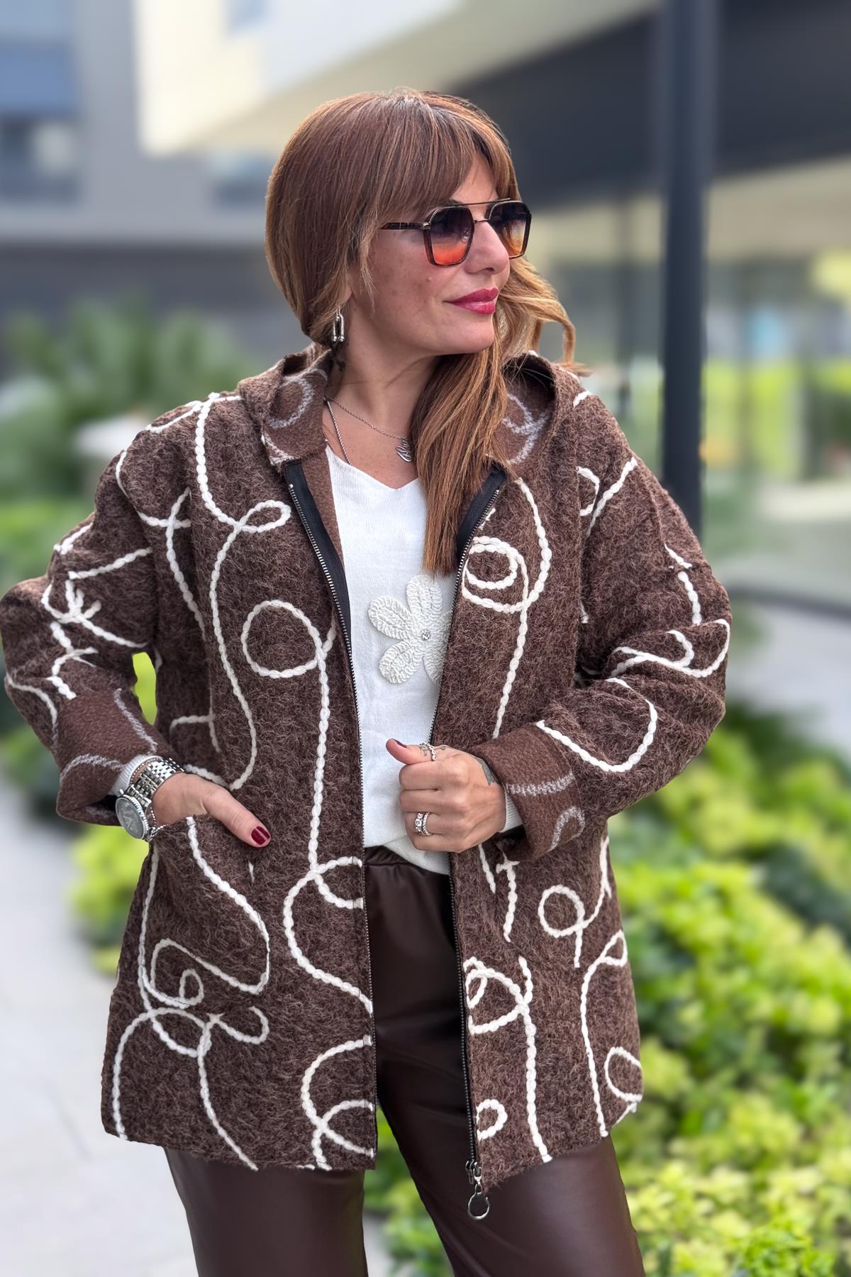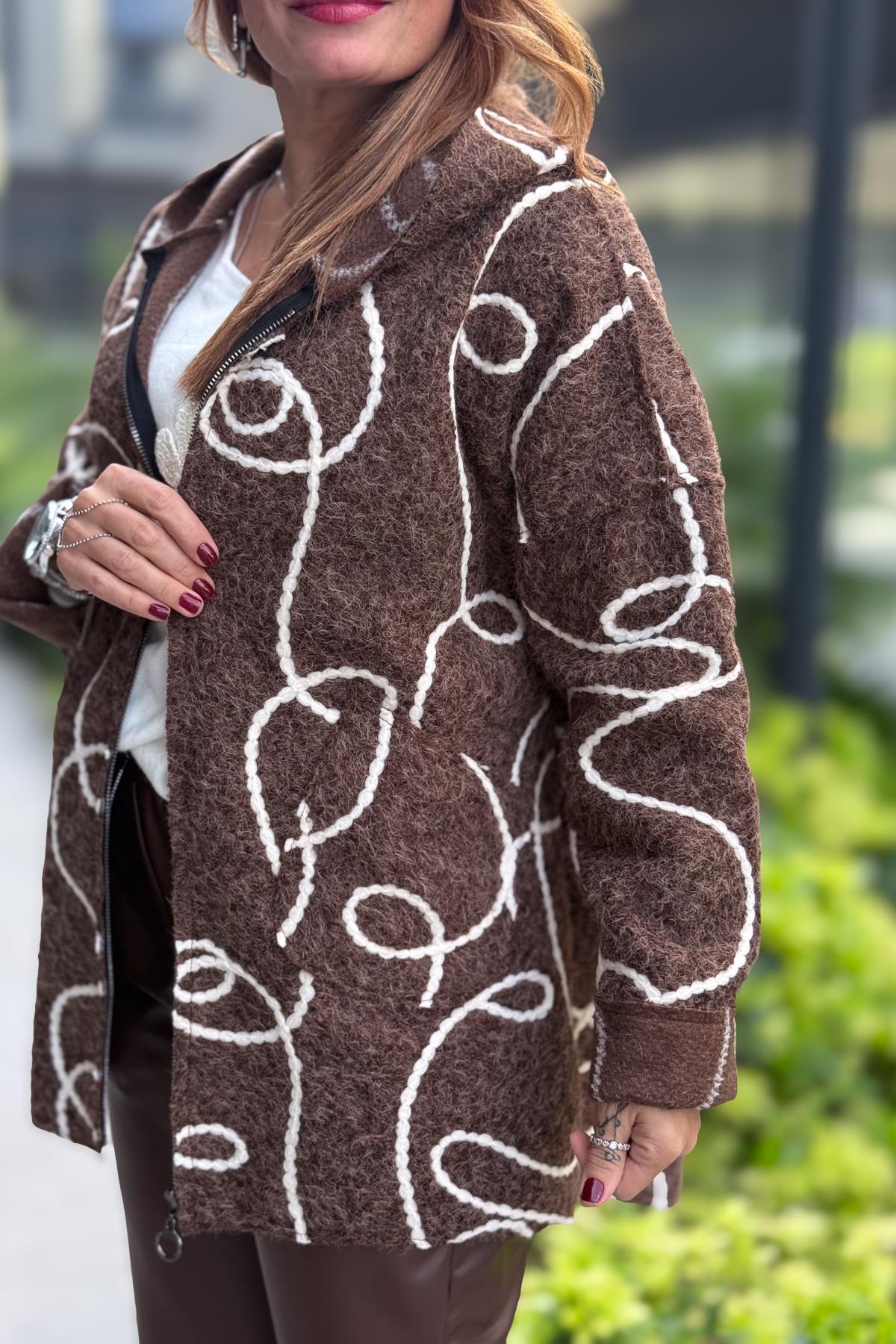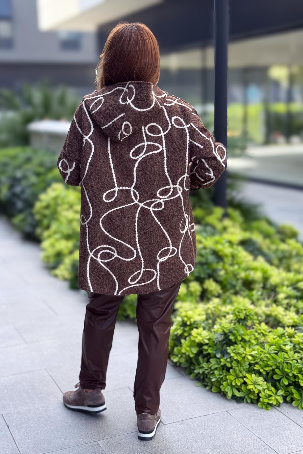 Halat Çizgiler Detaylı Keçe Kaban Kahverengi Renk