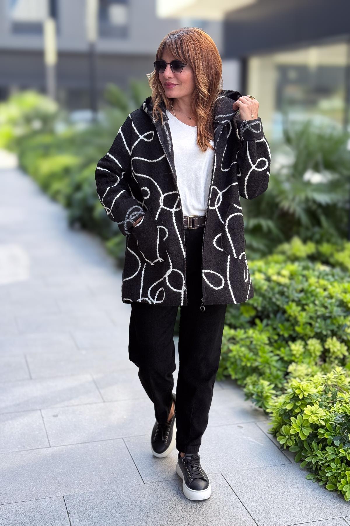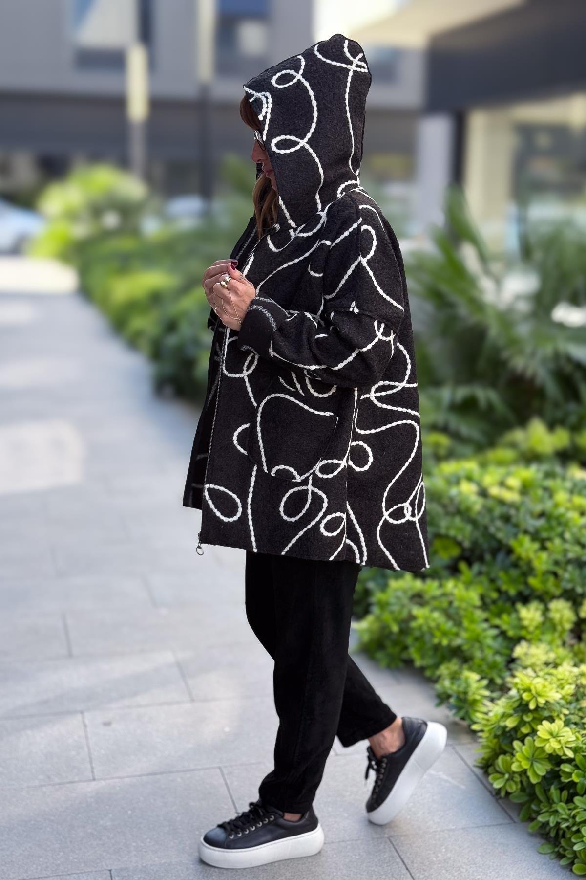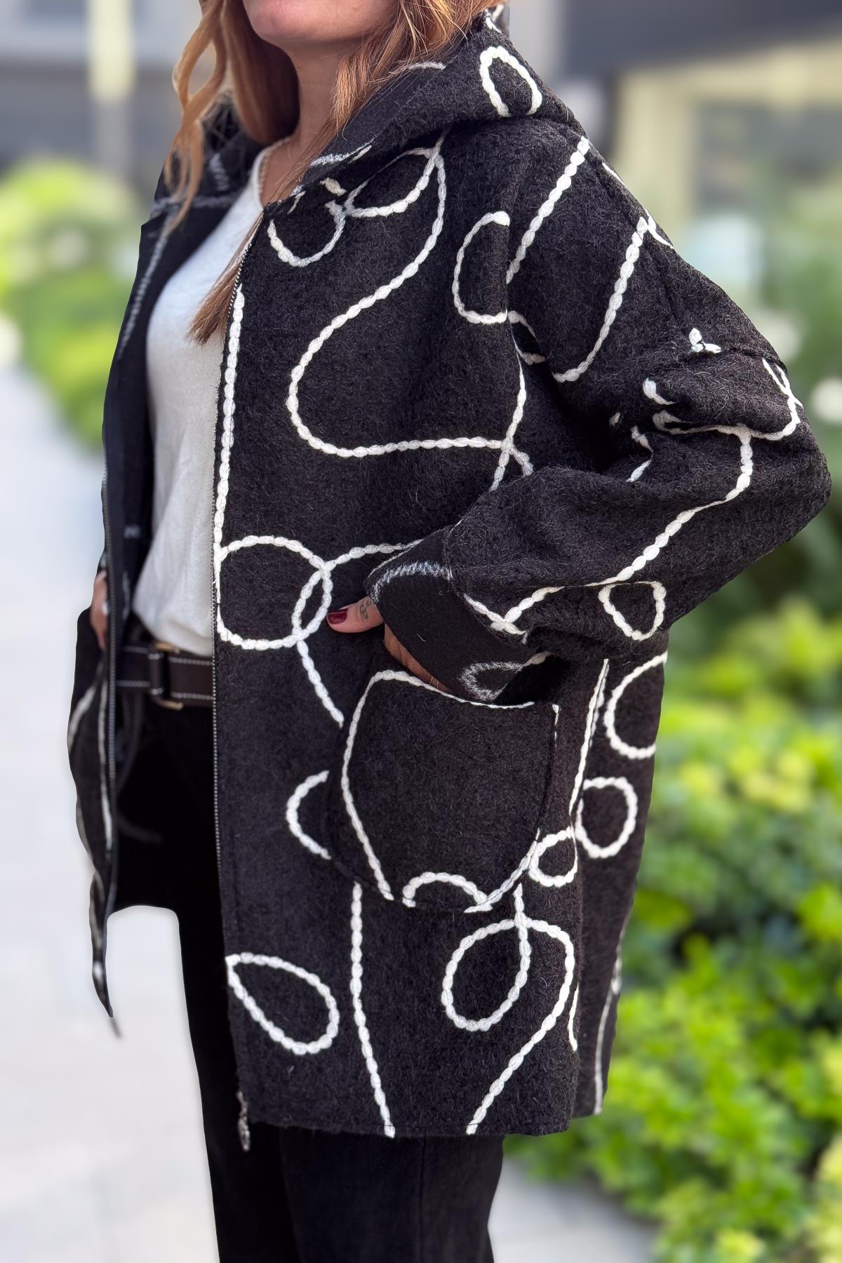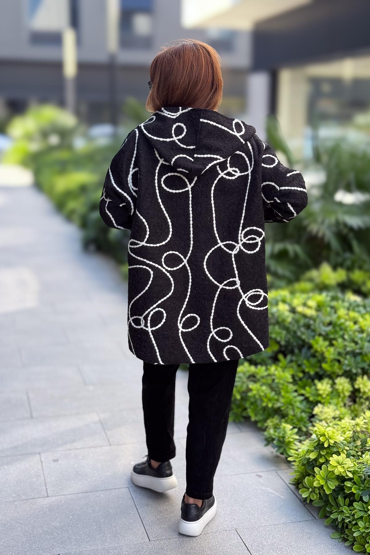 Halat Çizgiler Detaylı Keçe Kaban Siyah Renk
