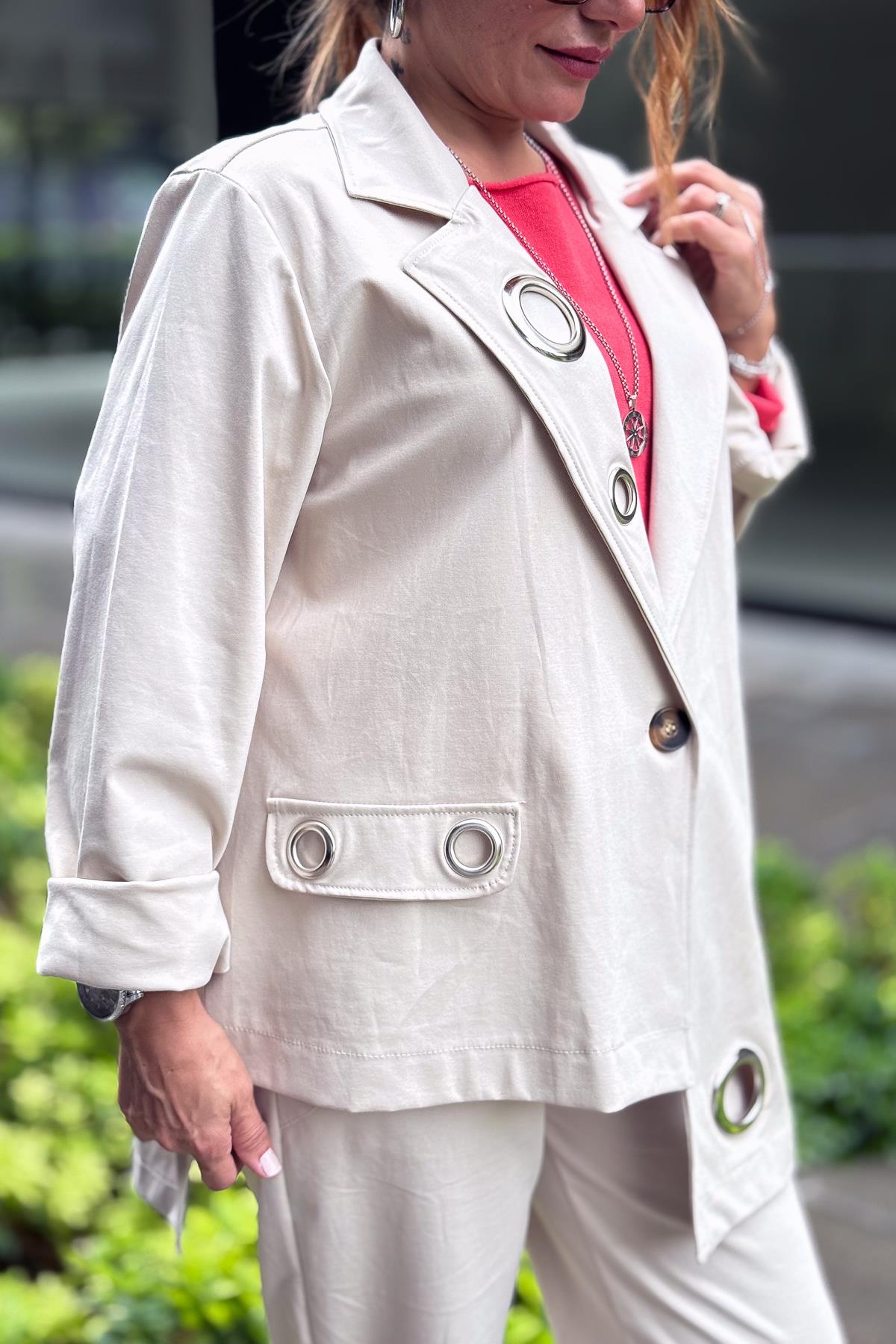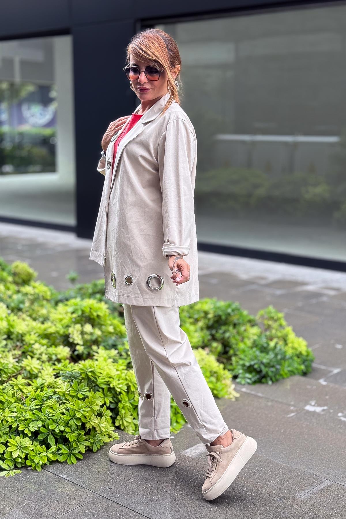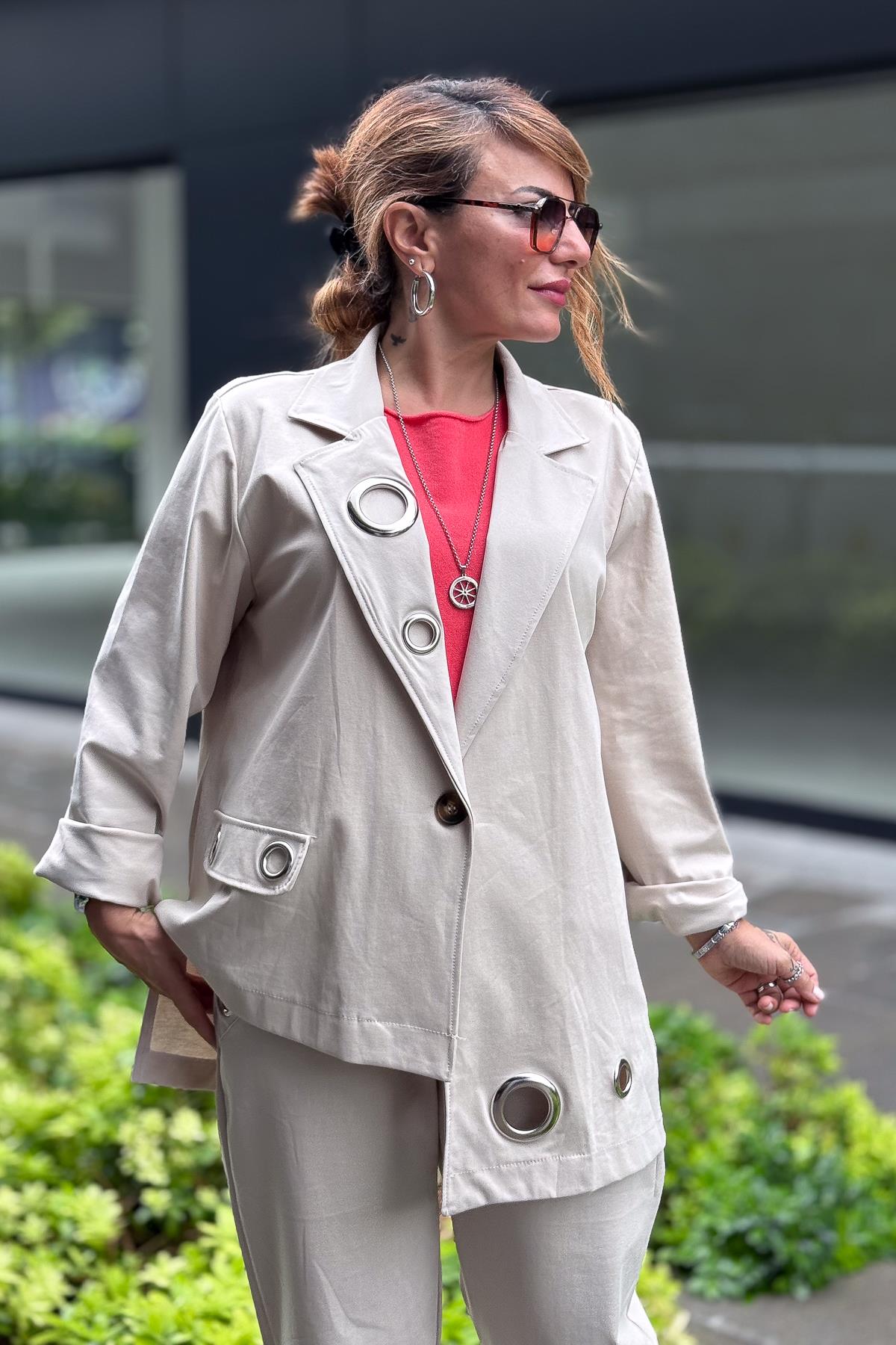 Halka Detaylı Asimetrik Kesim Ceketli Takım Bej Renk