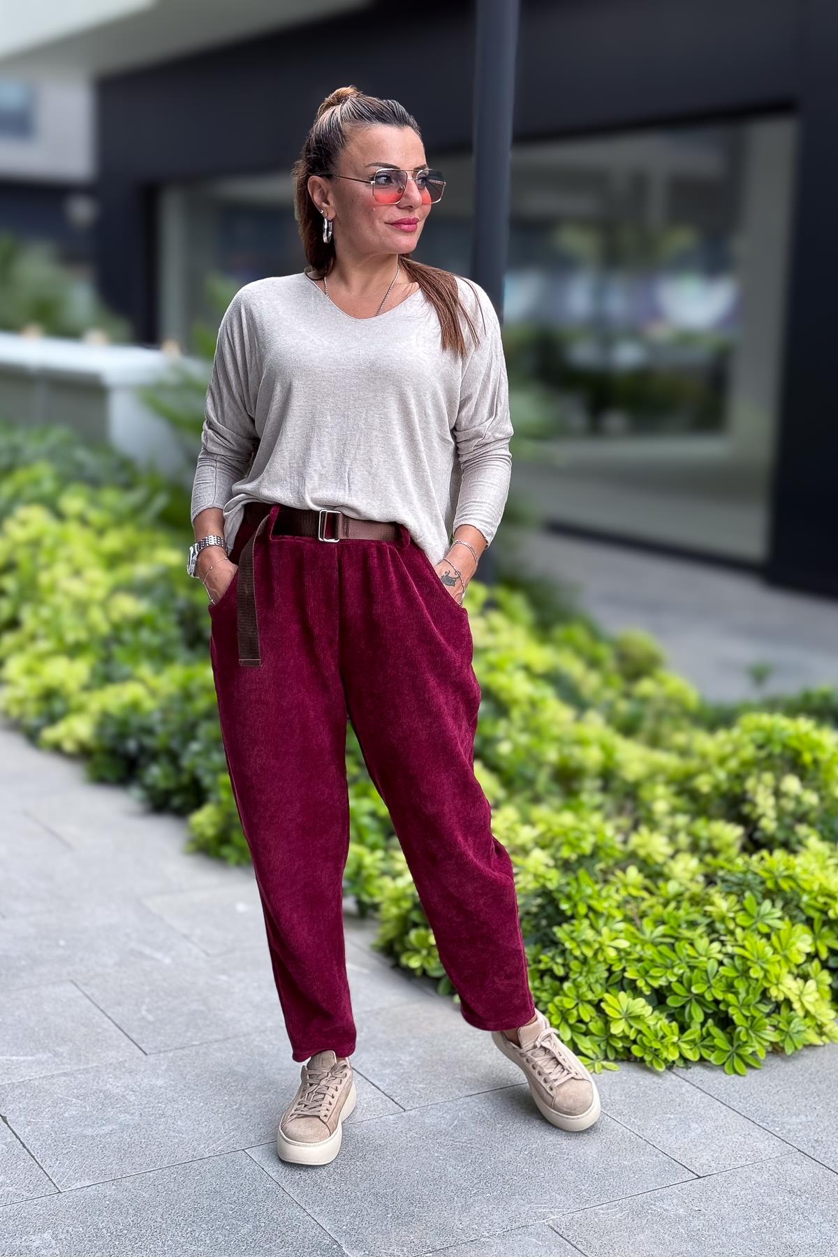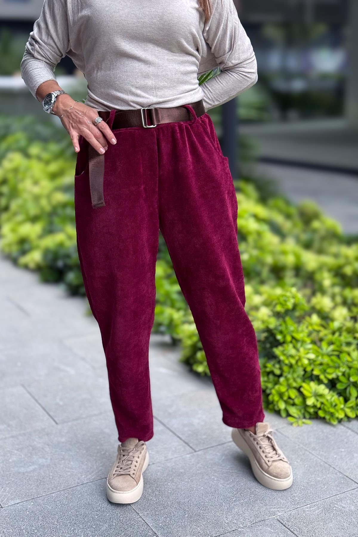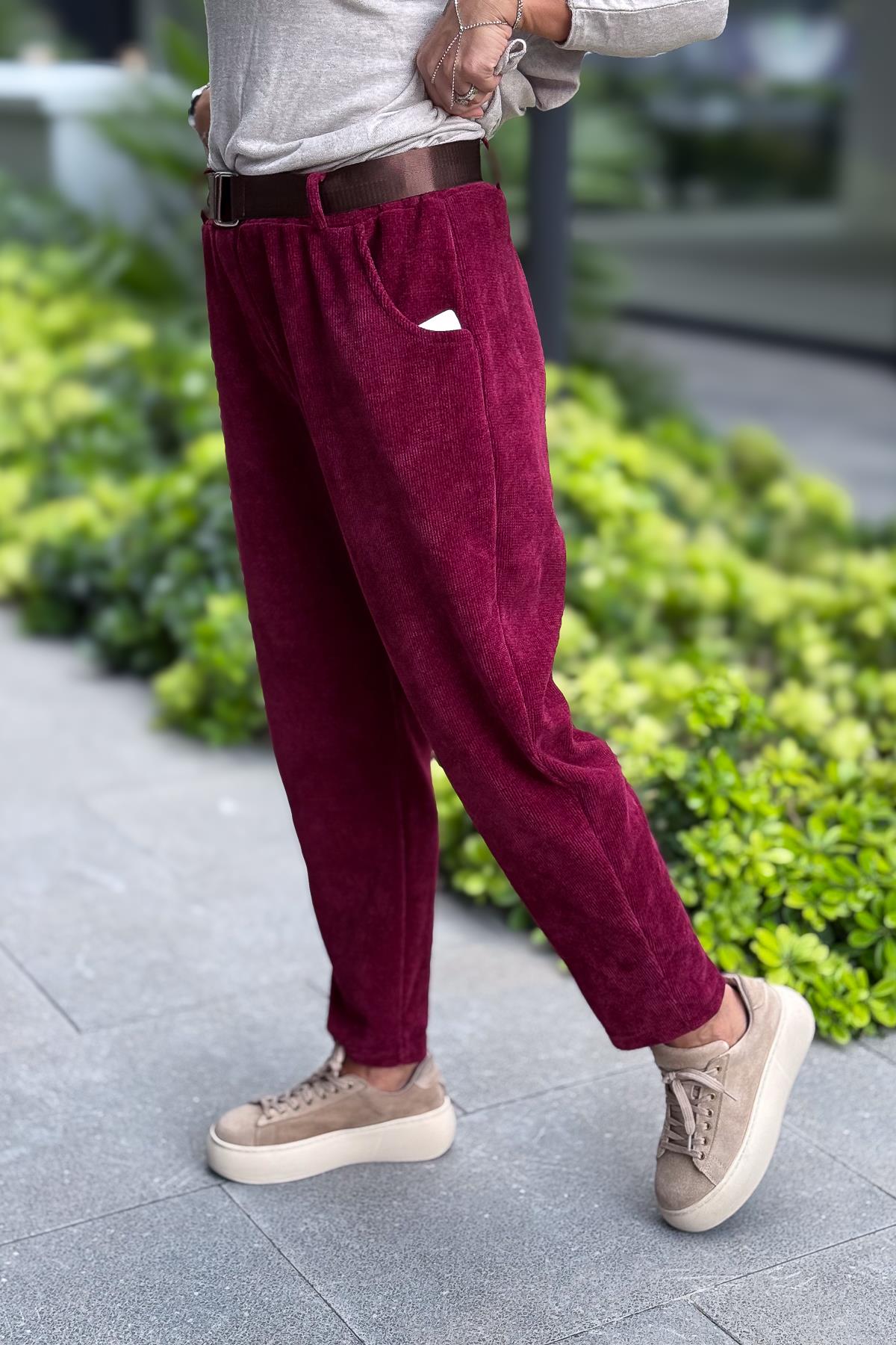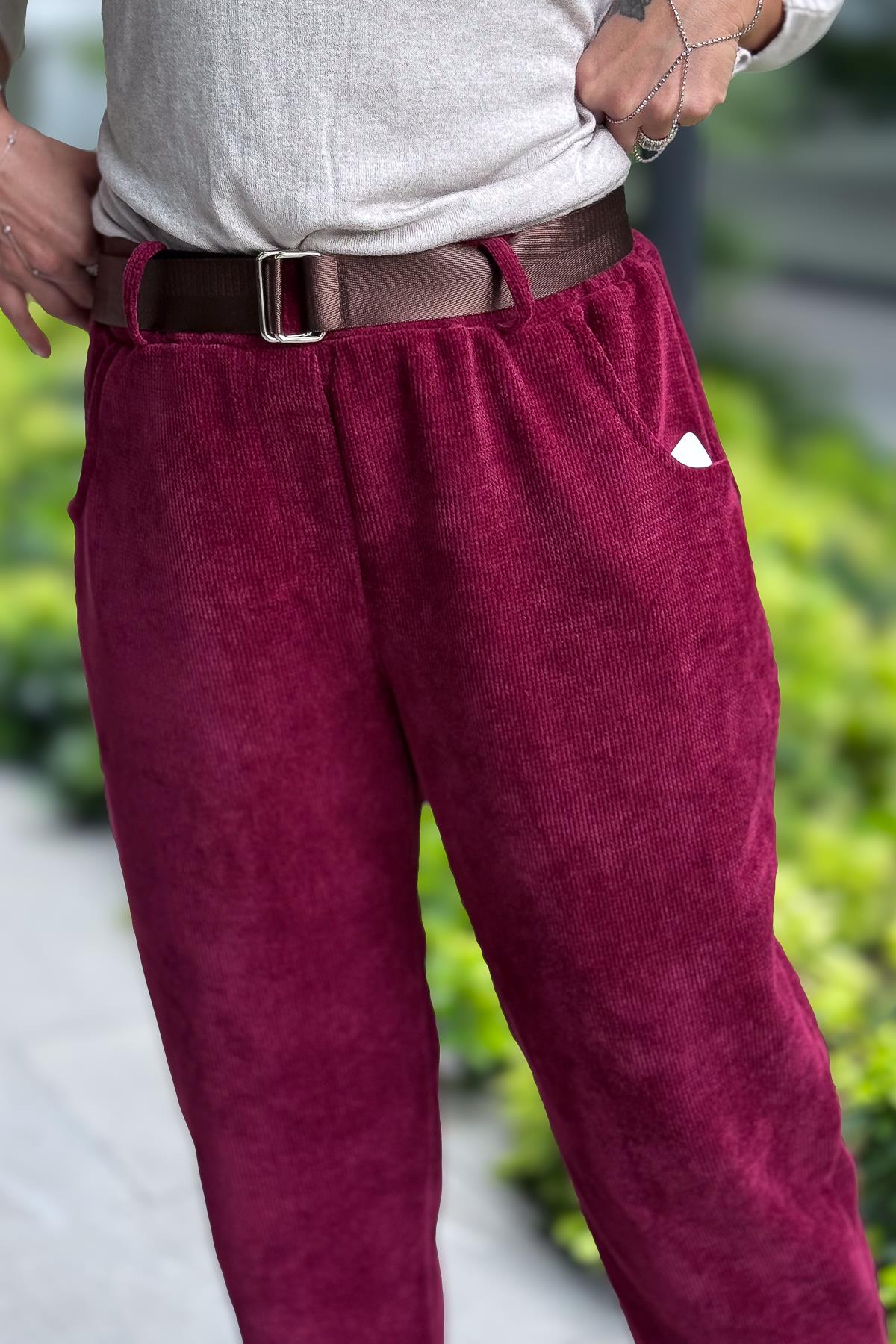 Havuç Paça Fitilli Kemerli Kadife Pantolon Bordo Renk