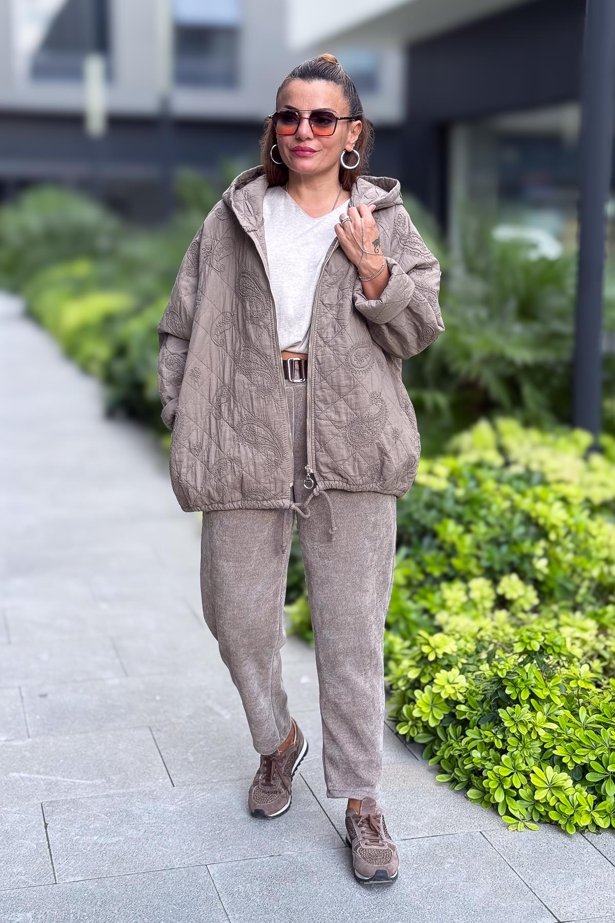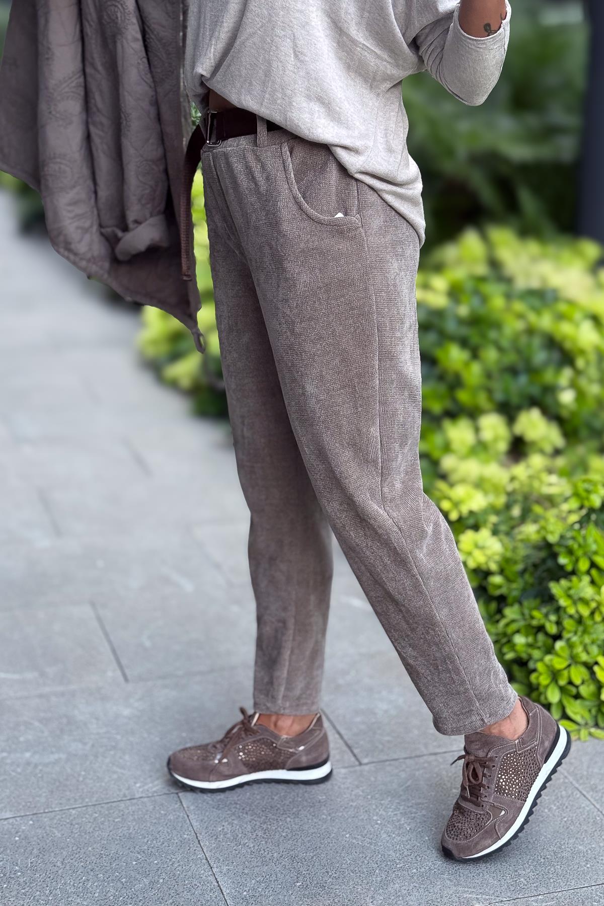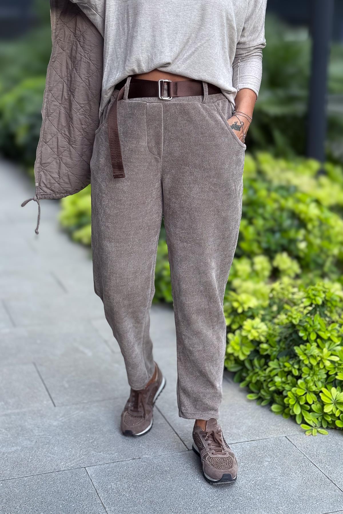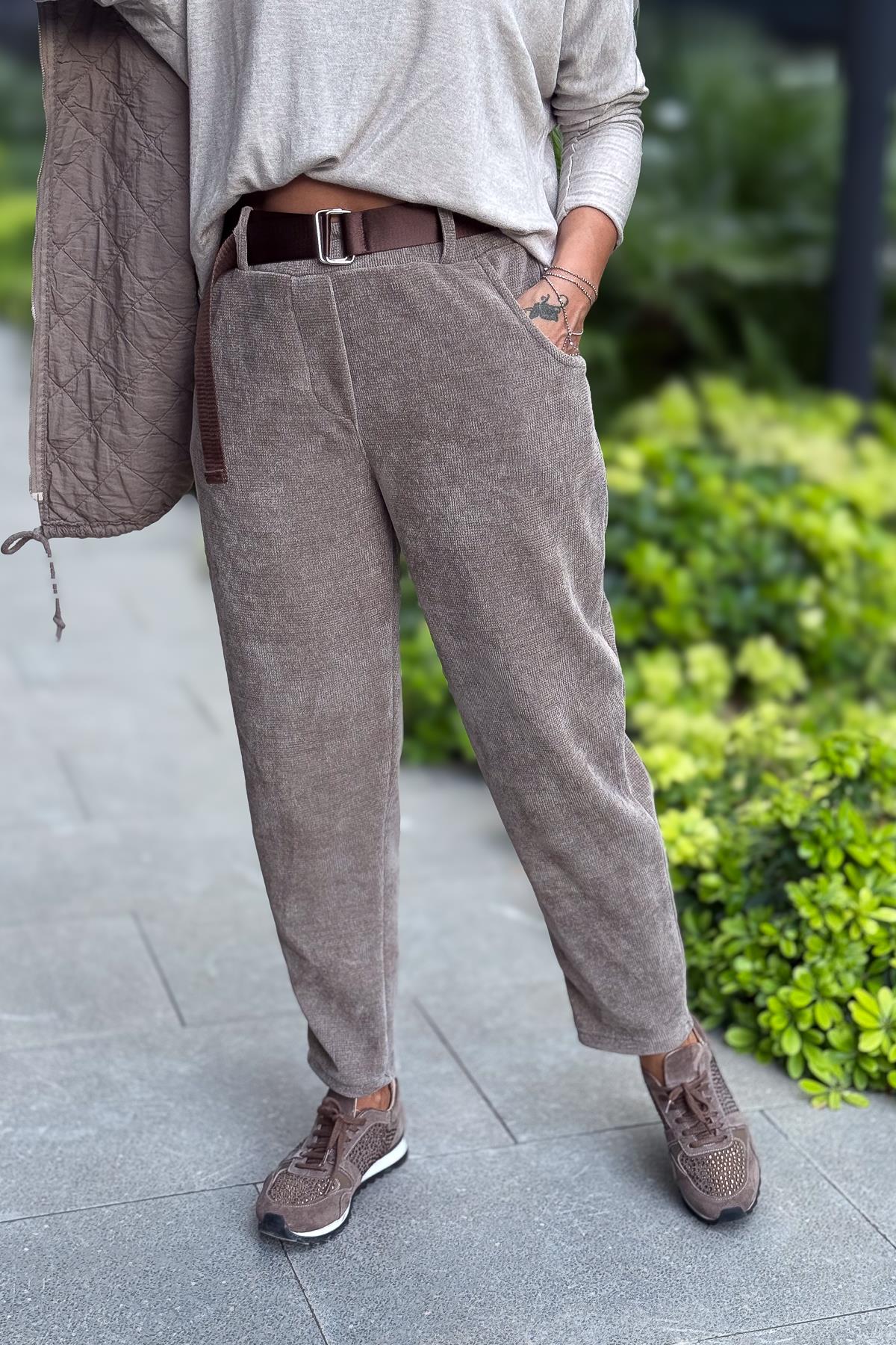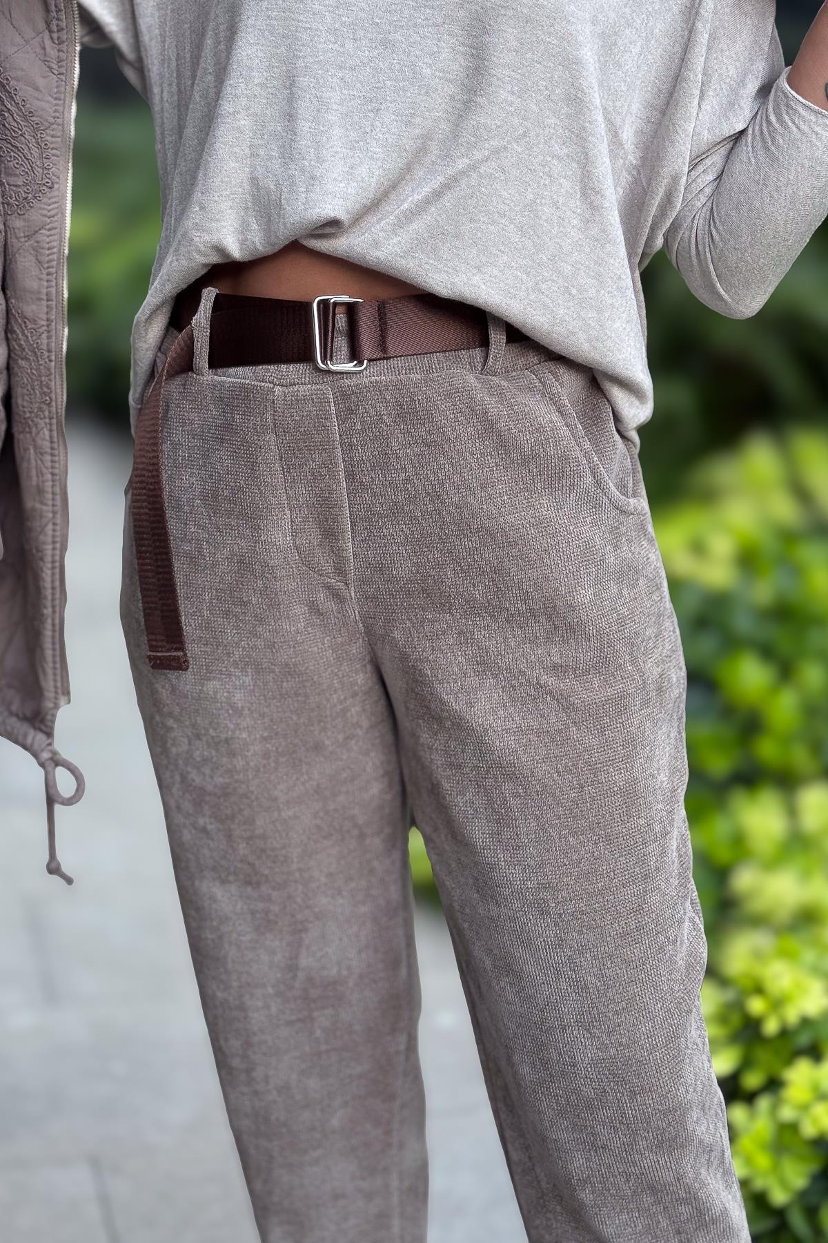 Havuç Paça Fitilli Kemerli Kadife Pantolon Vizon Renk