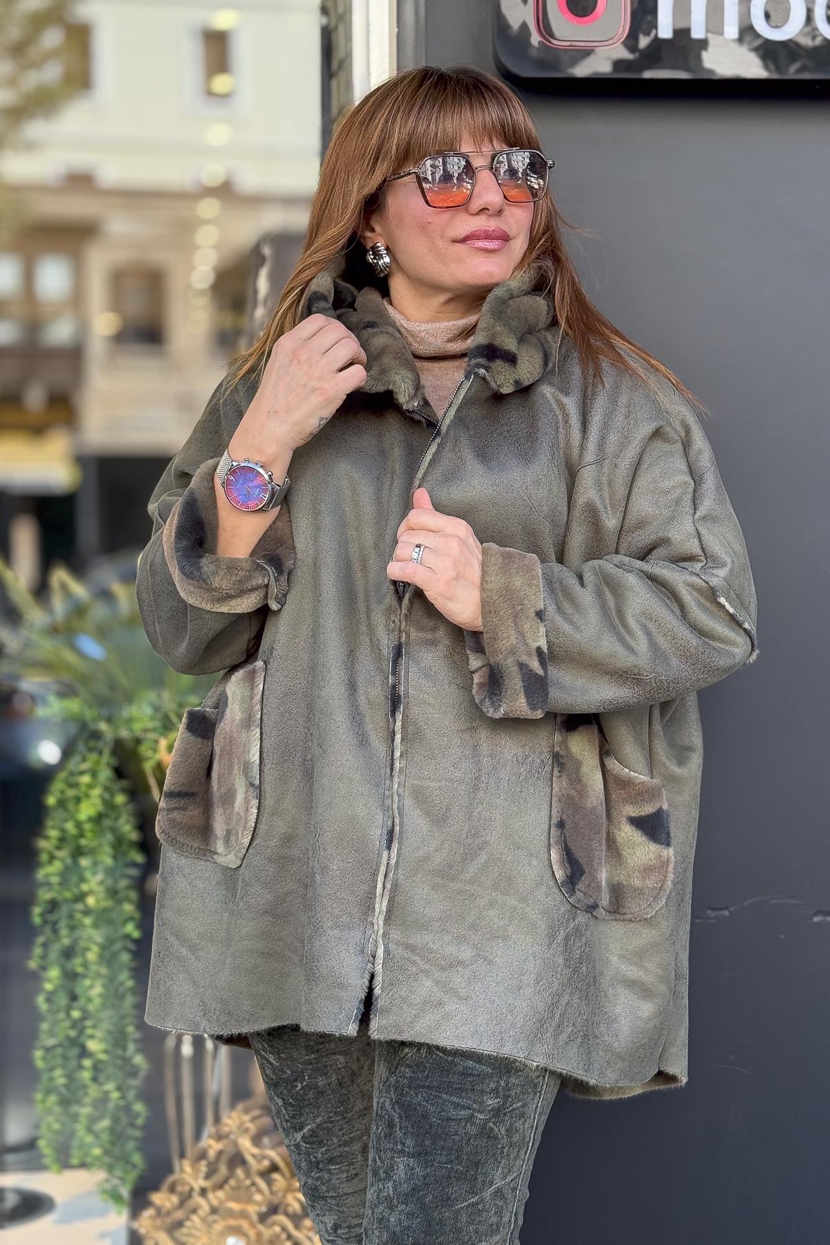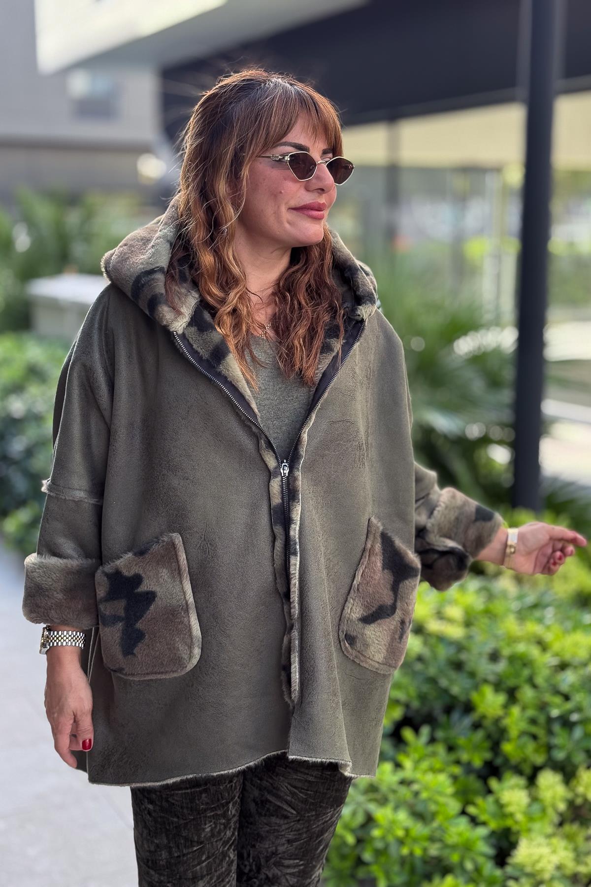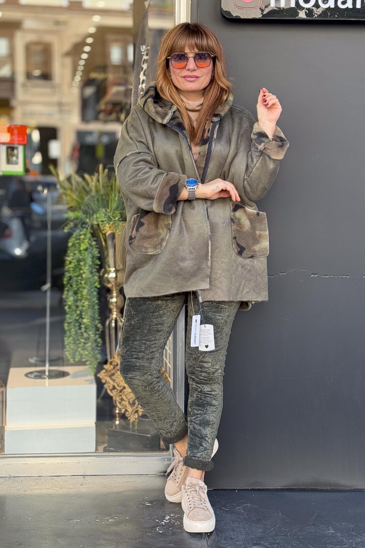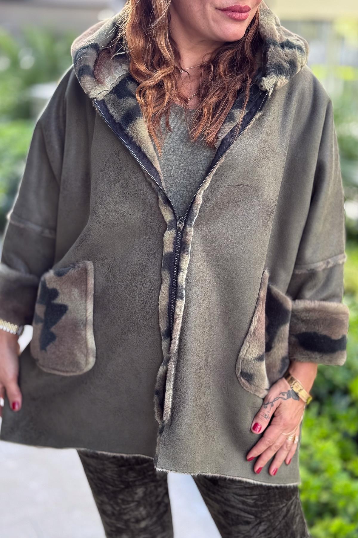 İçi Kamuflaj Desenli Güderi Kaban Haki Renk