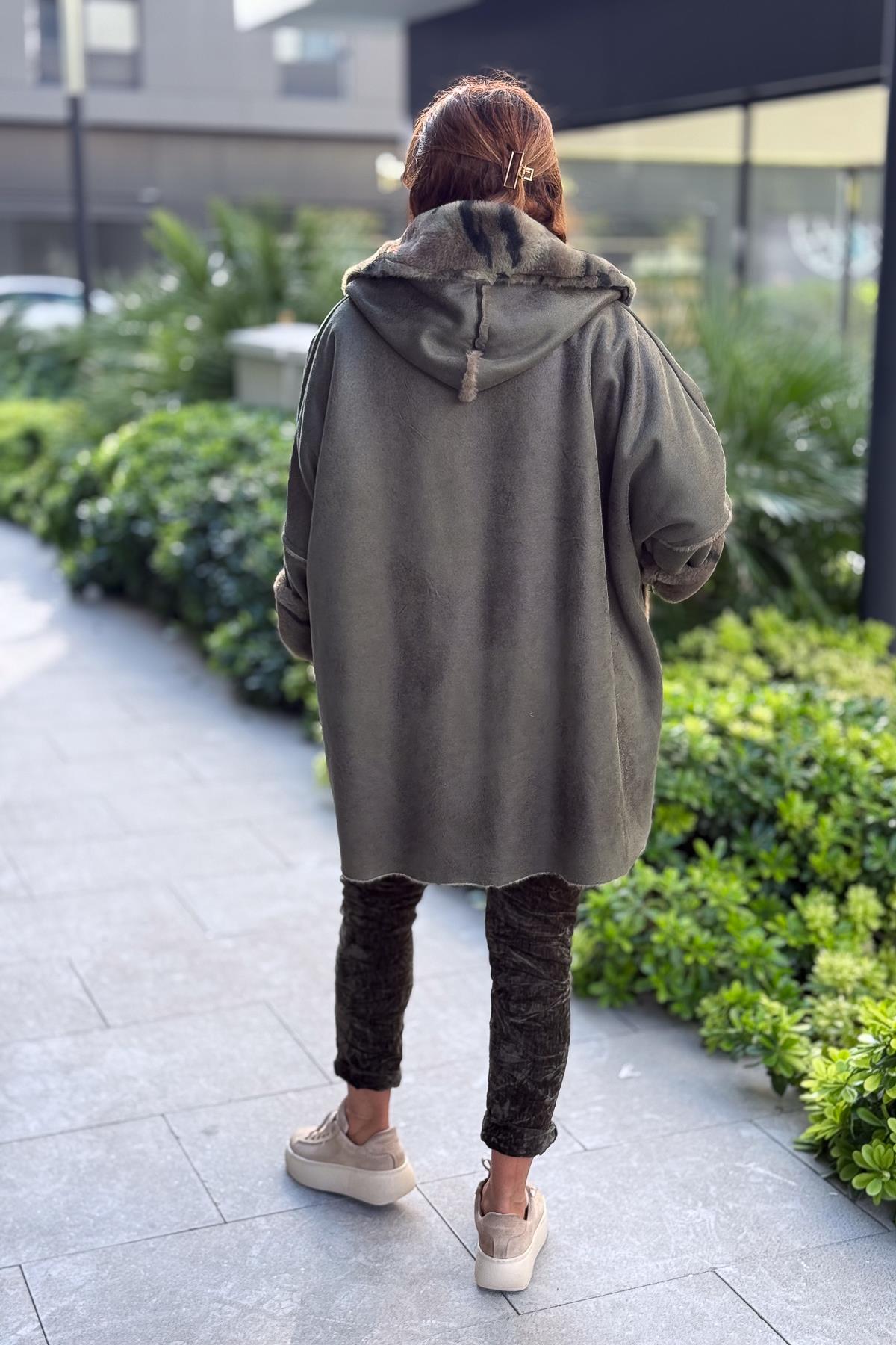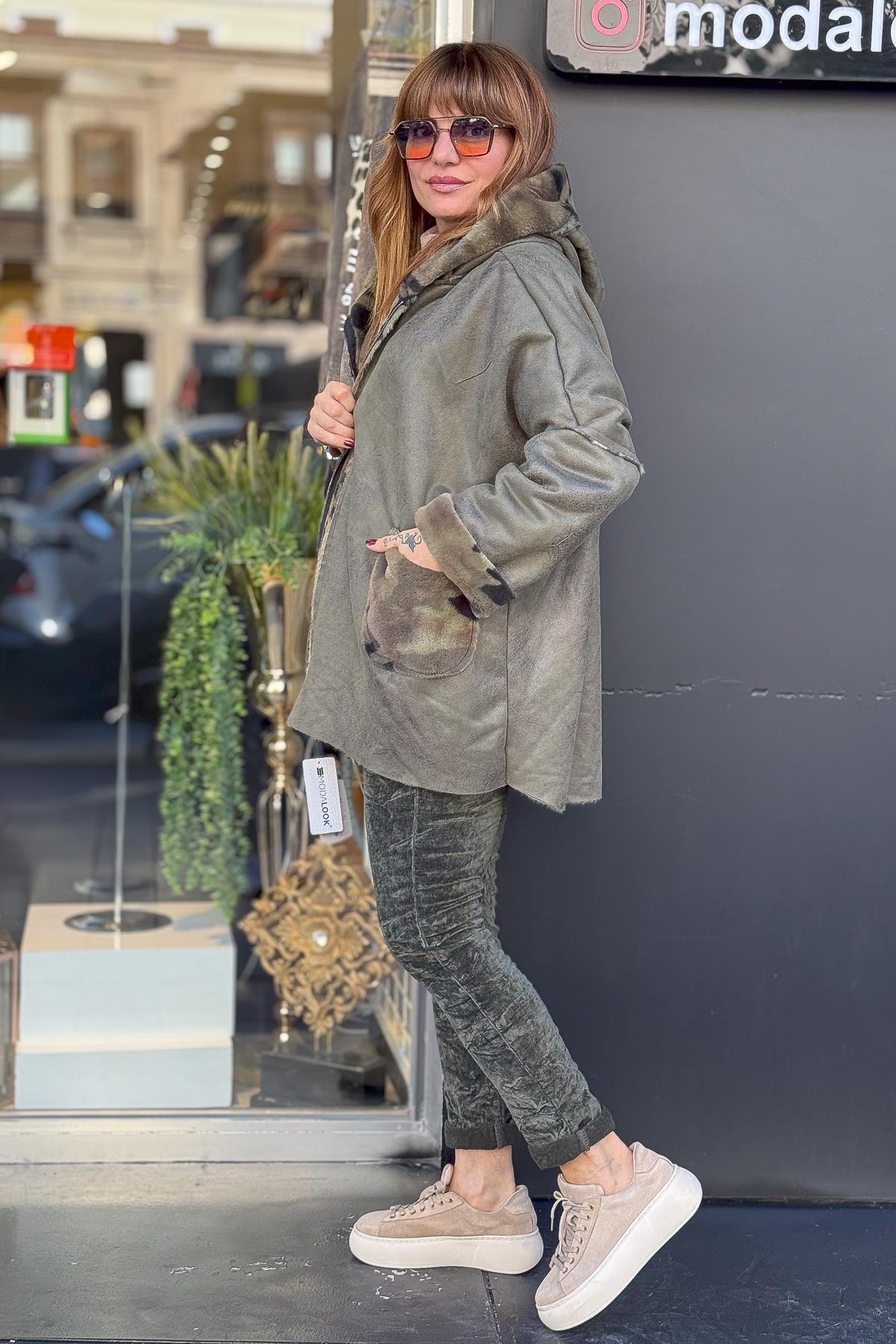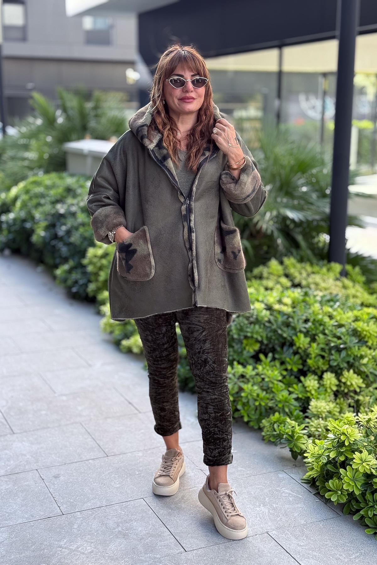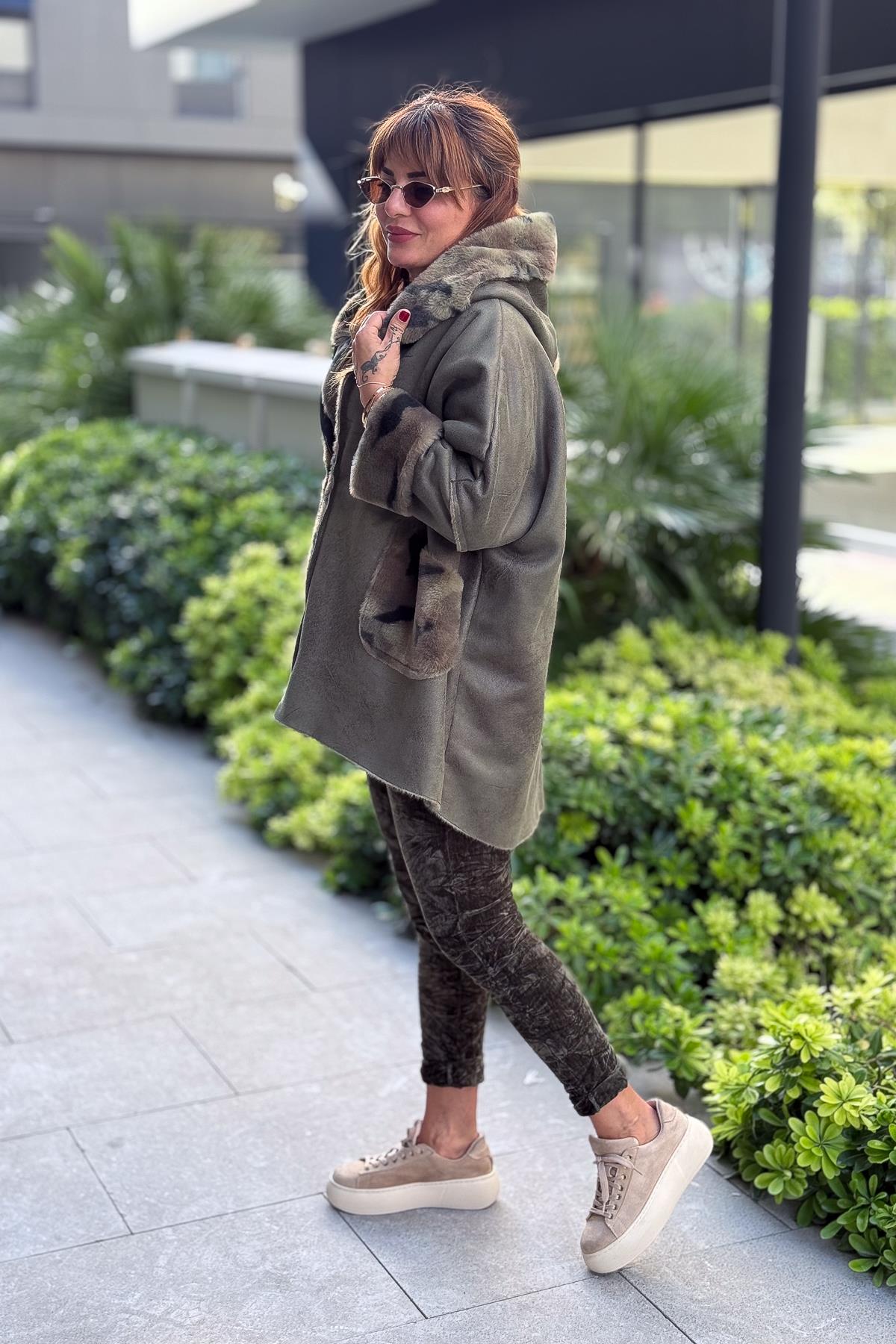 İçi Kamuflaj Desenli Güderi Kaban Haki Renk