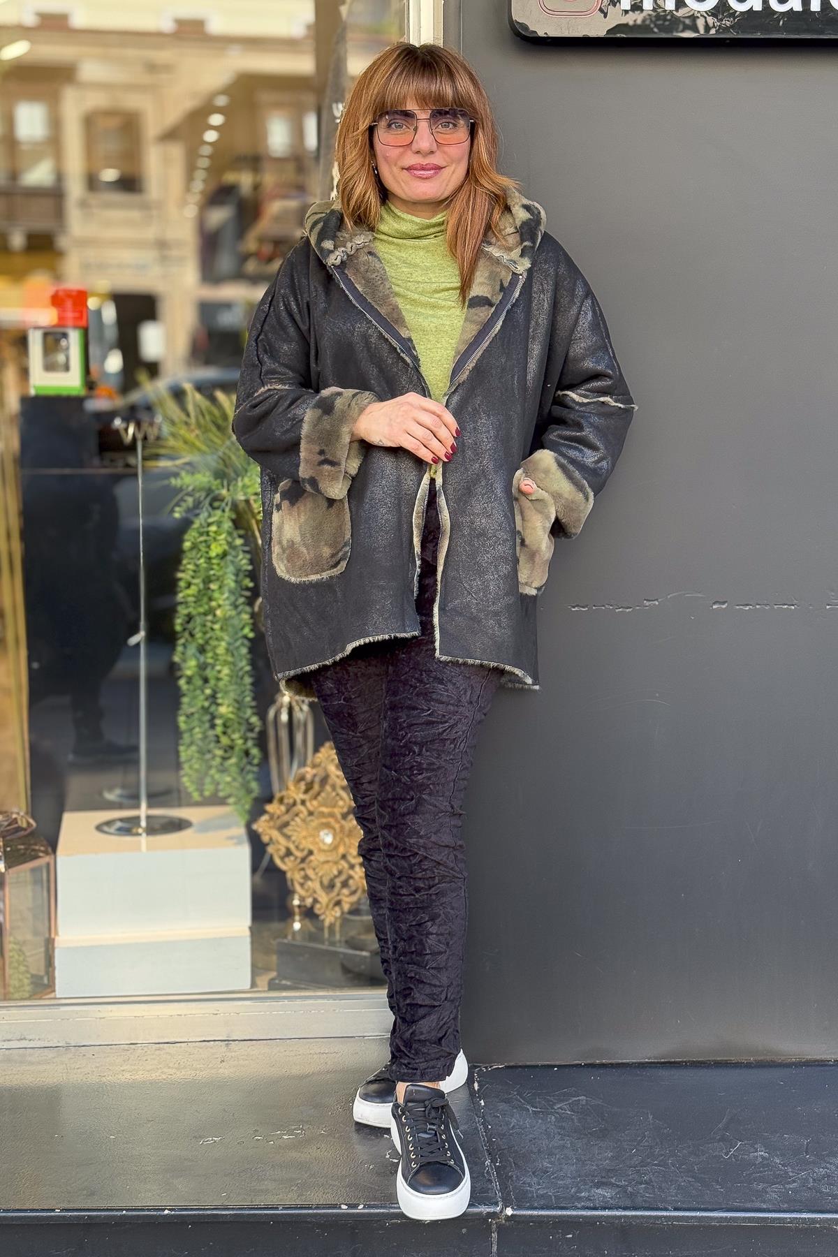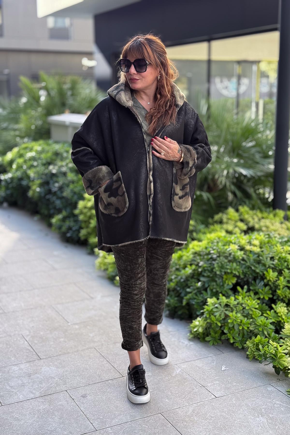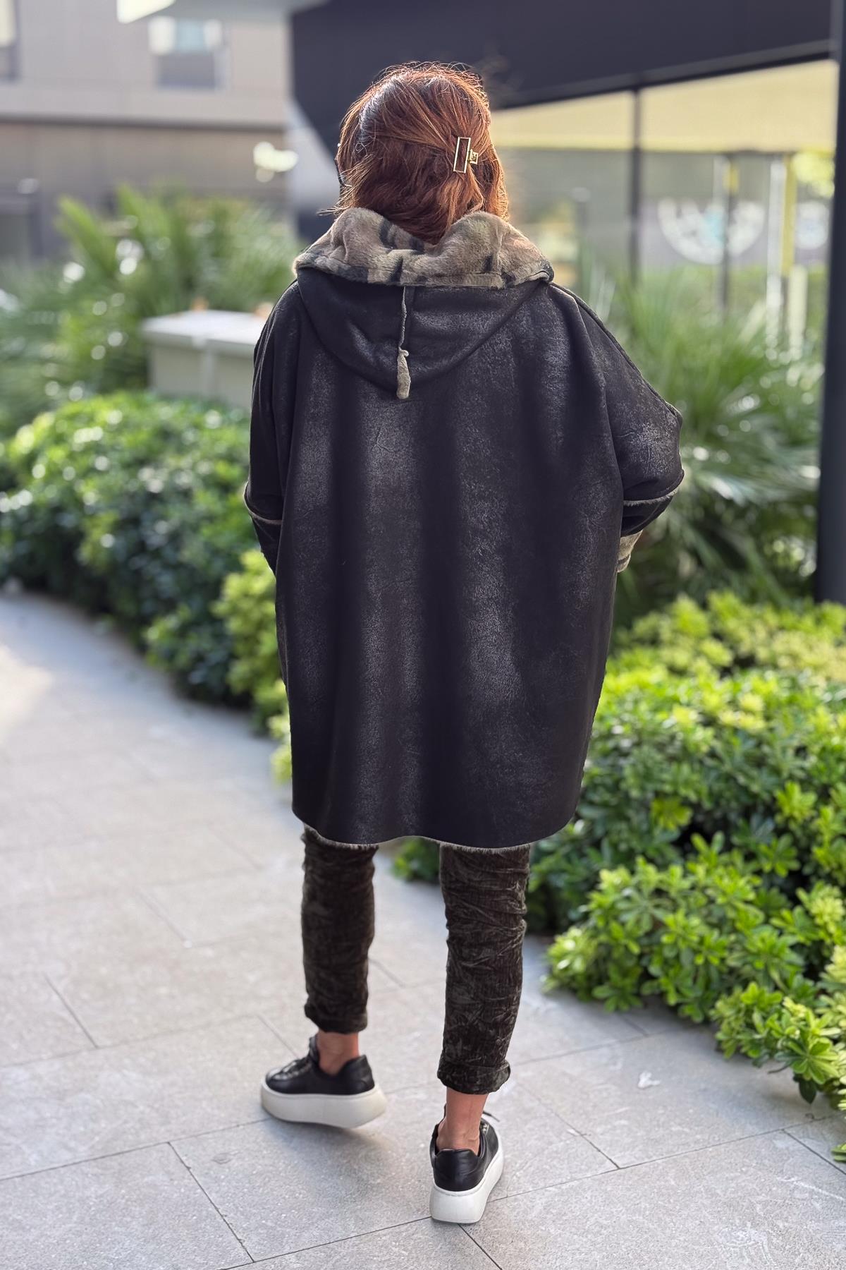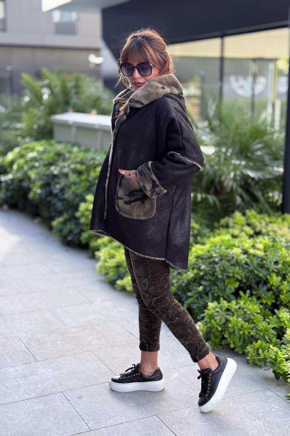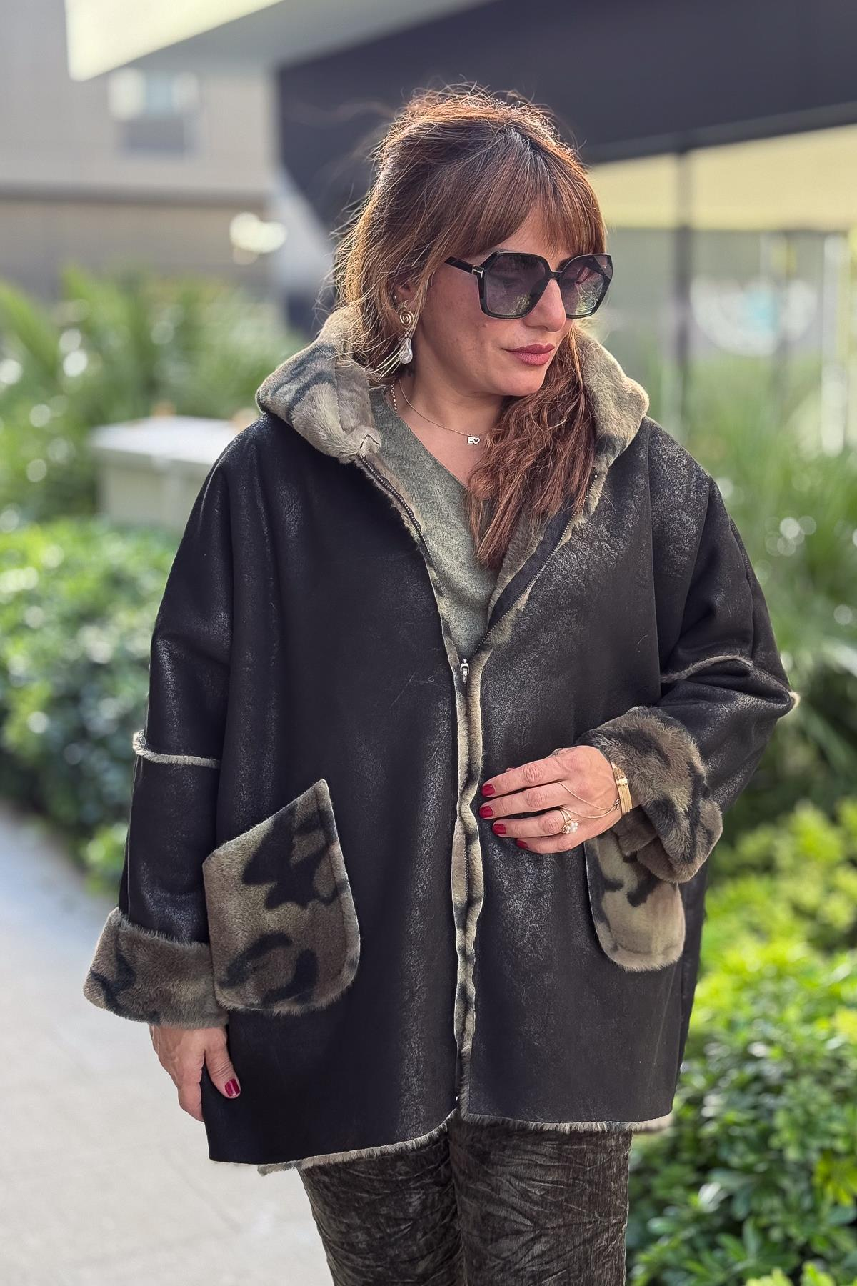 İçi Kamuflaj Desenli Güderi Kaban Siyah Renk