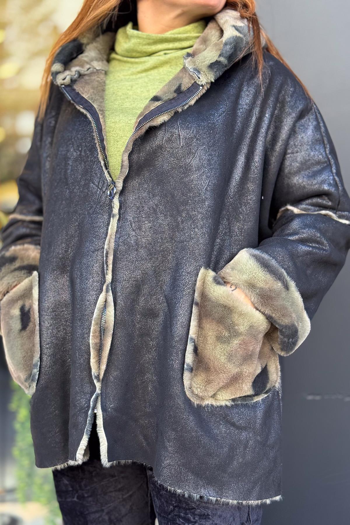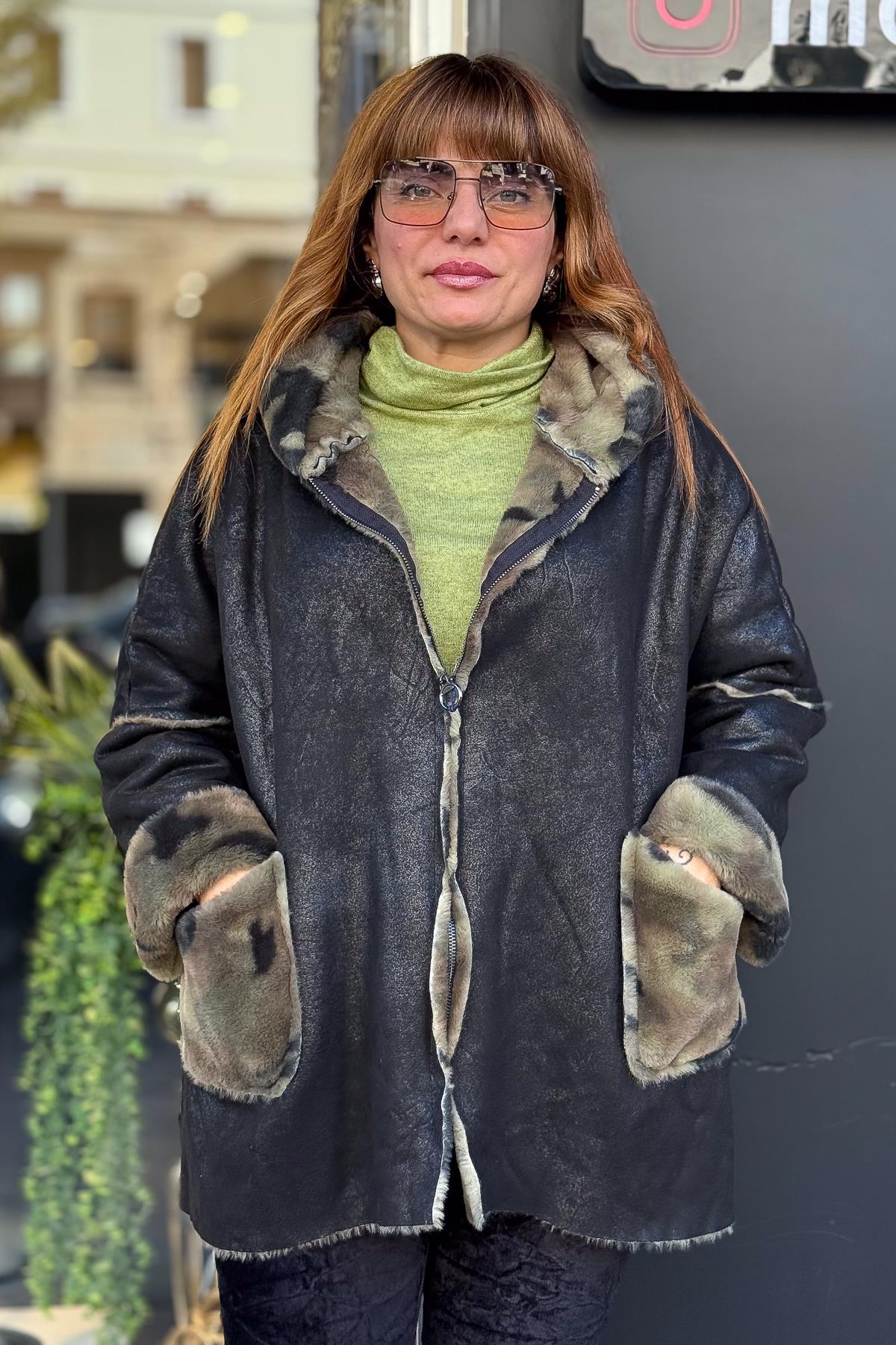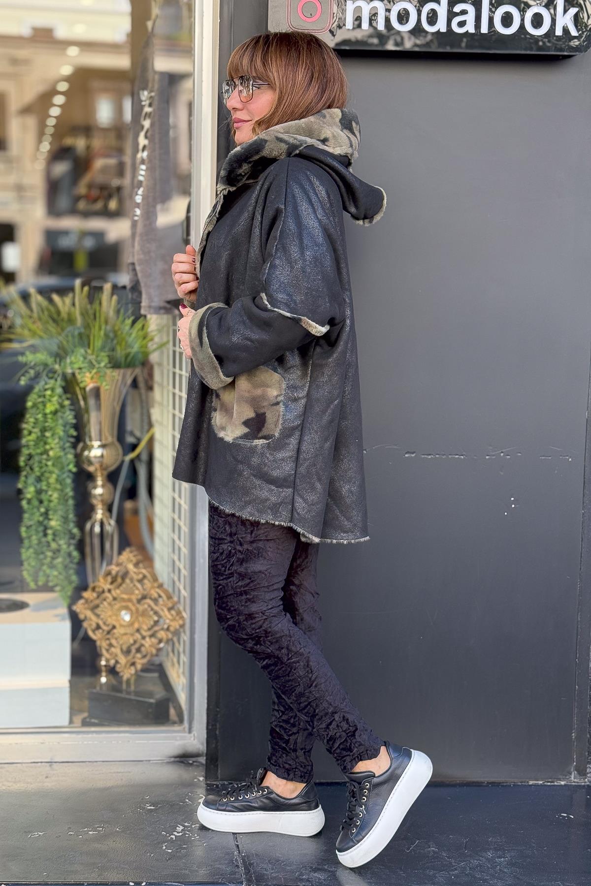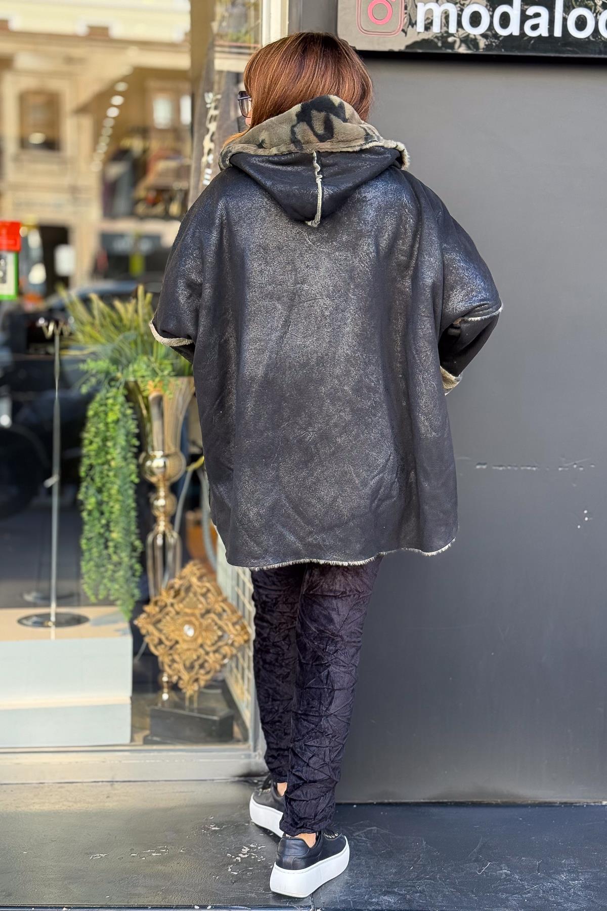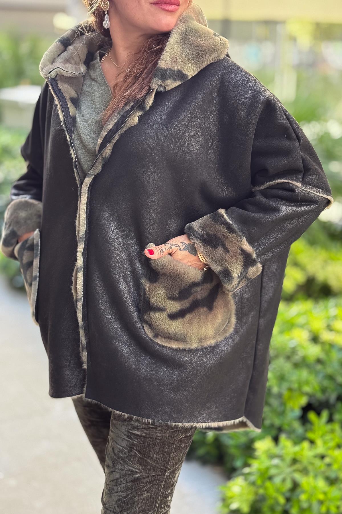 İçi Kamuflaj Desenli Güderi Kaban Siyah Renk