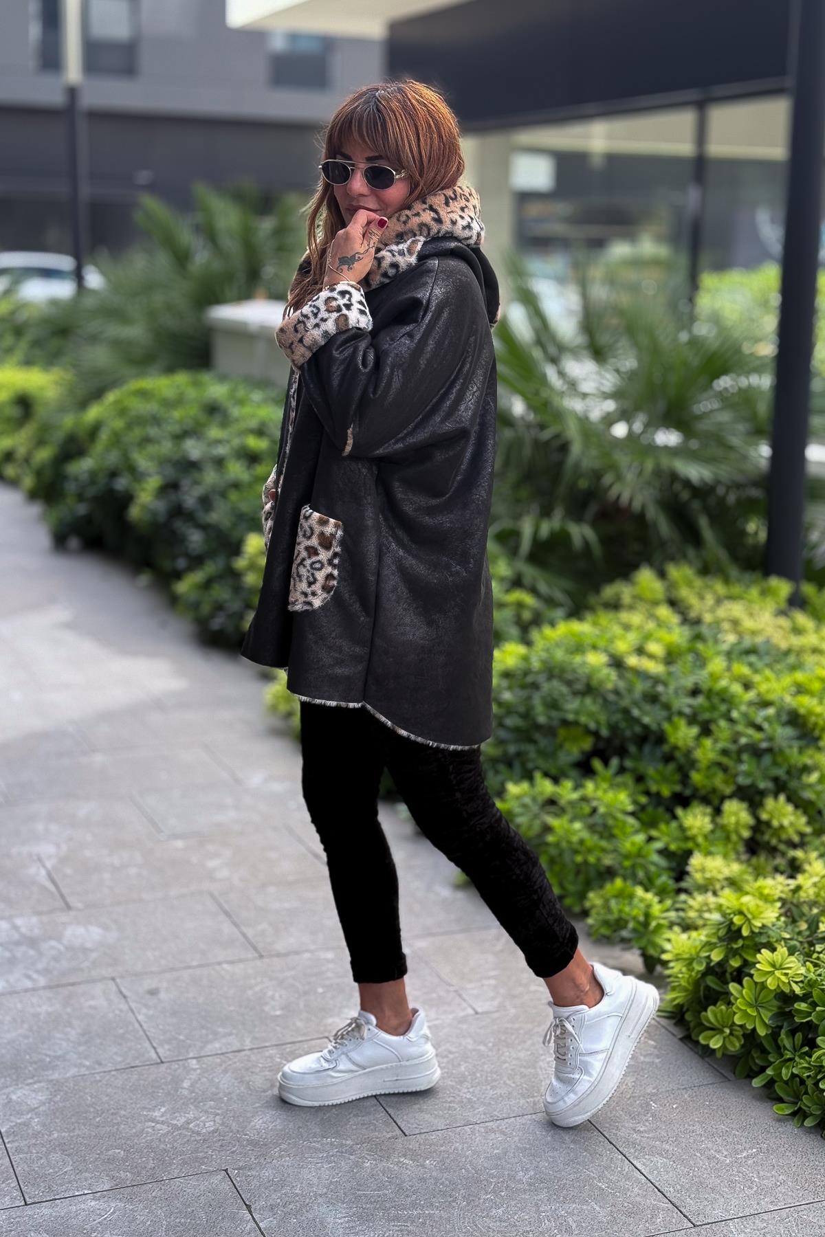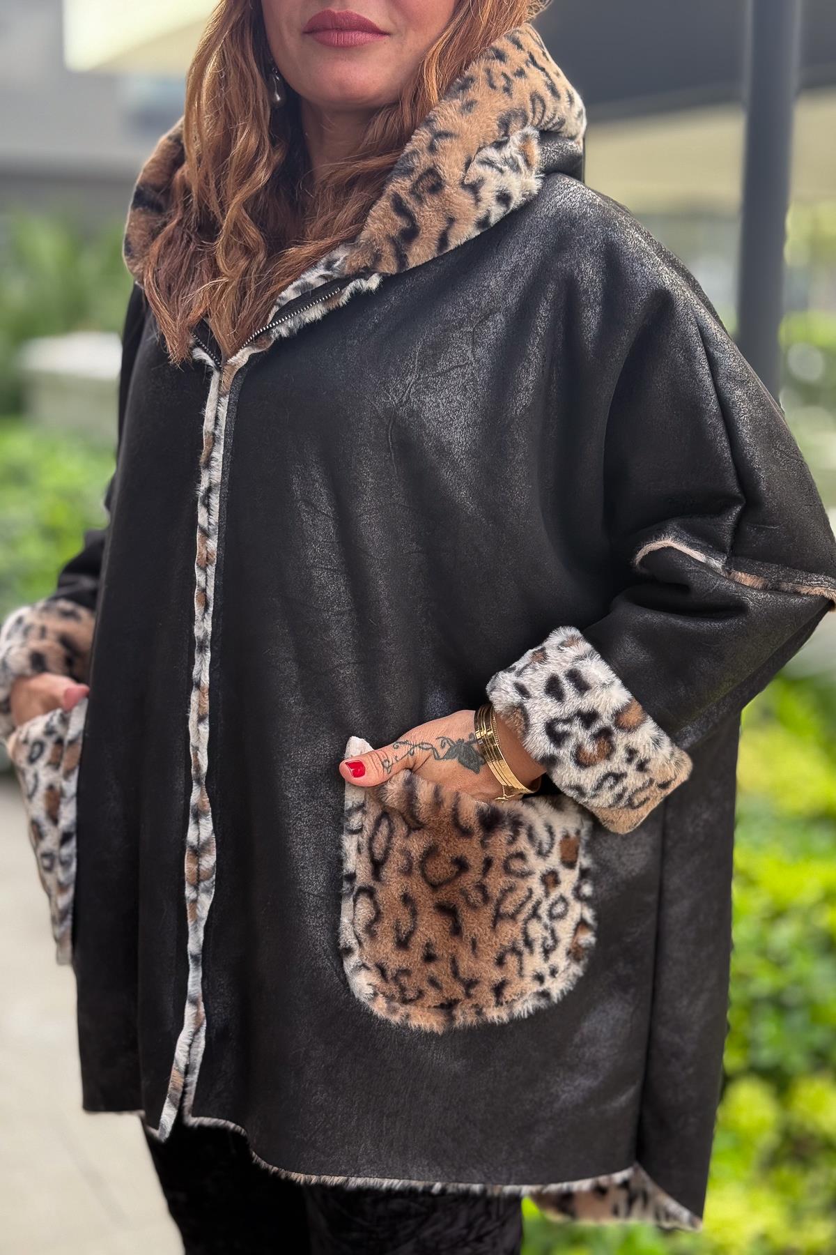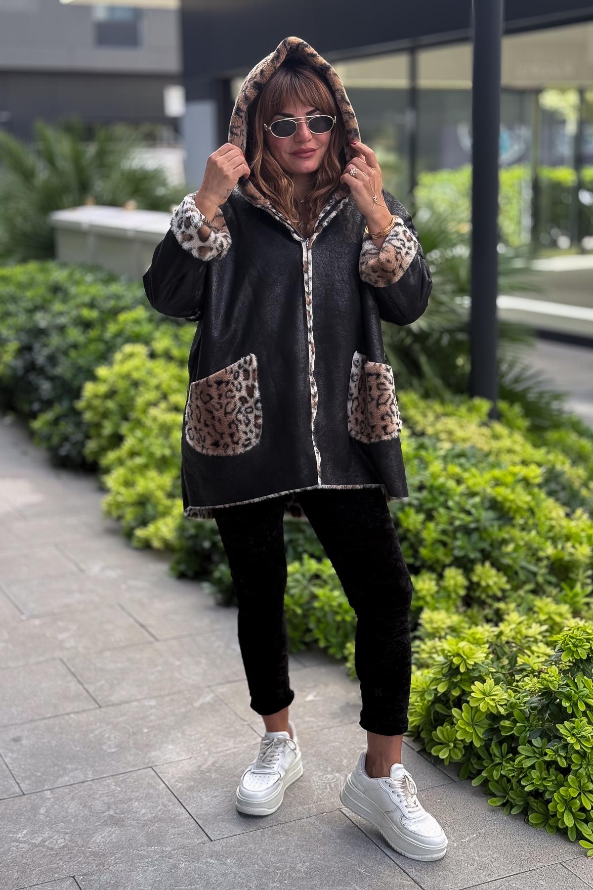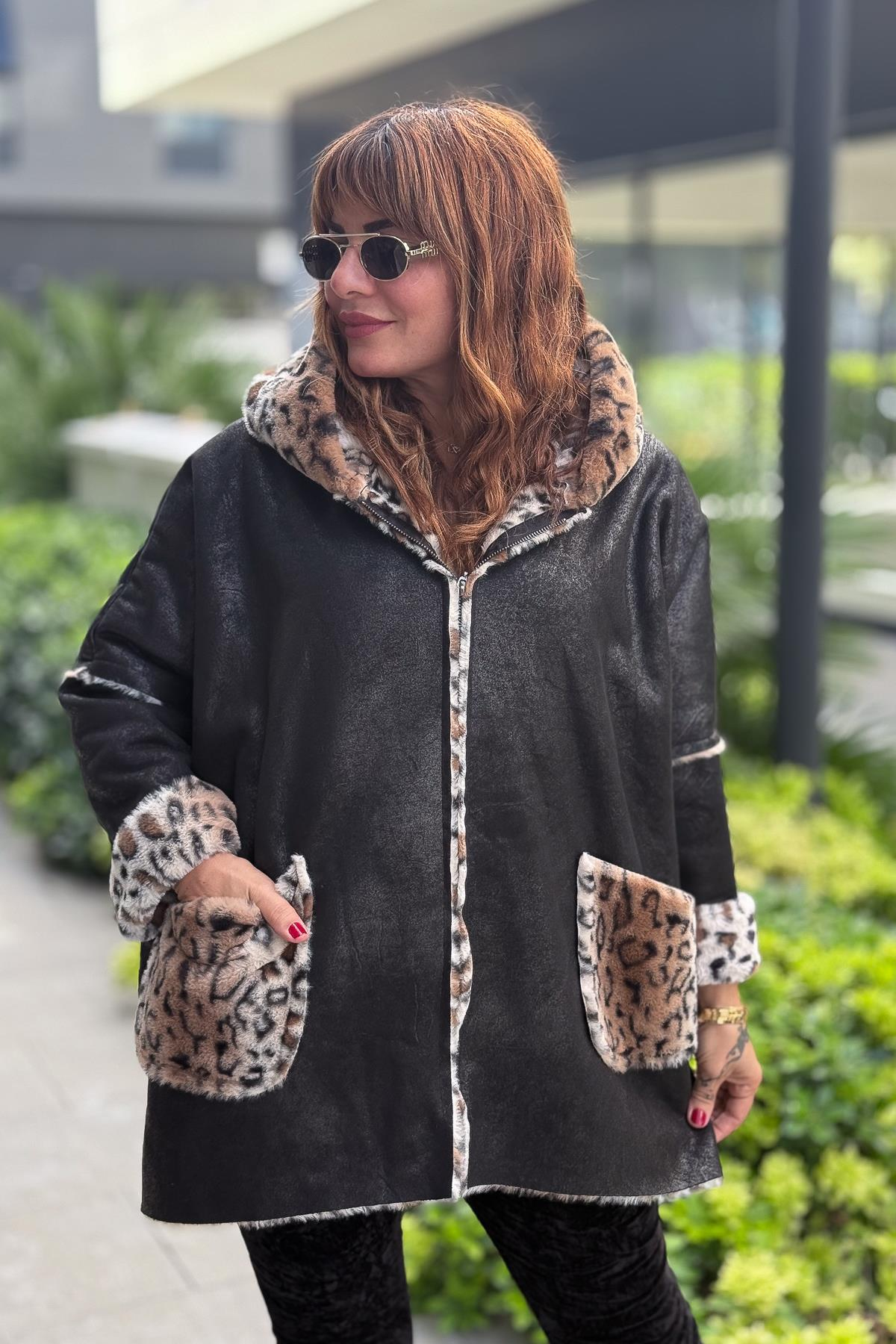İçi Leopar Desenli Güderi Kaban Siyah Renk