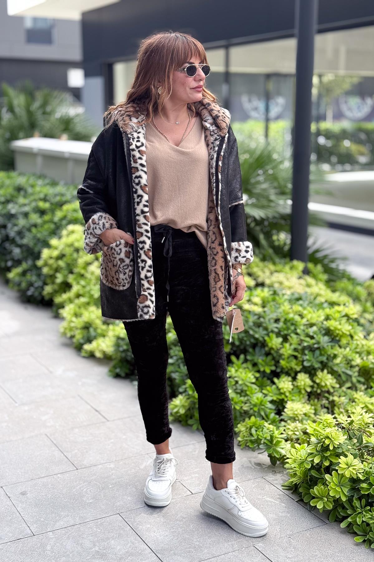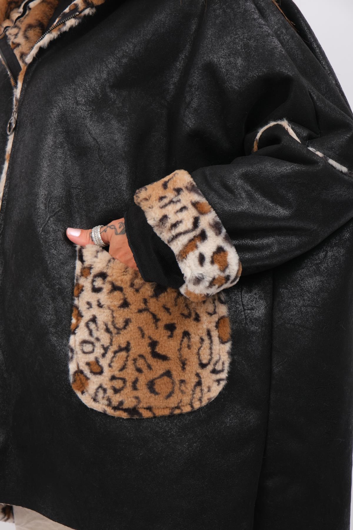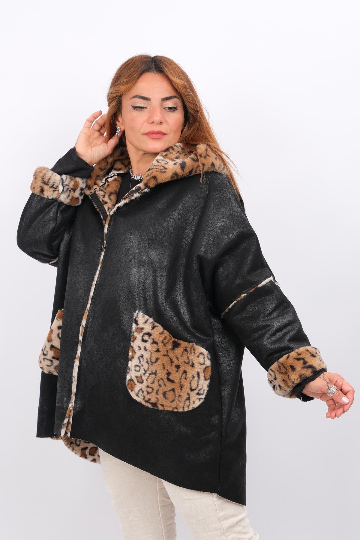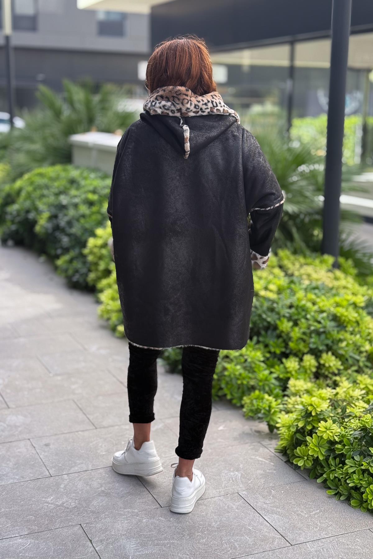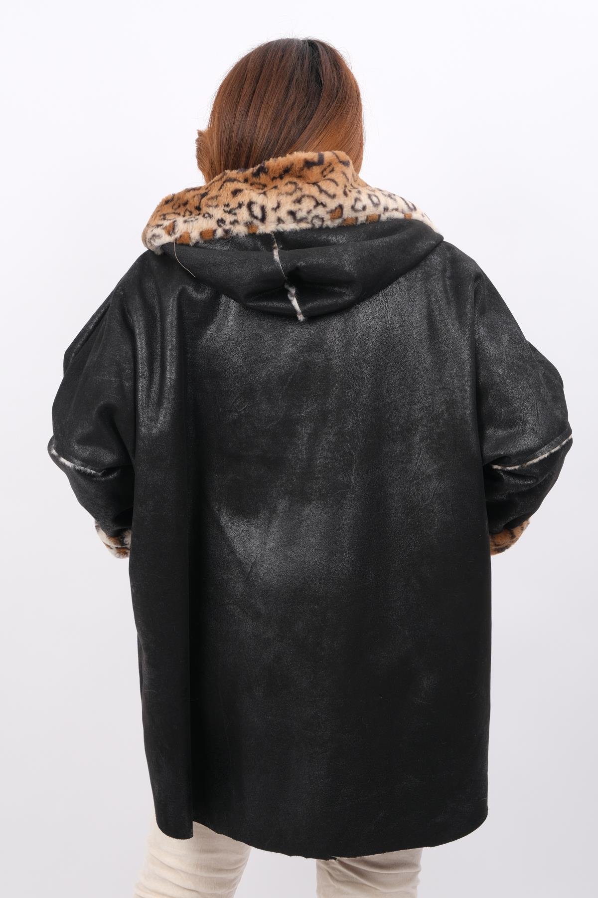 İçi Leopar Desenli Güderi Kaban Siyah Renk