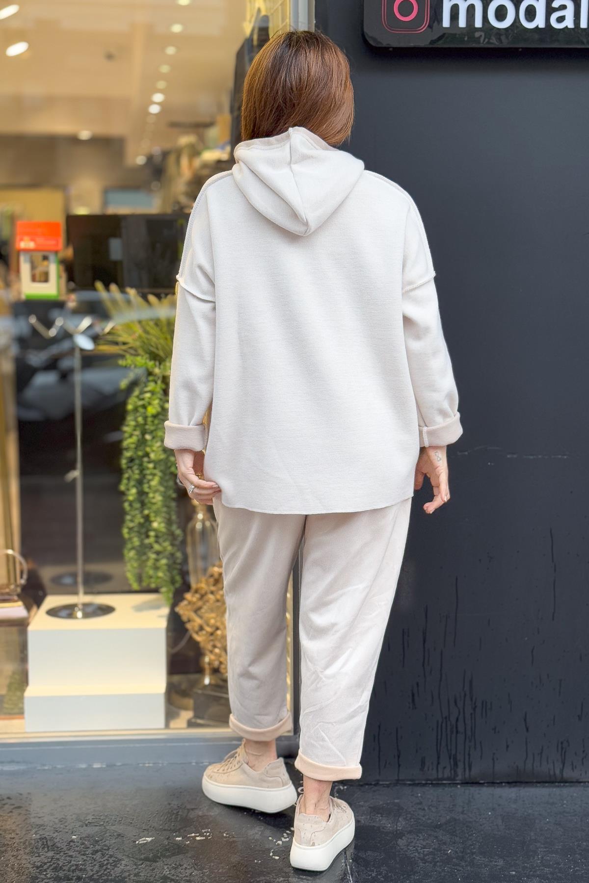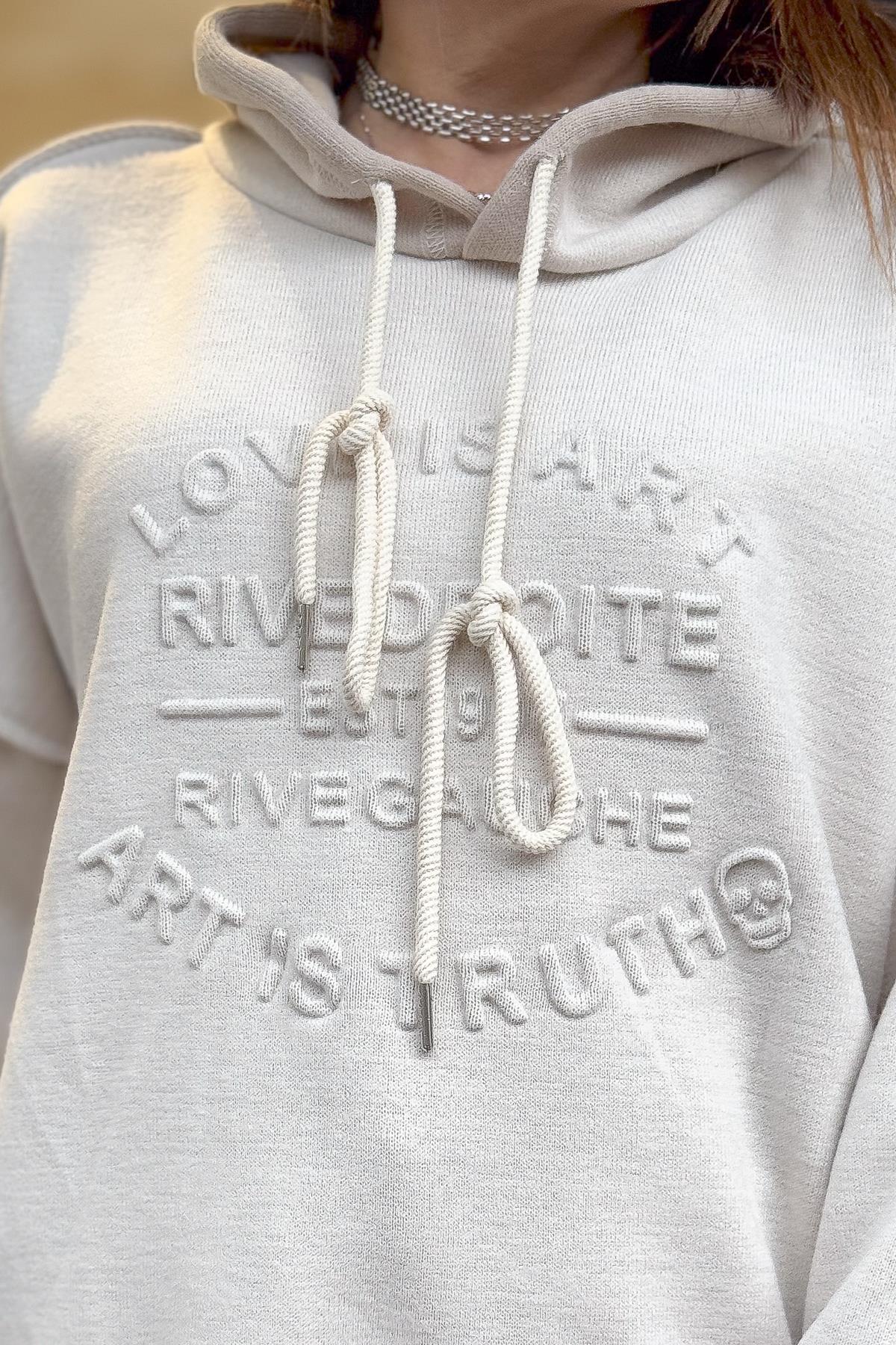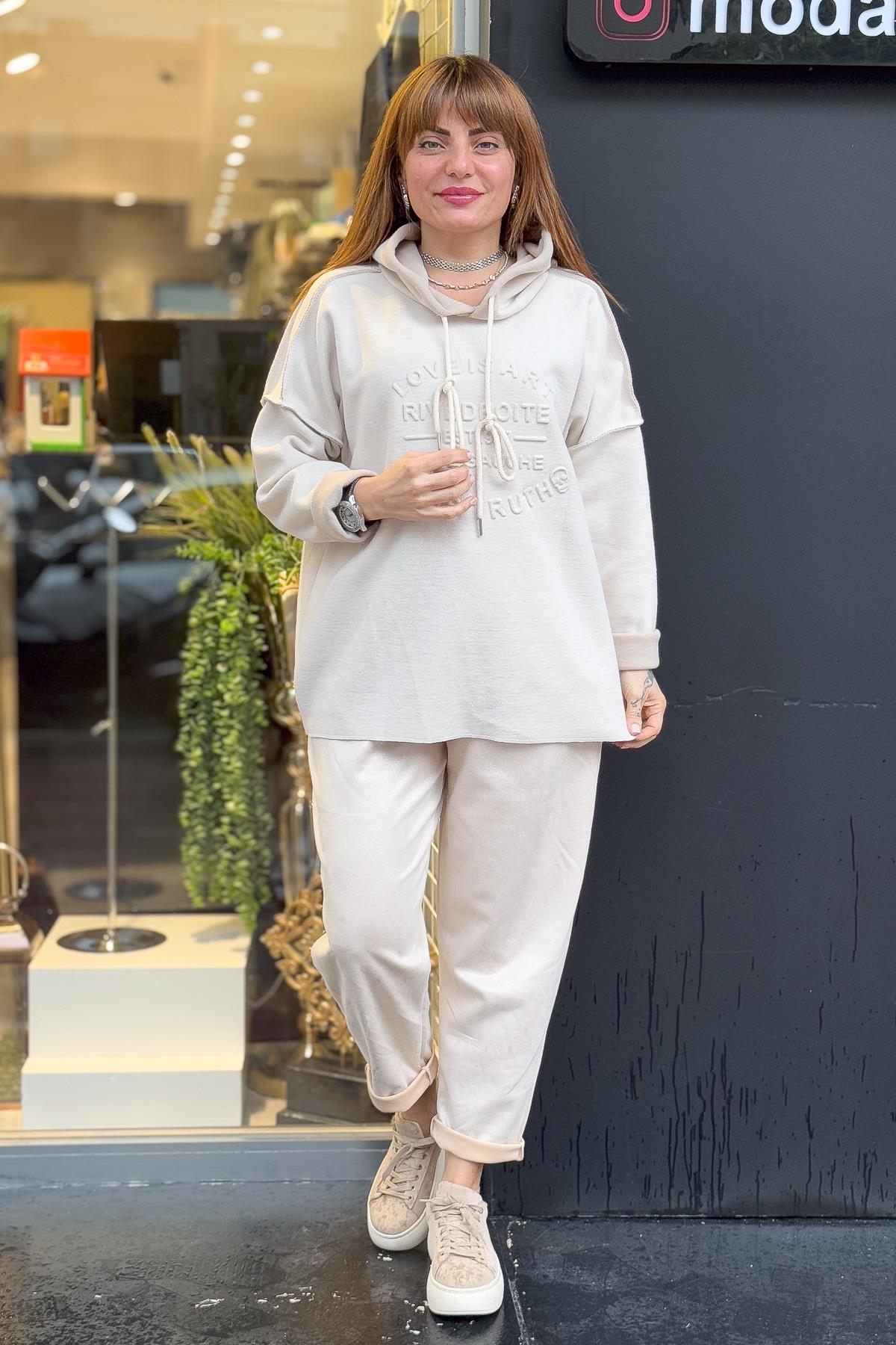 Kabartma Yazı Detaylı Çelik Örgü Kapüşonlu Sweet Bej Renk