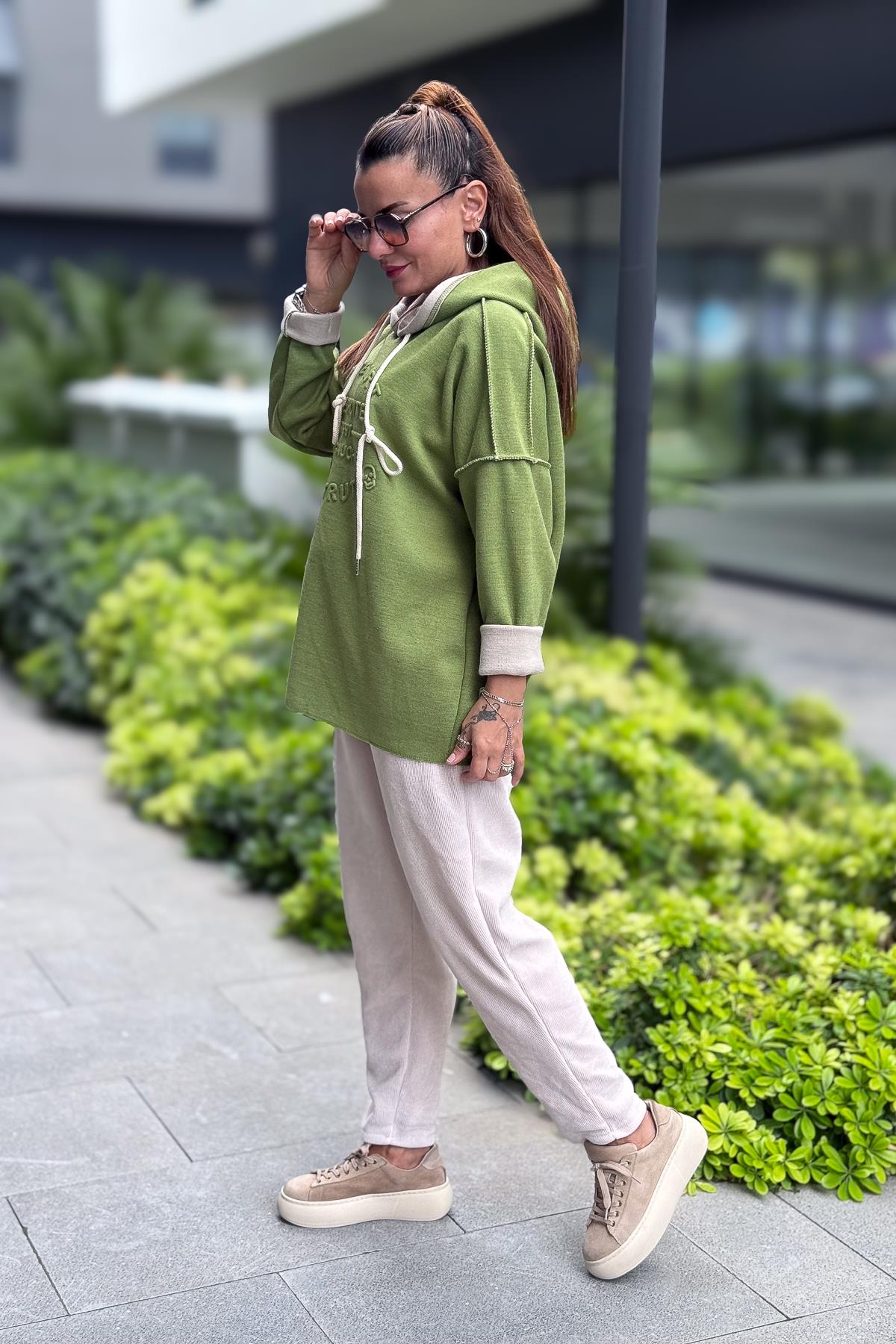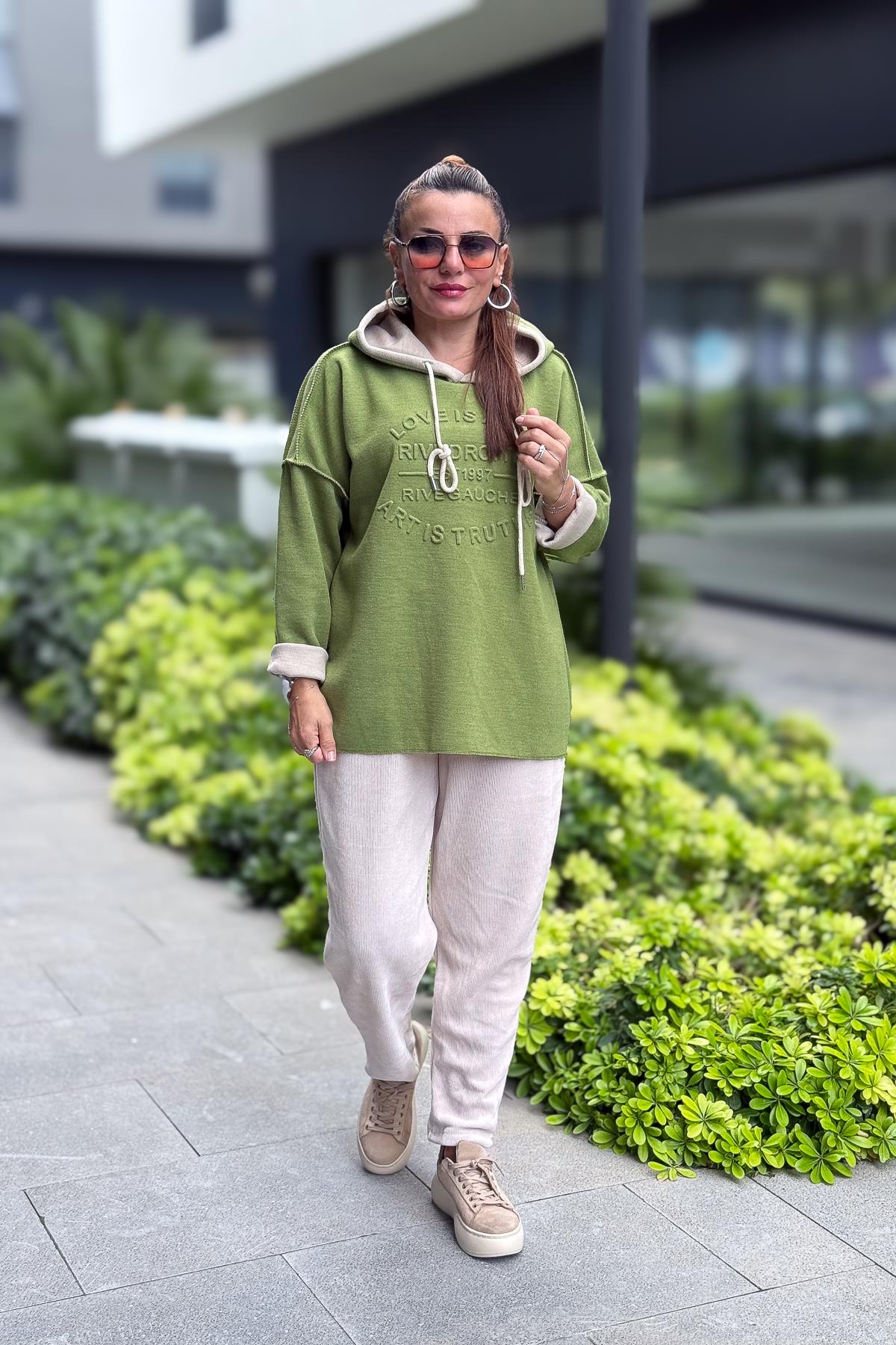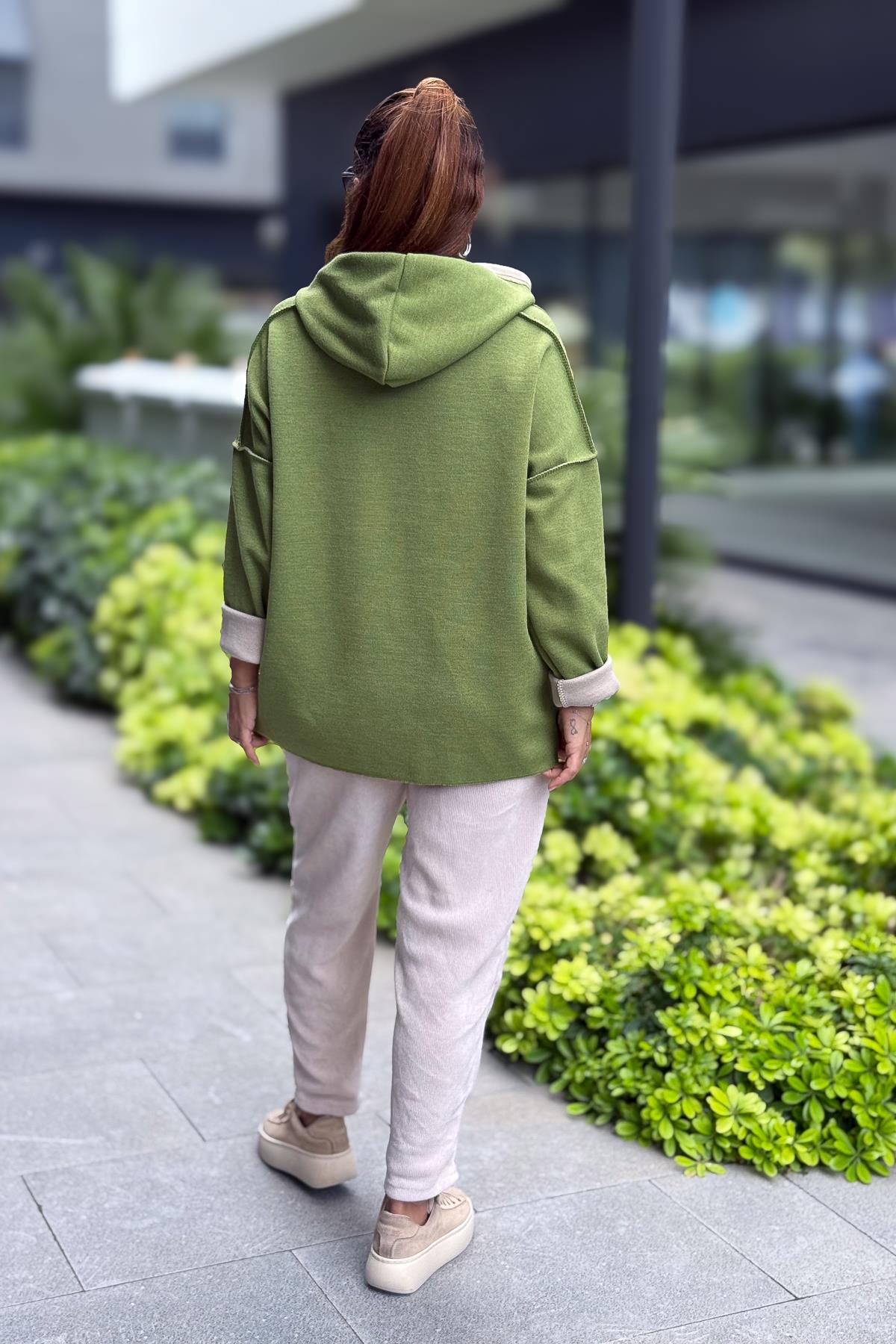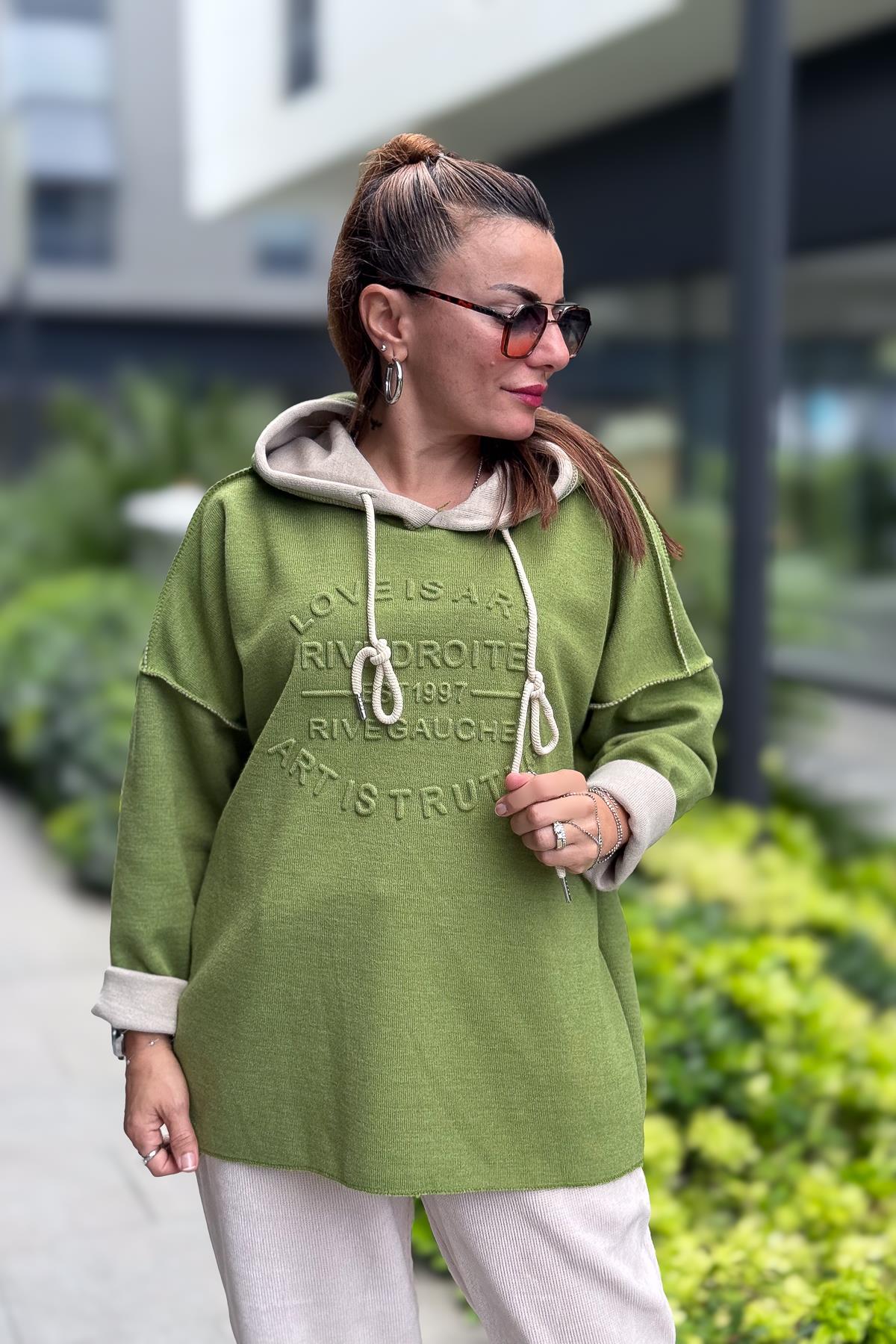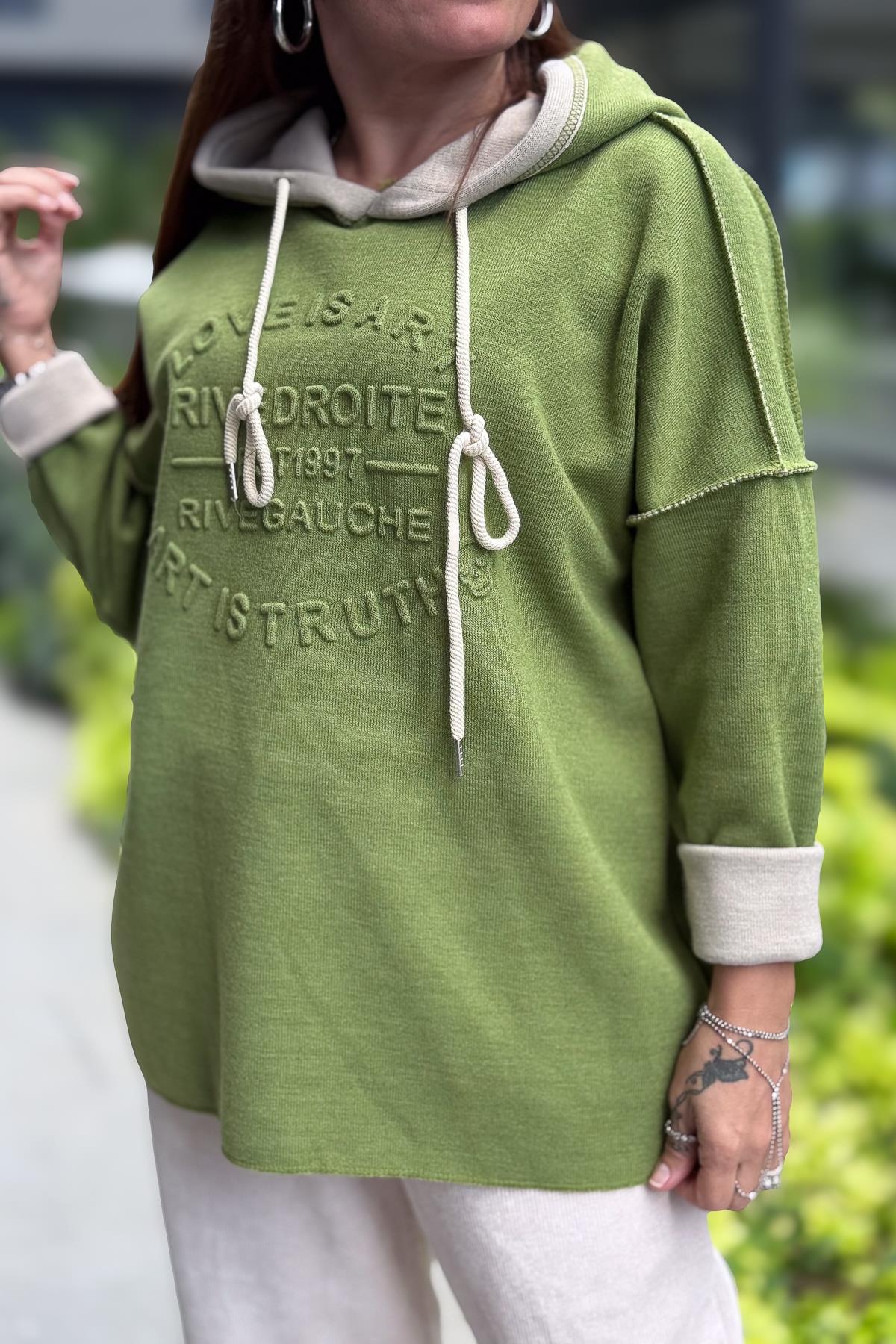 Kabartma Yazı Detaylı Çelik Örgü Kapüşonlu Sweet Fıstık Yeşil Renk