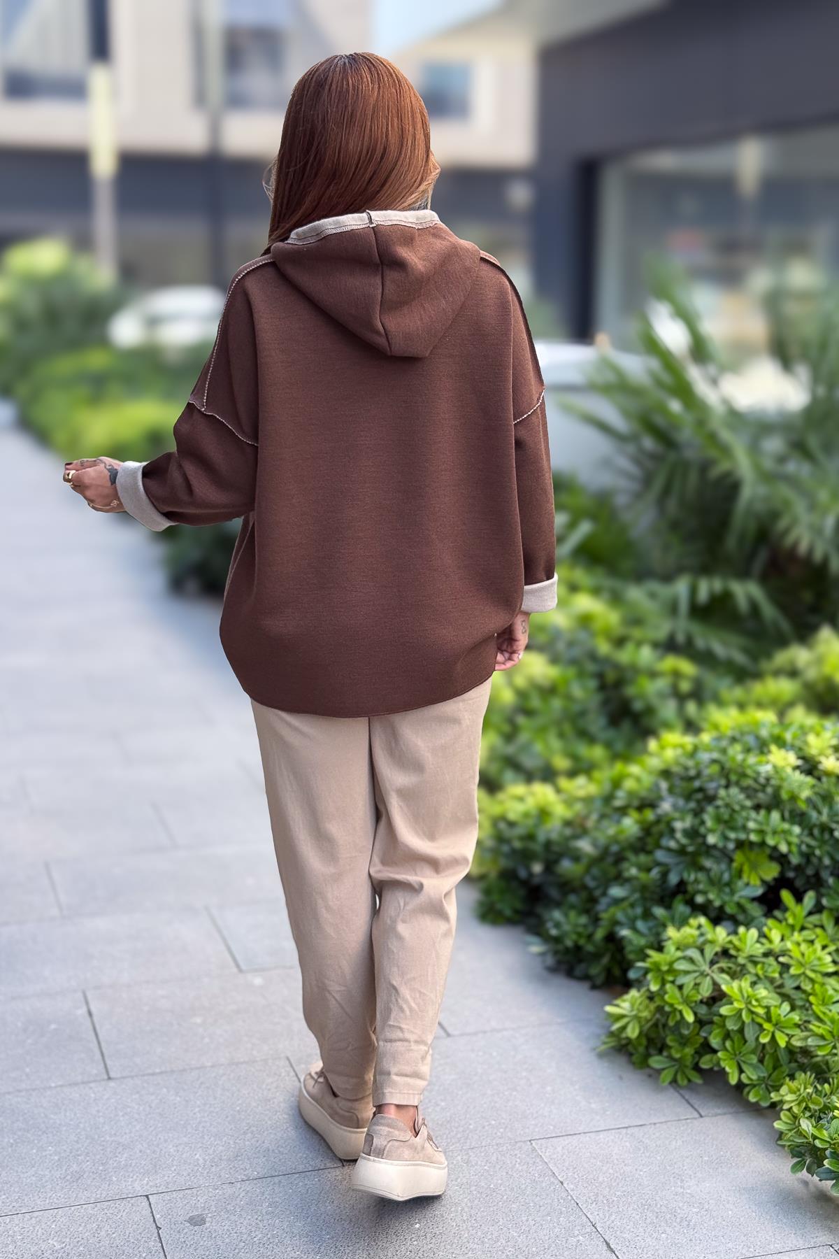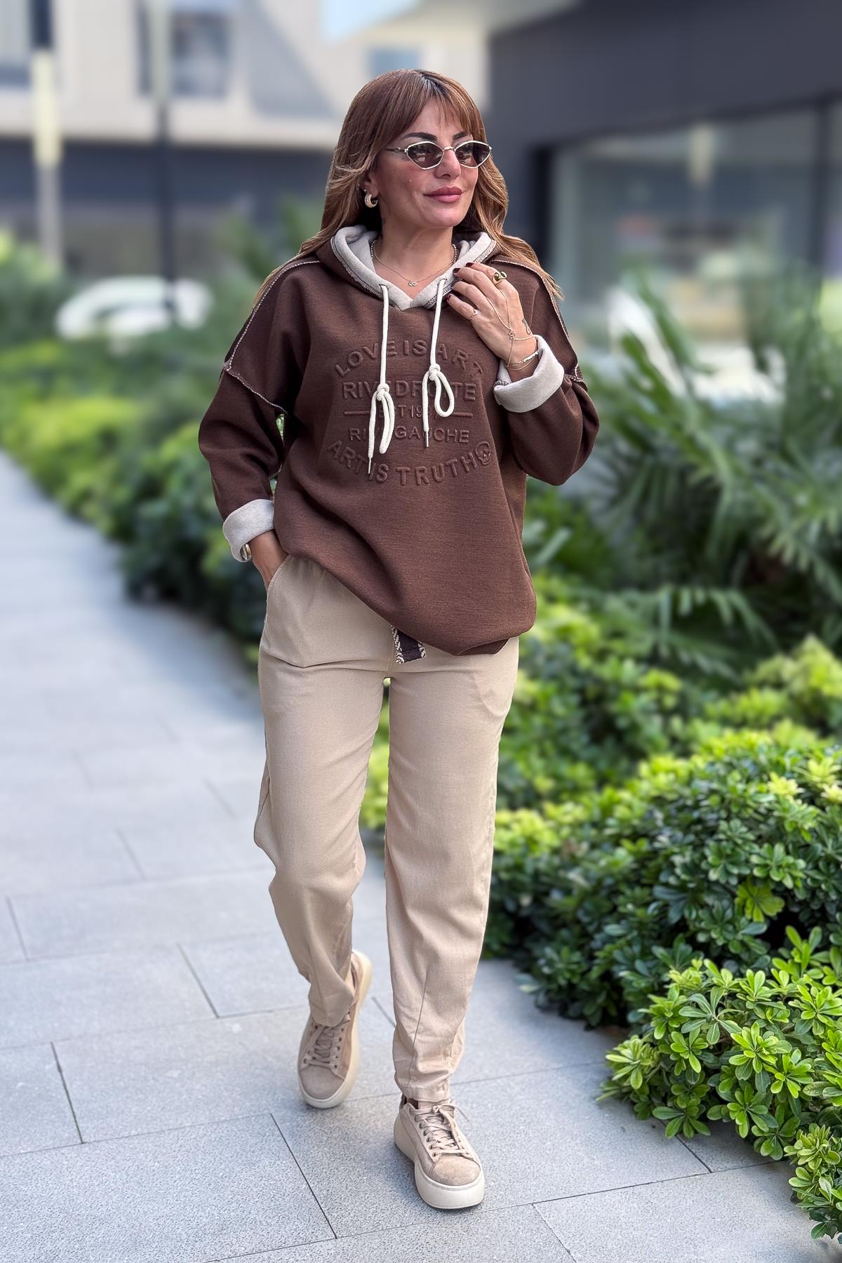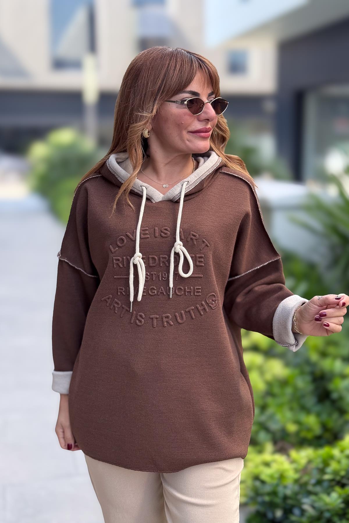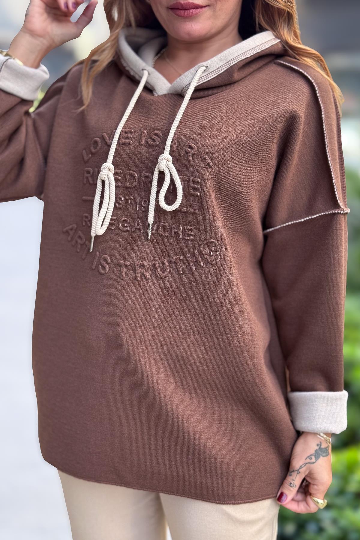 Kabartma Yazı Detaylı Çelik Örgü Kapüşonlu Sweet Kızılkahve Renk