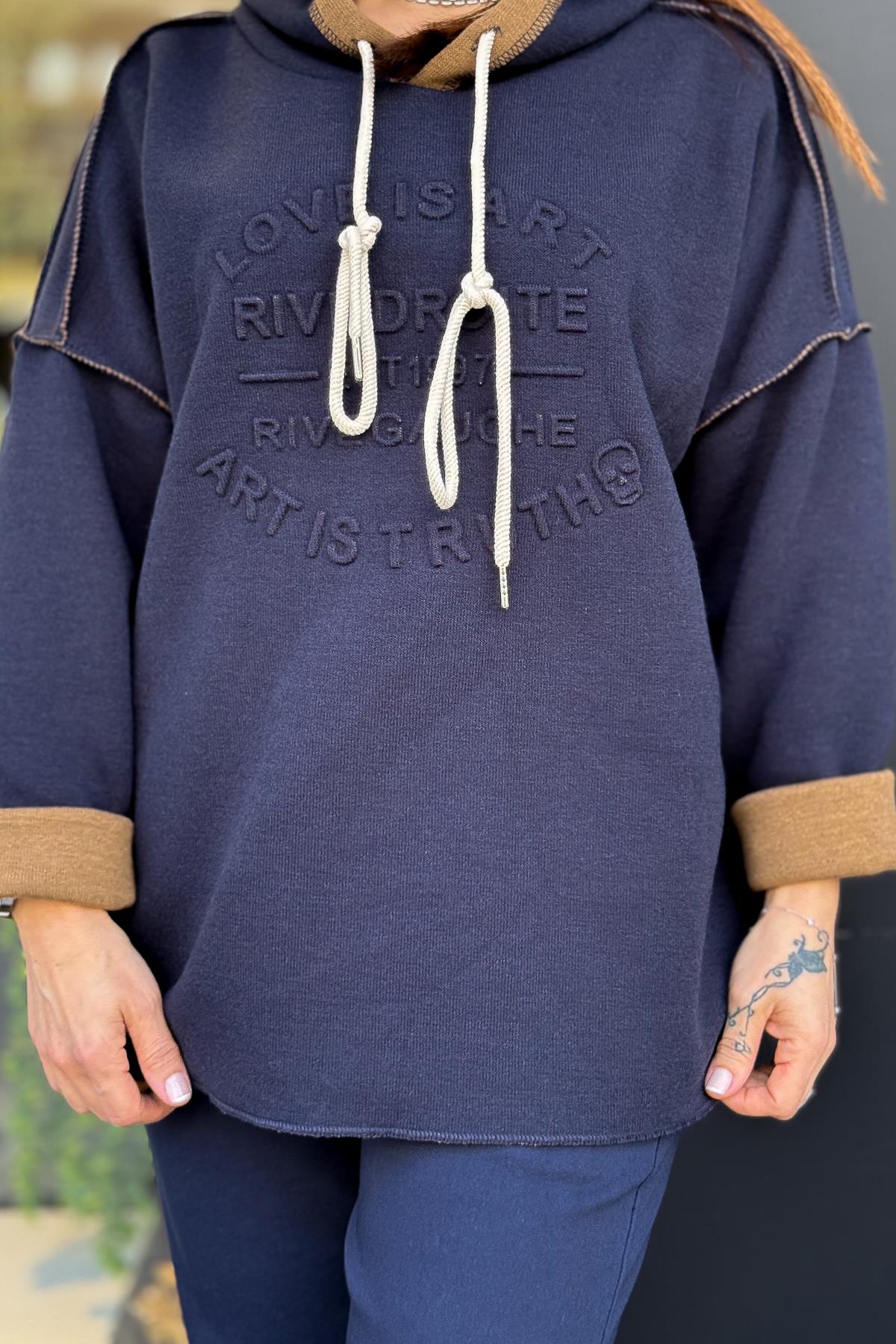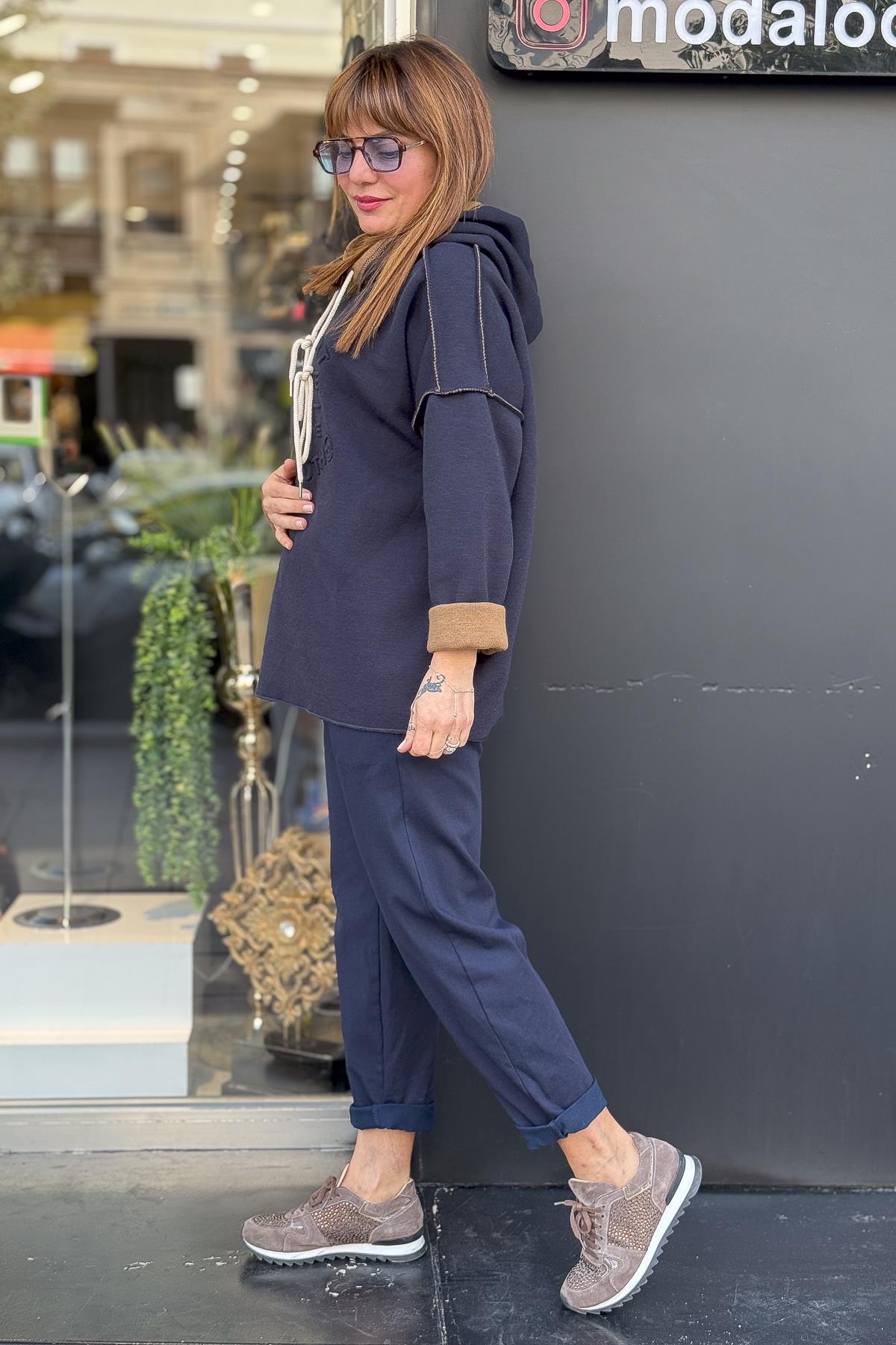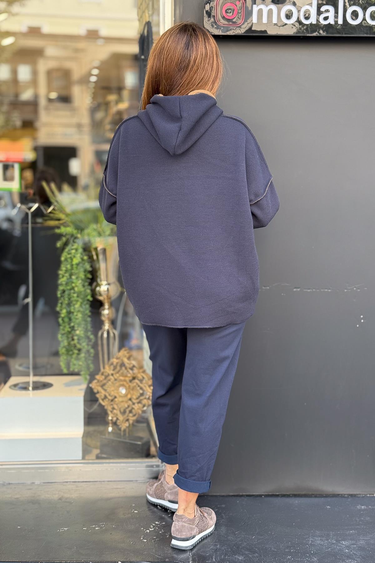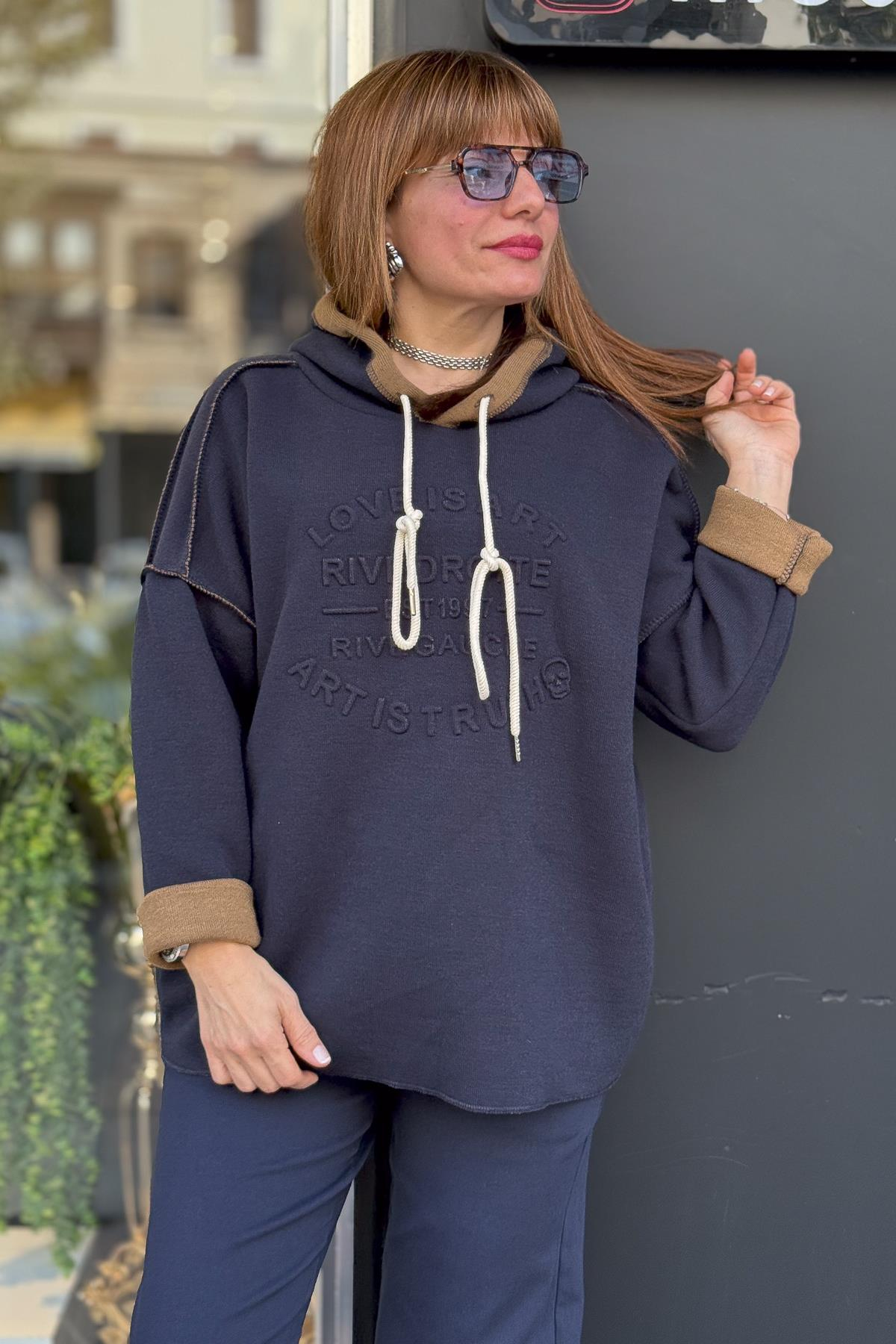 Kabartma Yazı Detaylı Çelik Örgü Kapüşonlu Sweet Lacivert Renk