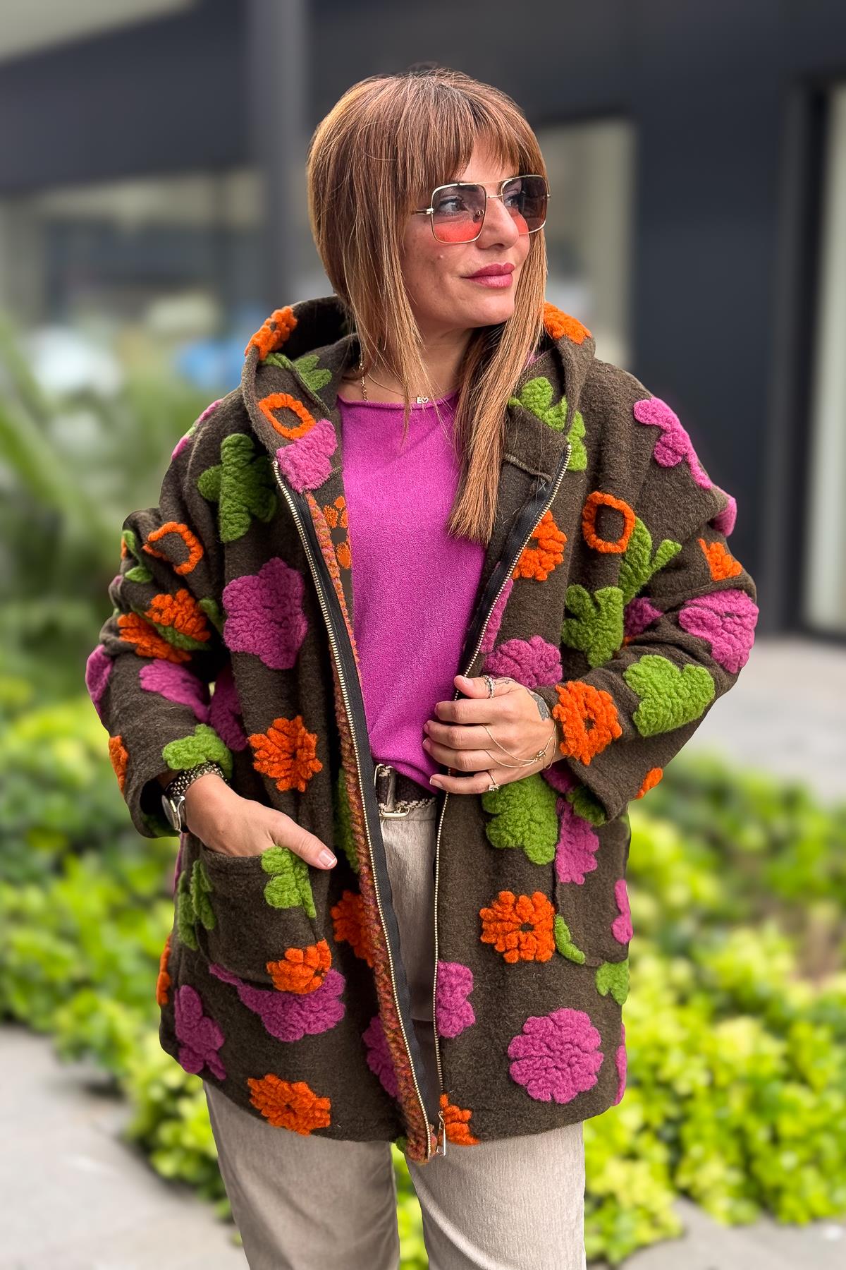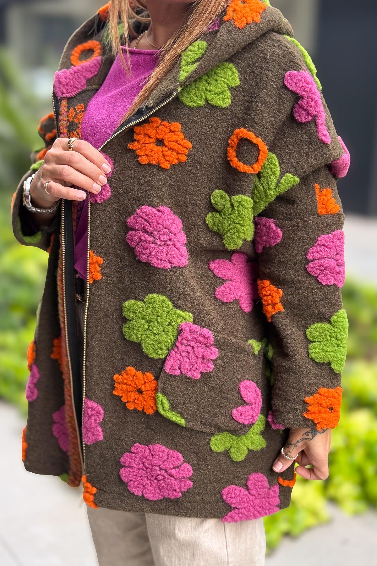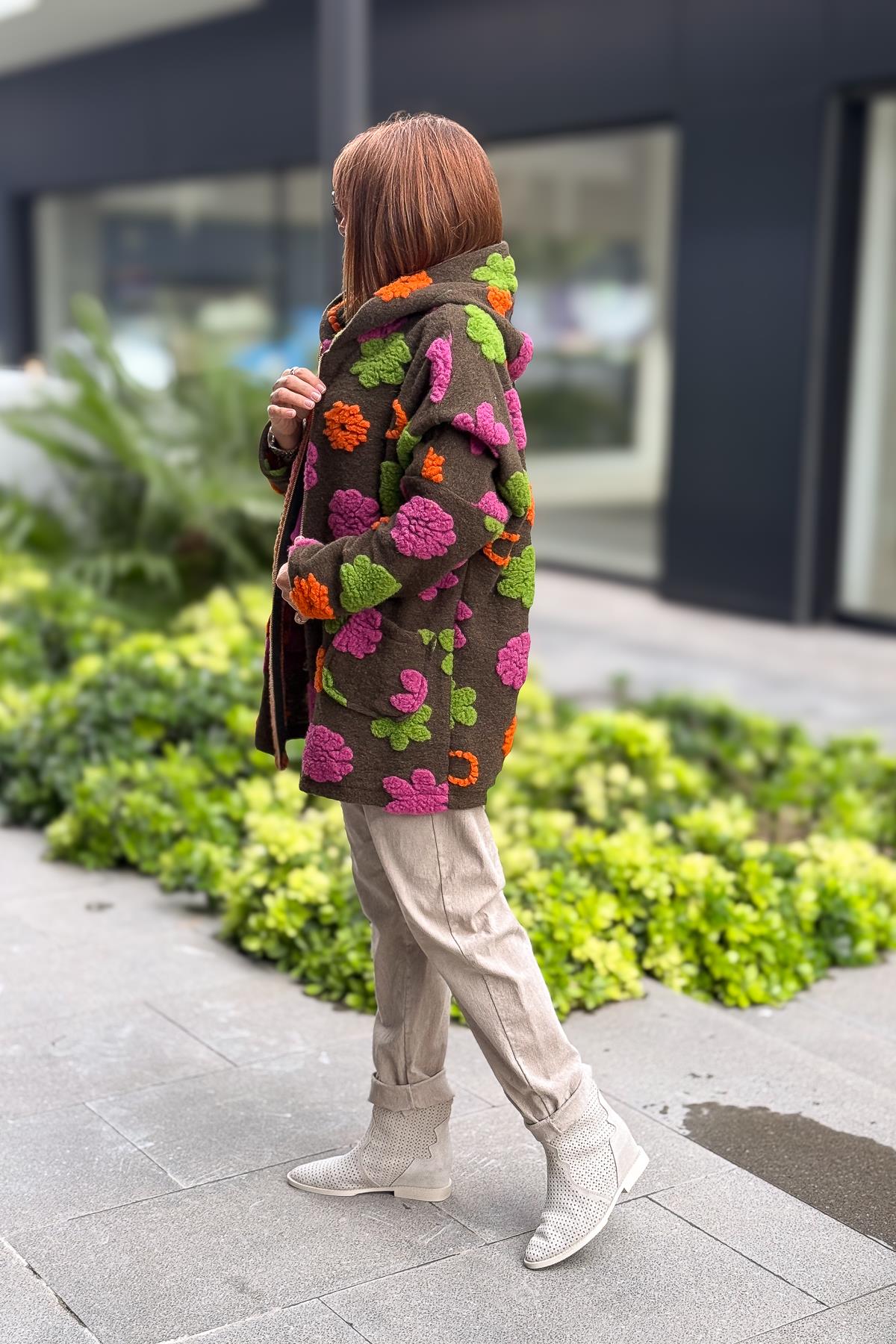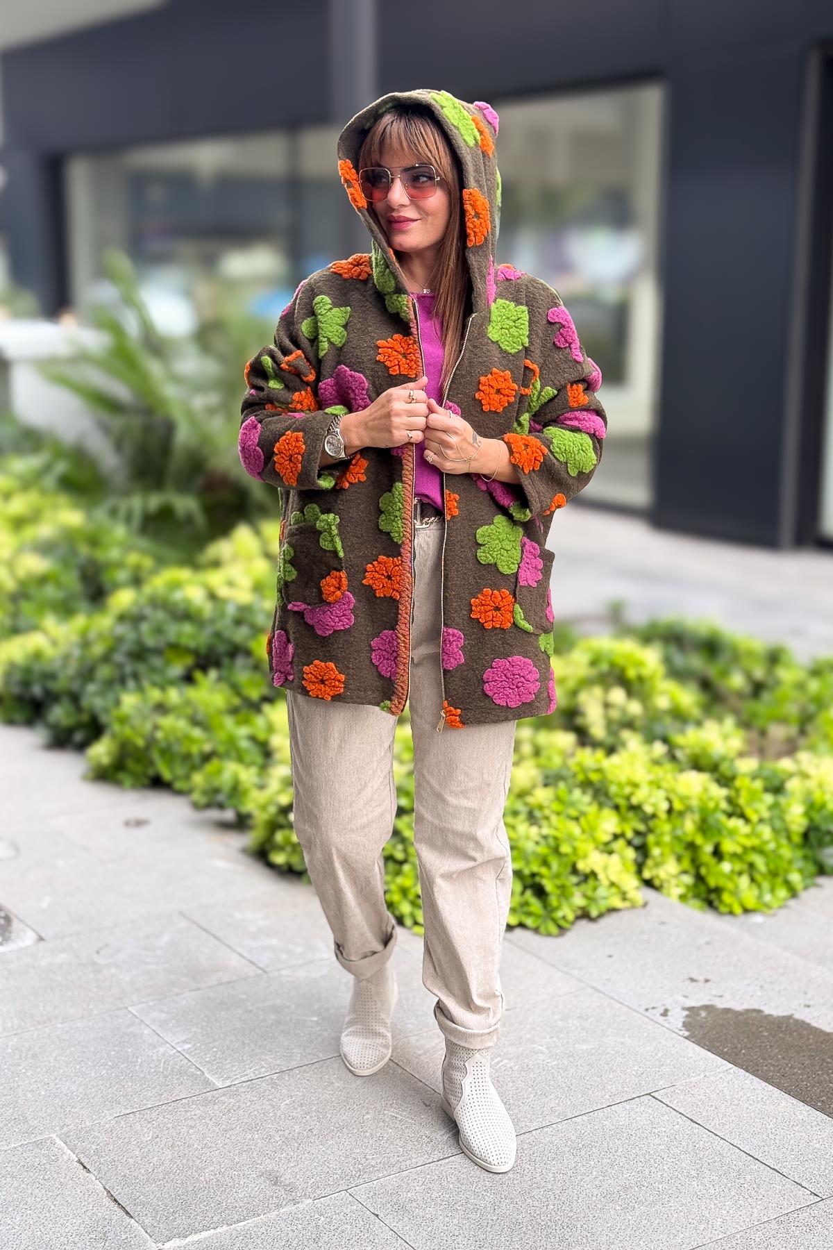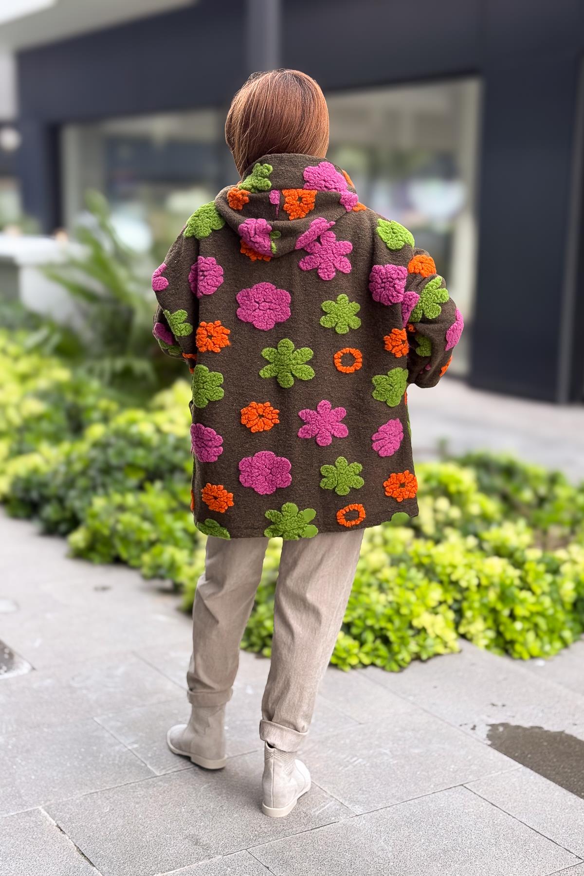 Kabartmalı Çiçek Detaylı Keçe Kaban Haki Renk