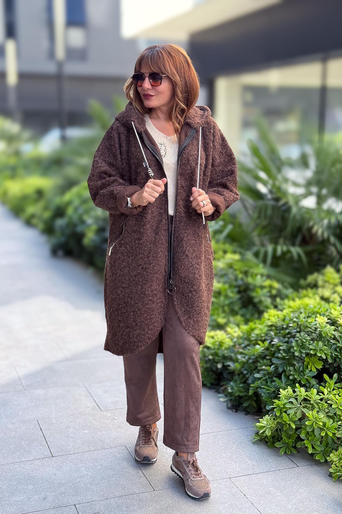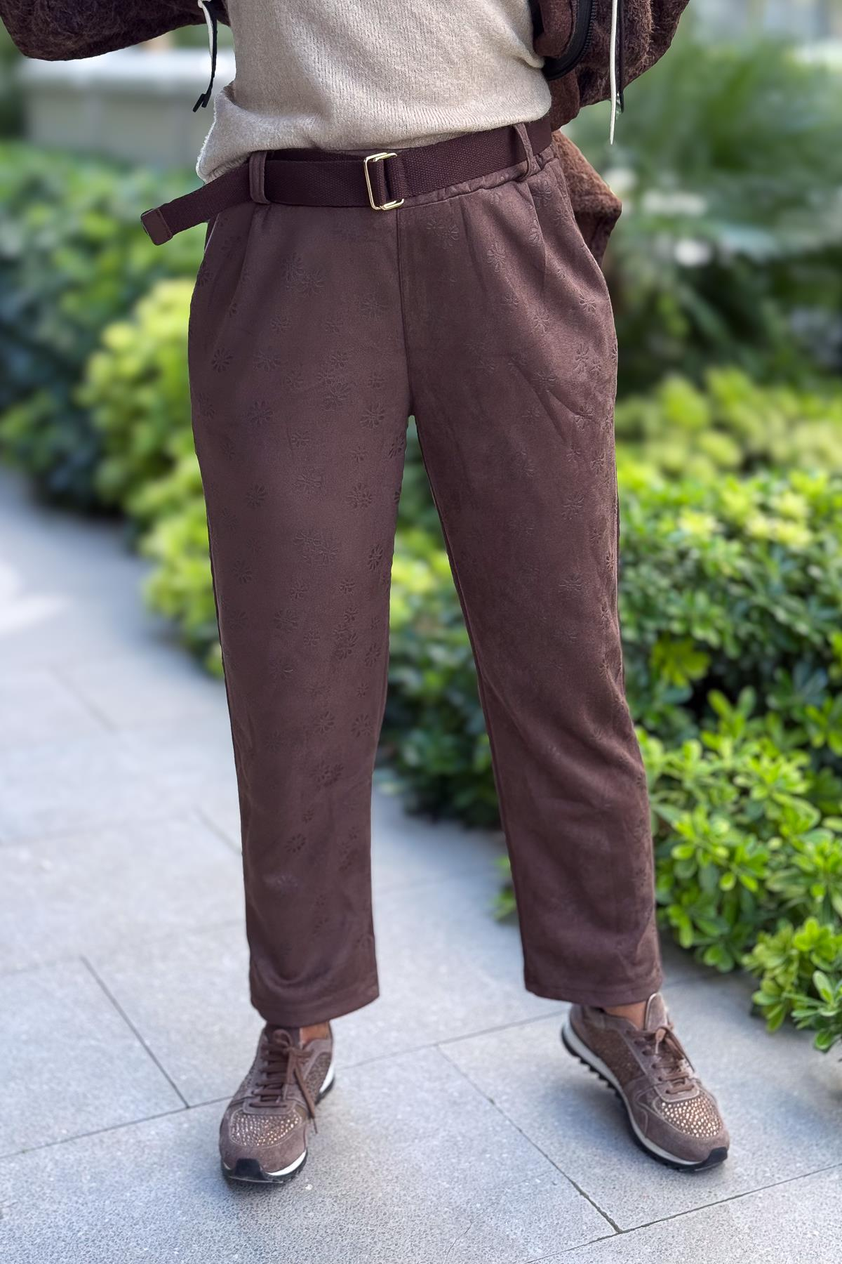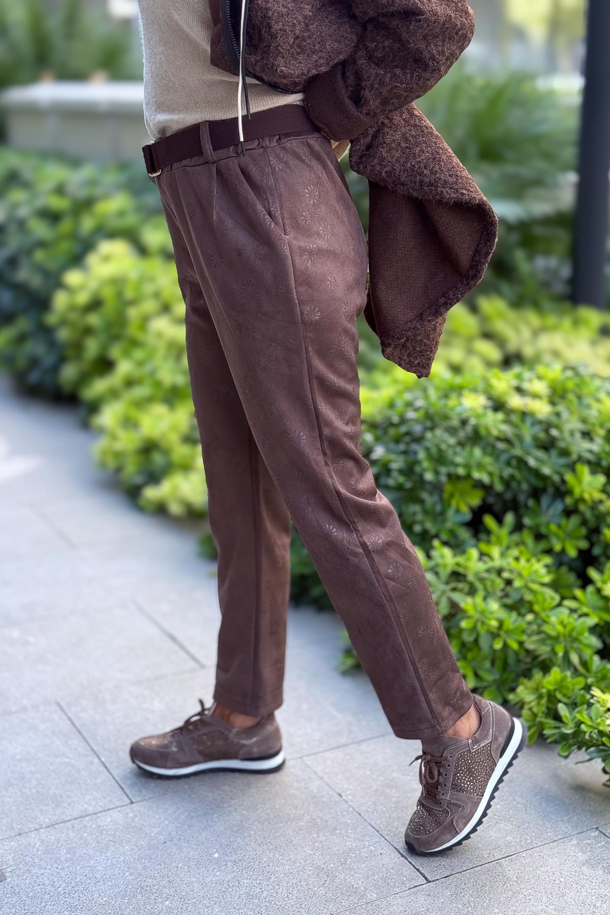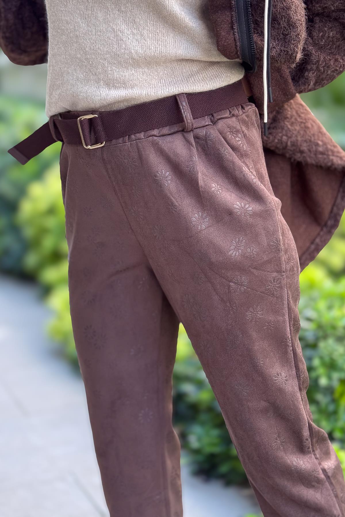 Kahve Kemerli Papatya Baskılı Güderi Pantolon Kahverengi Renk