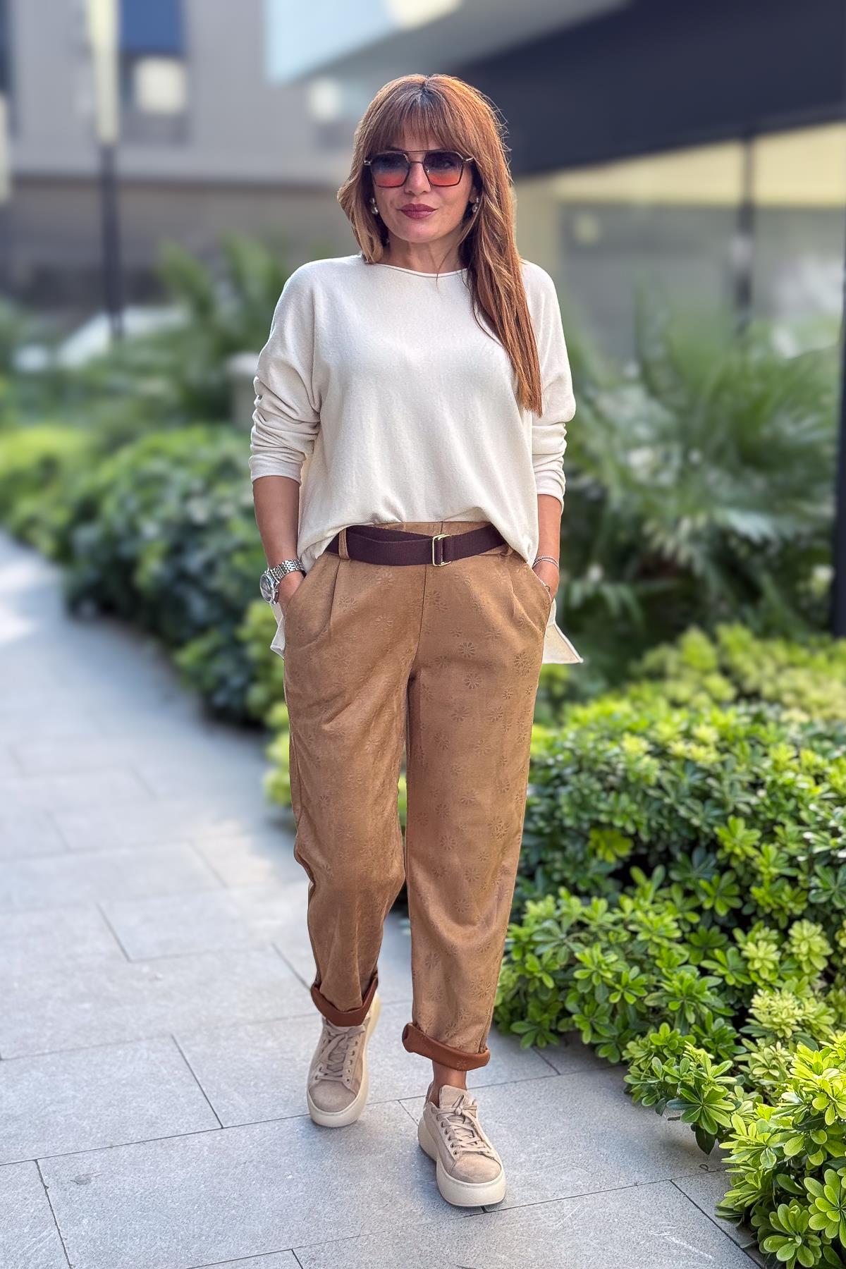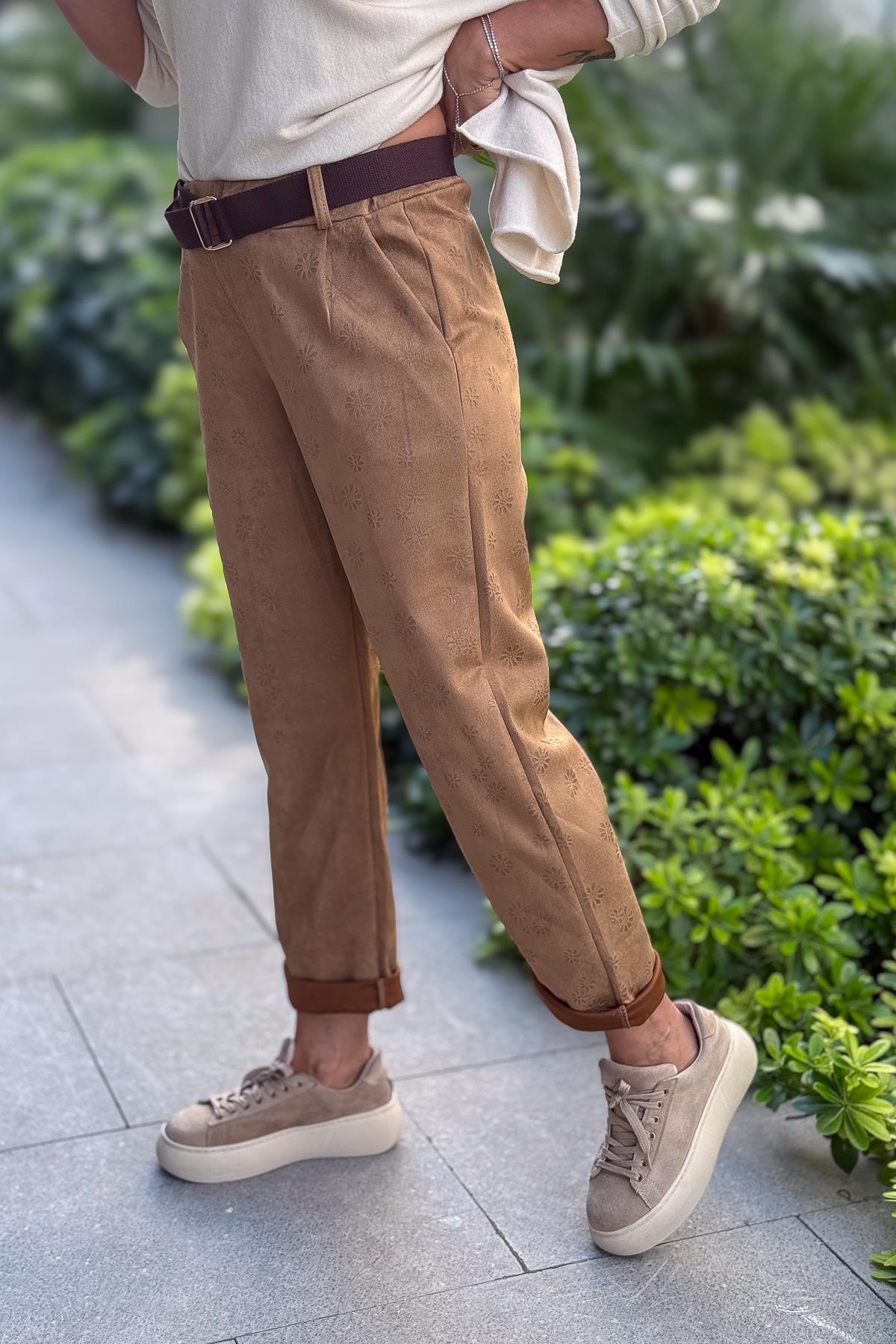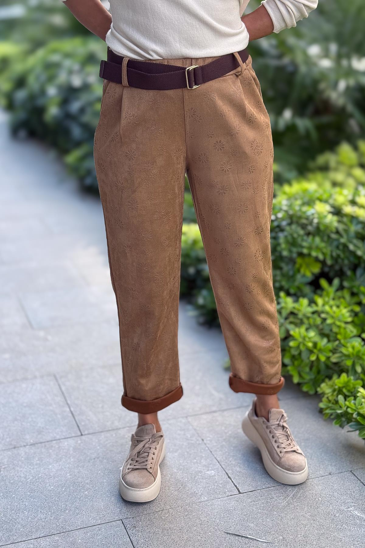Kahve Kemerli Papatya Baskılı Güderi Pantolon Taba Renk