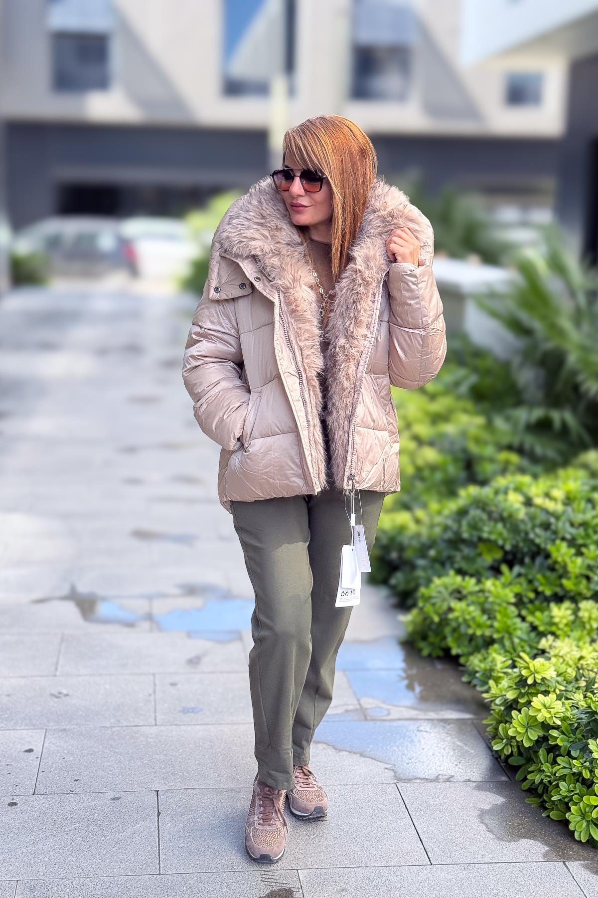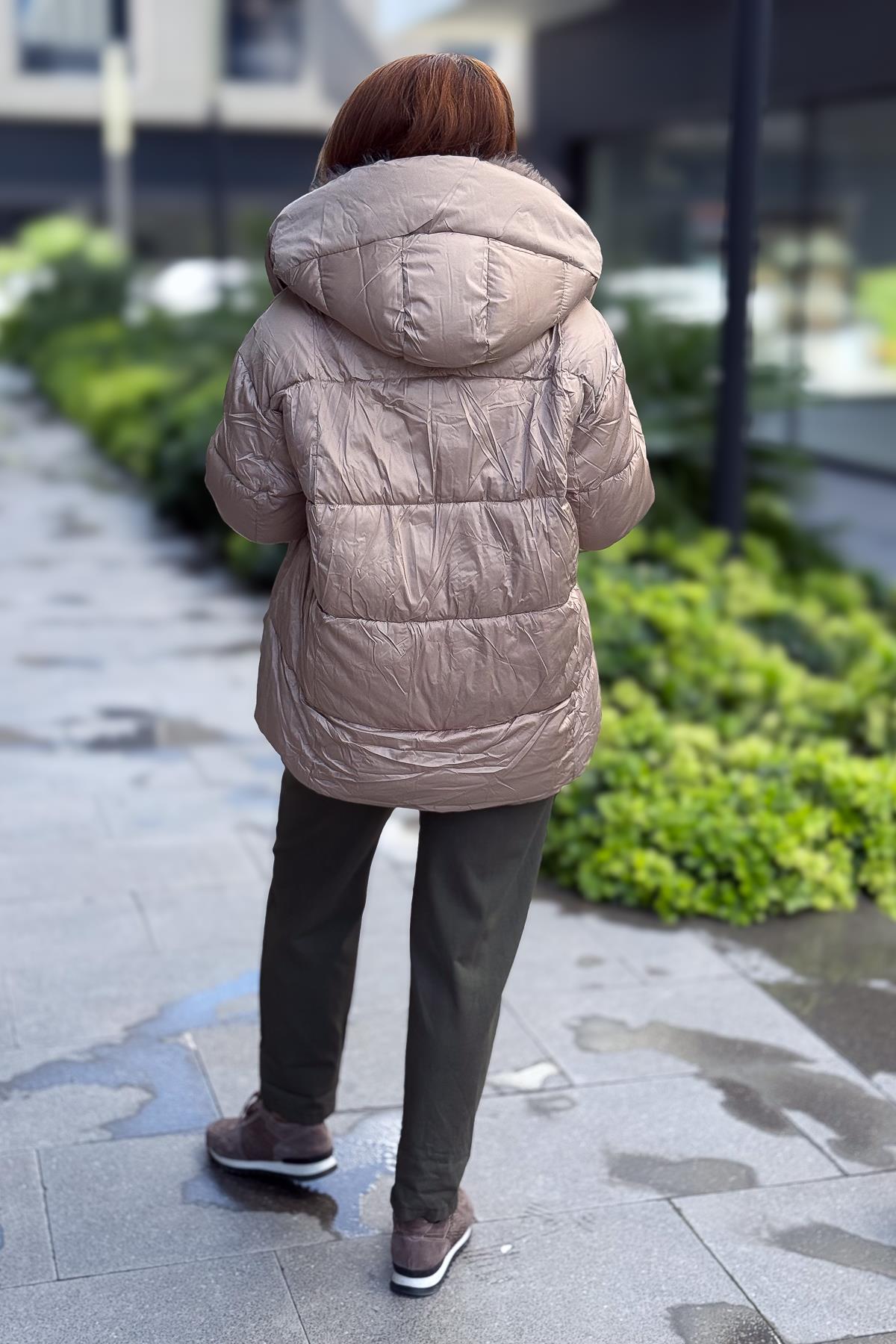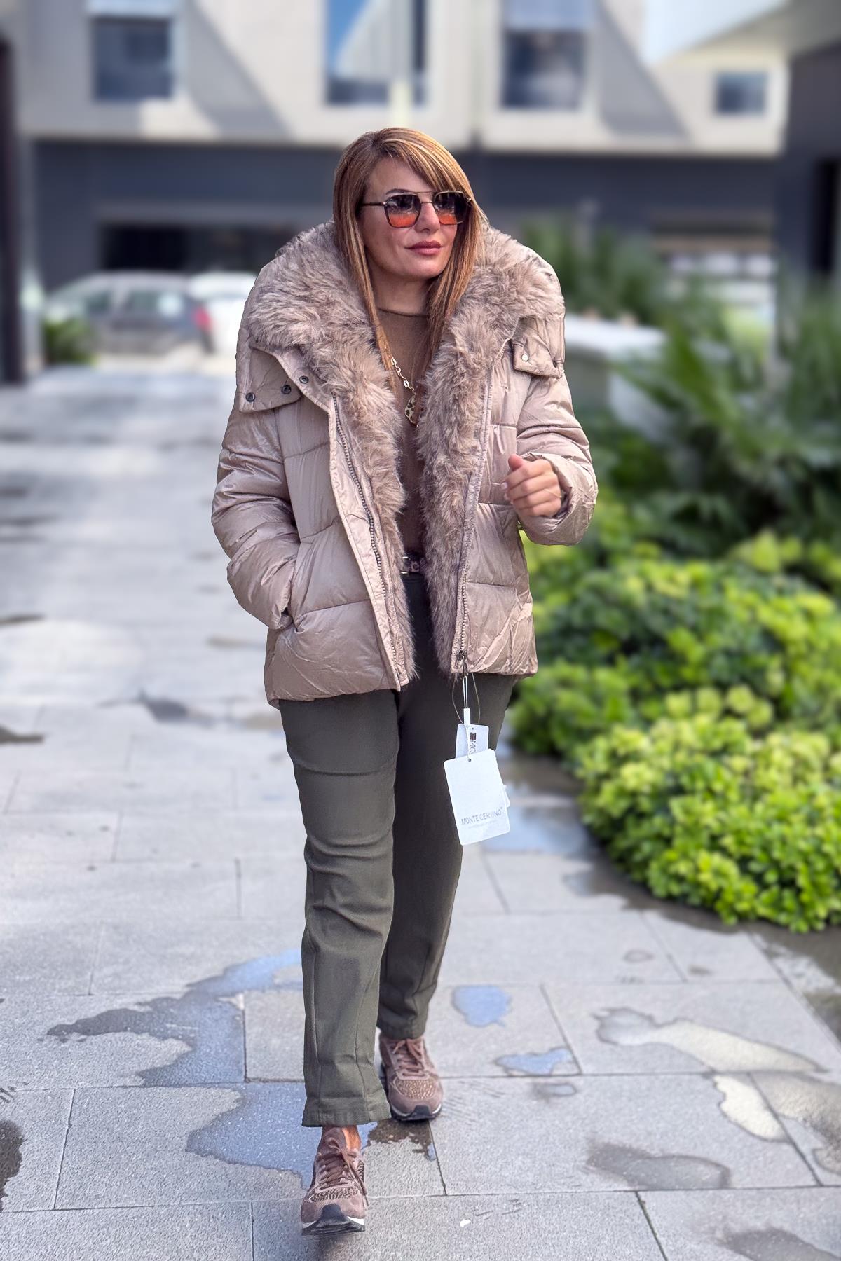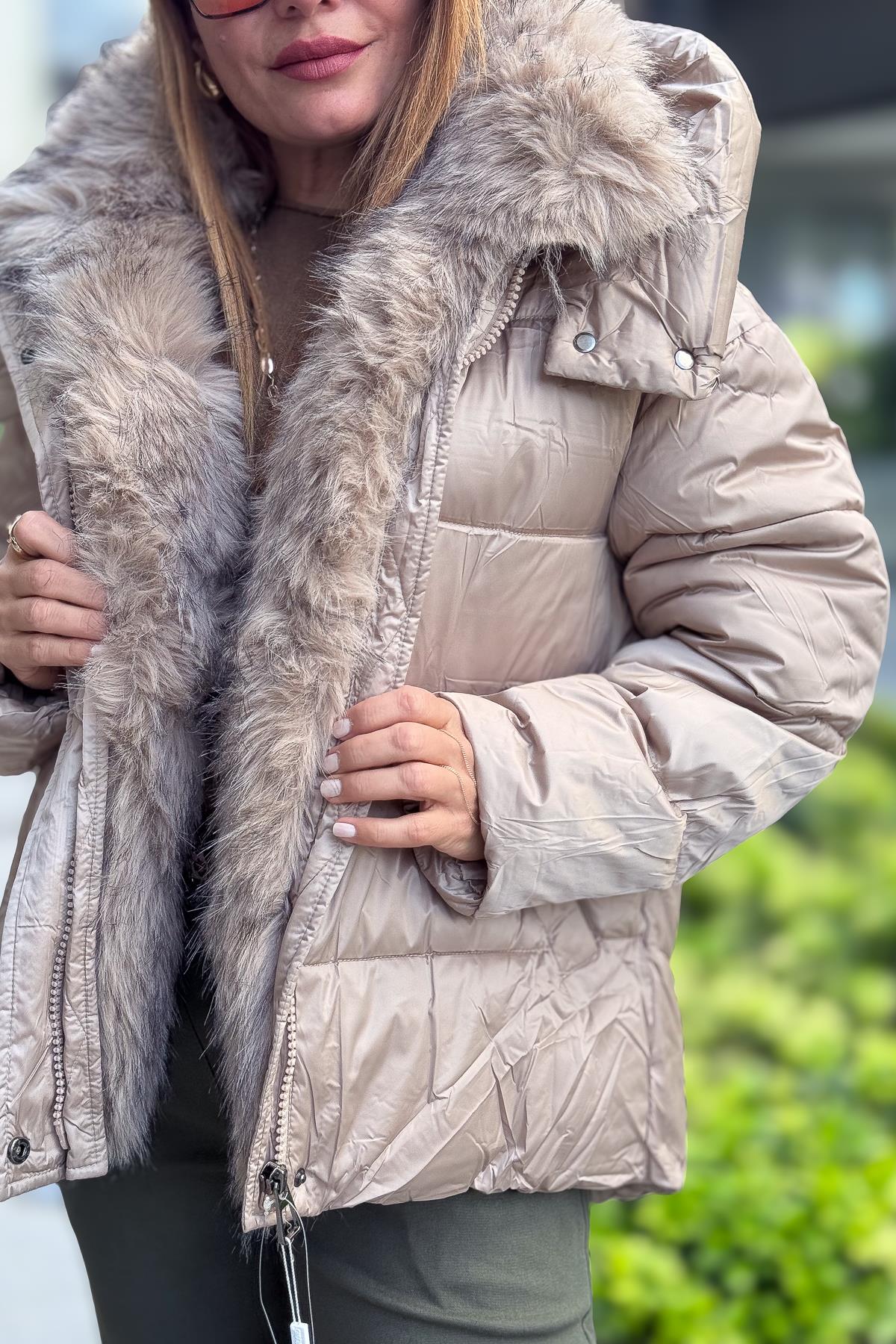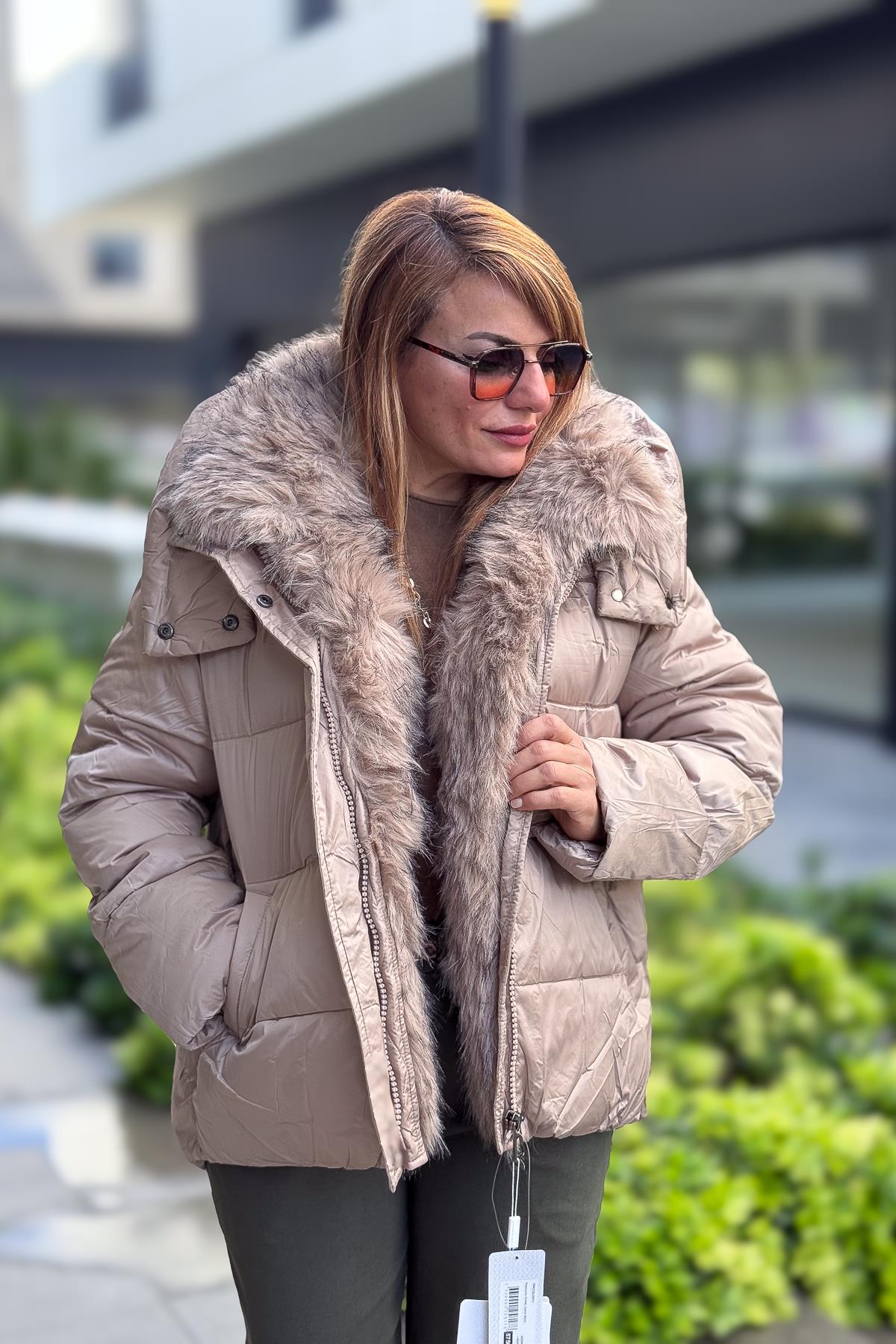 Kapüşonu Kürklü Şişme Mont Vizon Renk