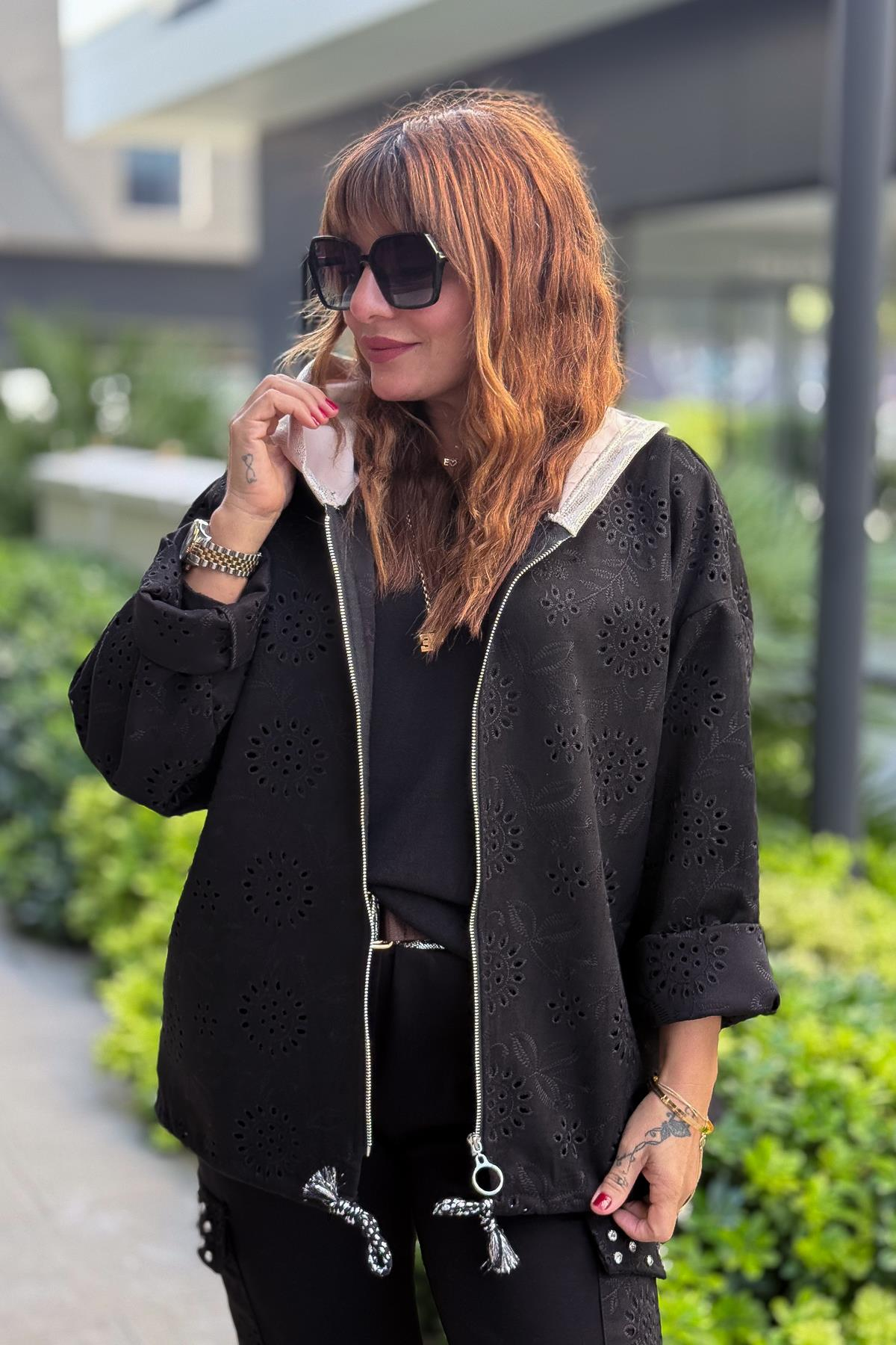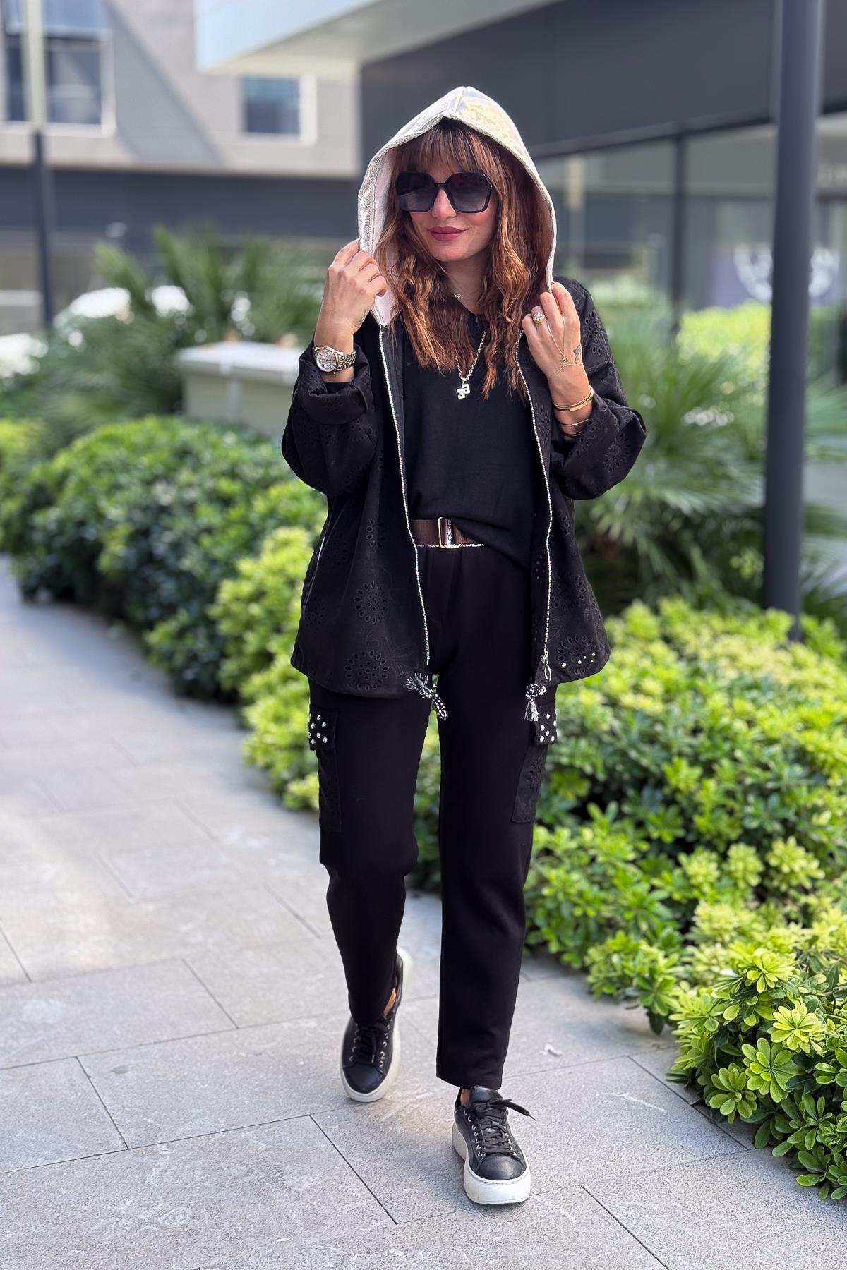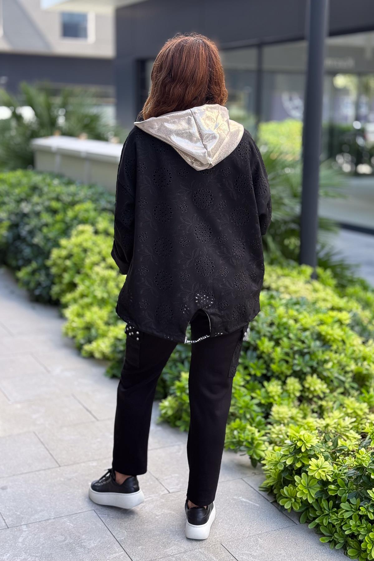 Kapüşonu Laklı Güderi Fistolu Ceket Siyah Renk