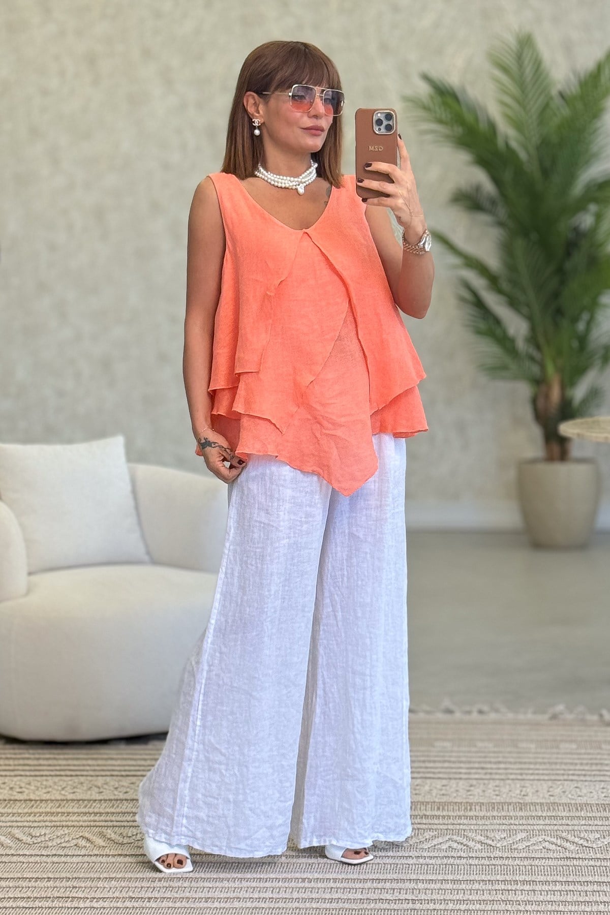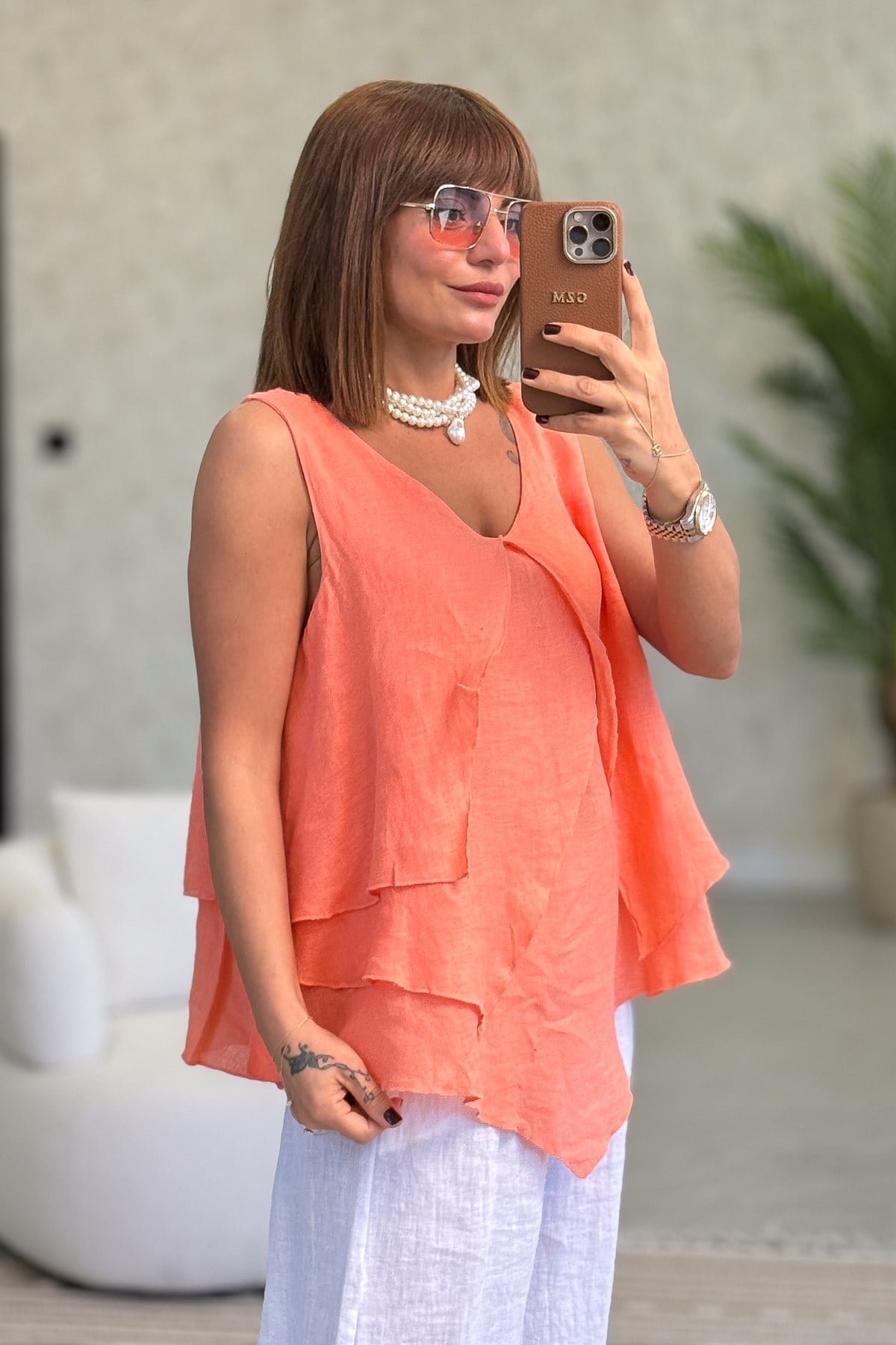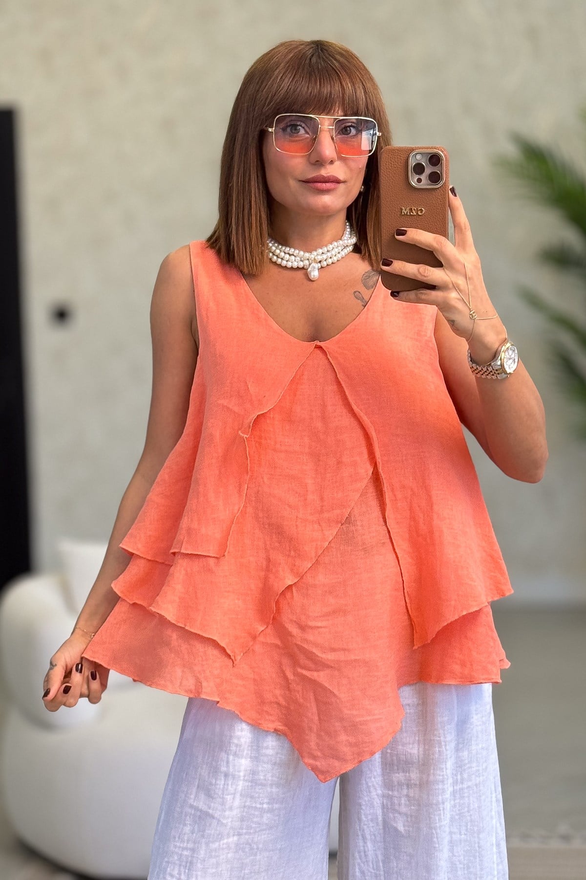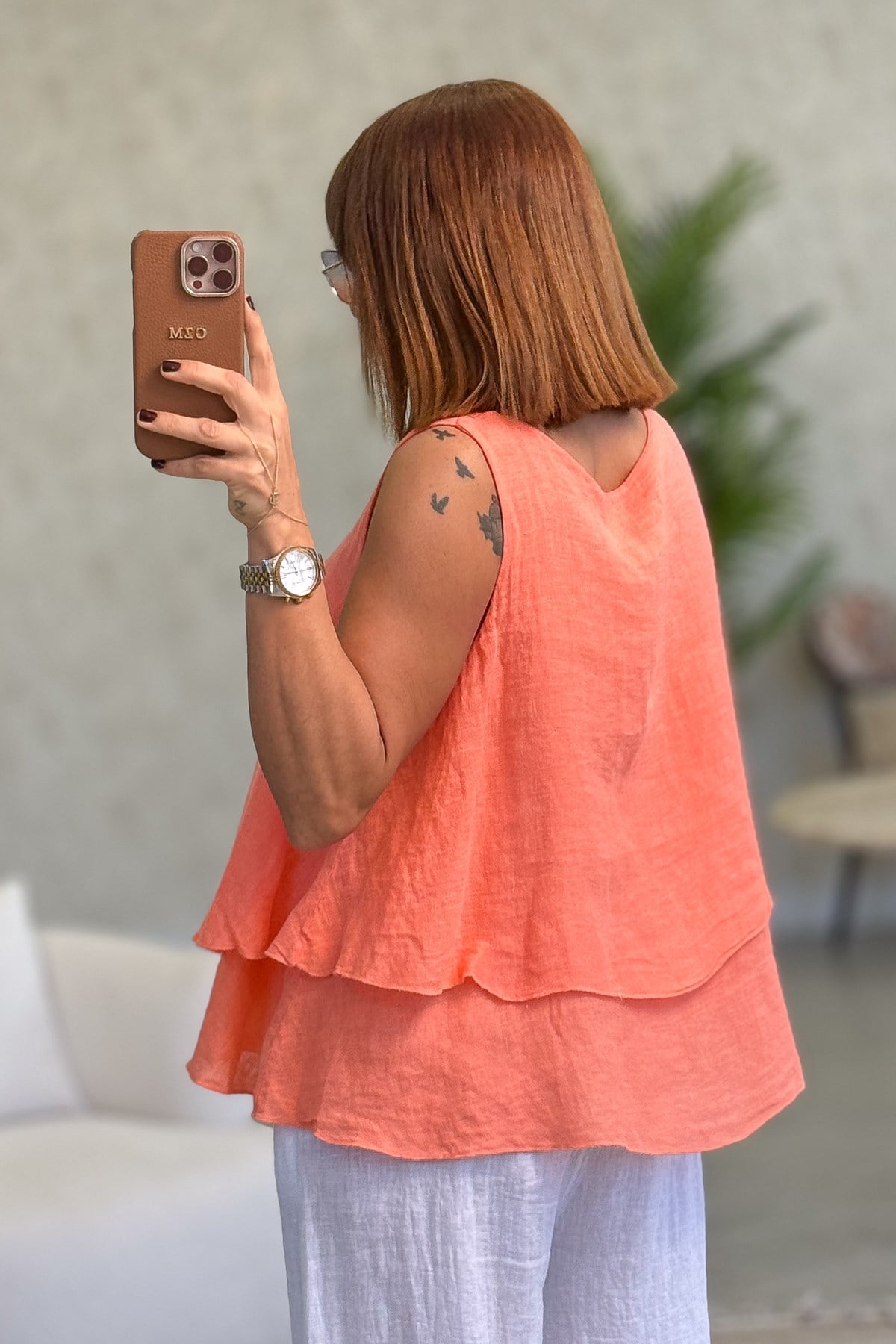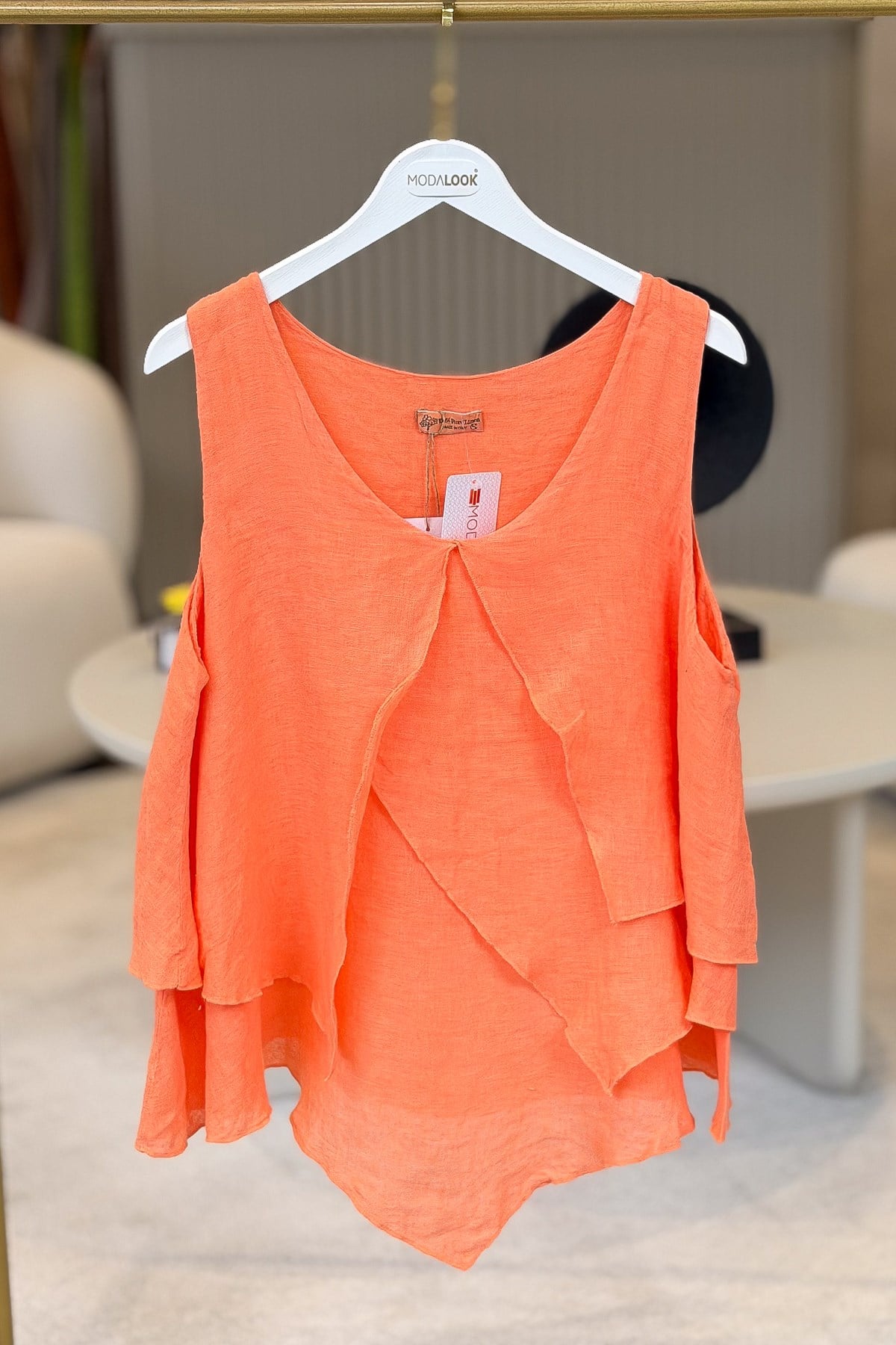 Kat Kat Kalın Askılı Keten Bluz Mercan Renk