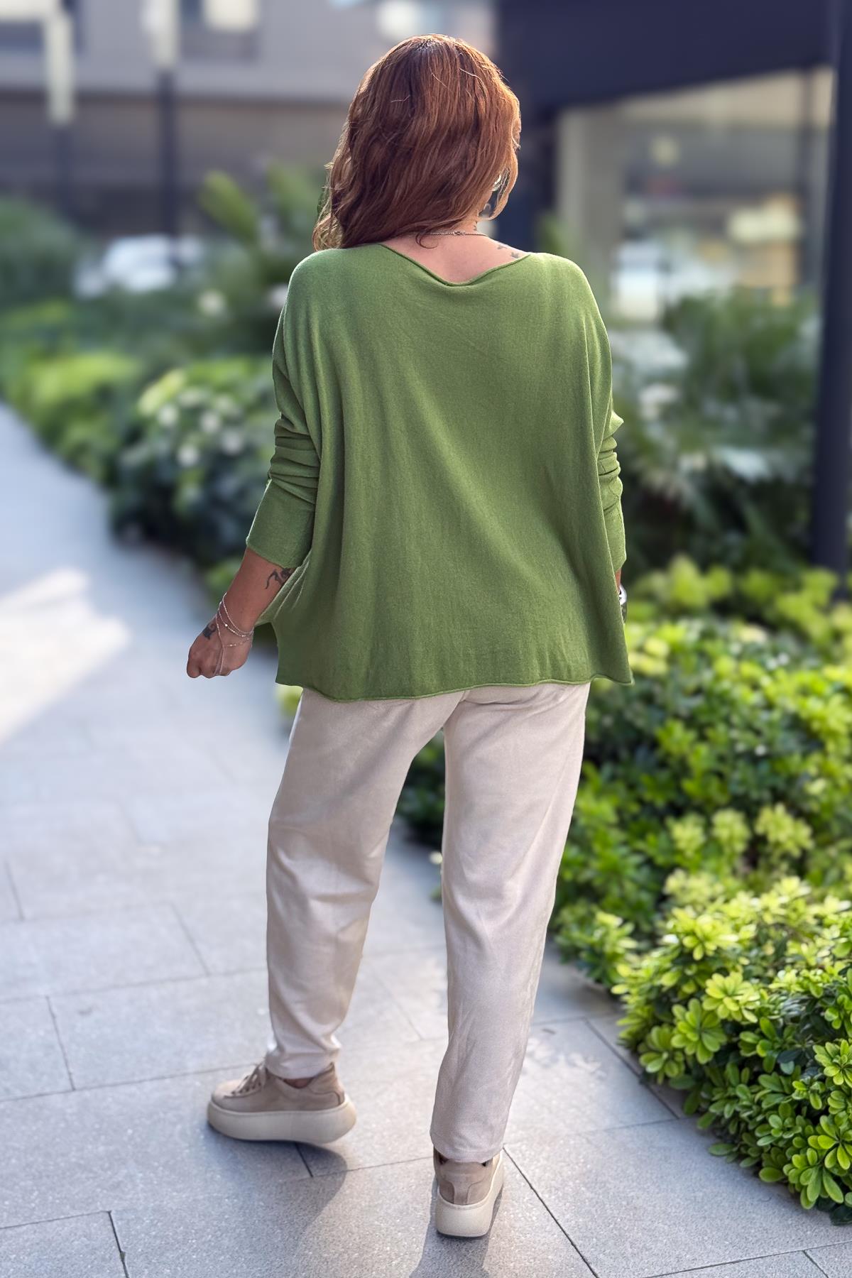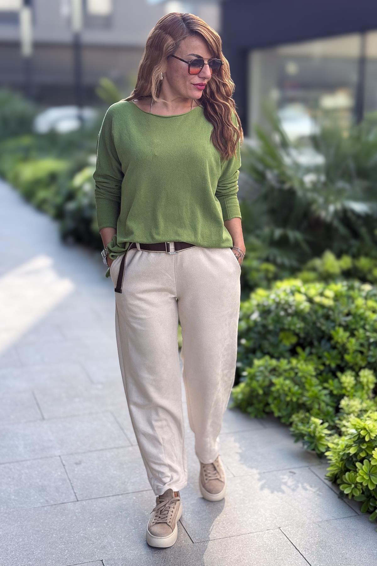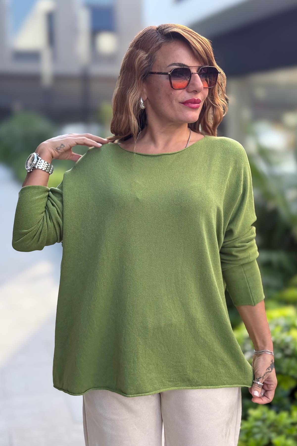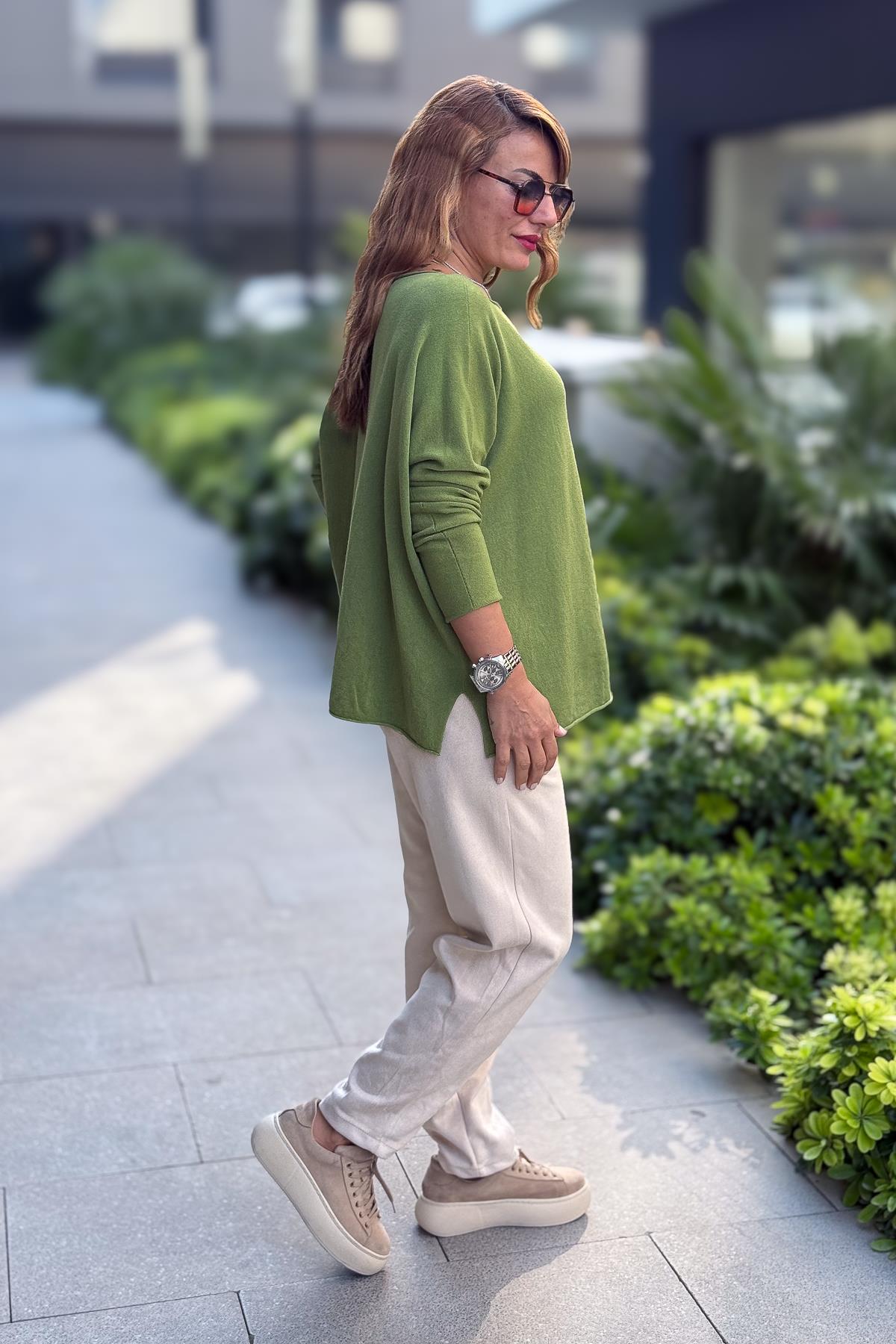 Kayık Yaka Kuzu Yünü Triko Fıstık Yeşil Renk