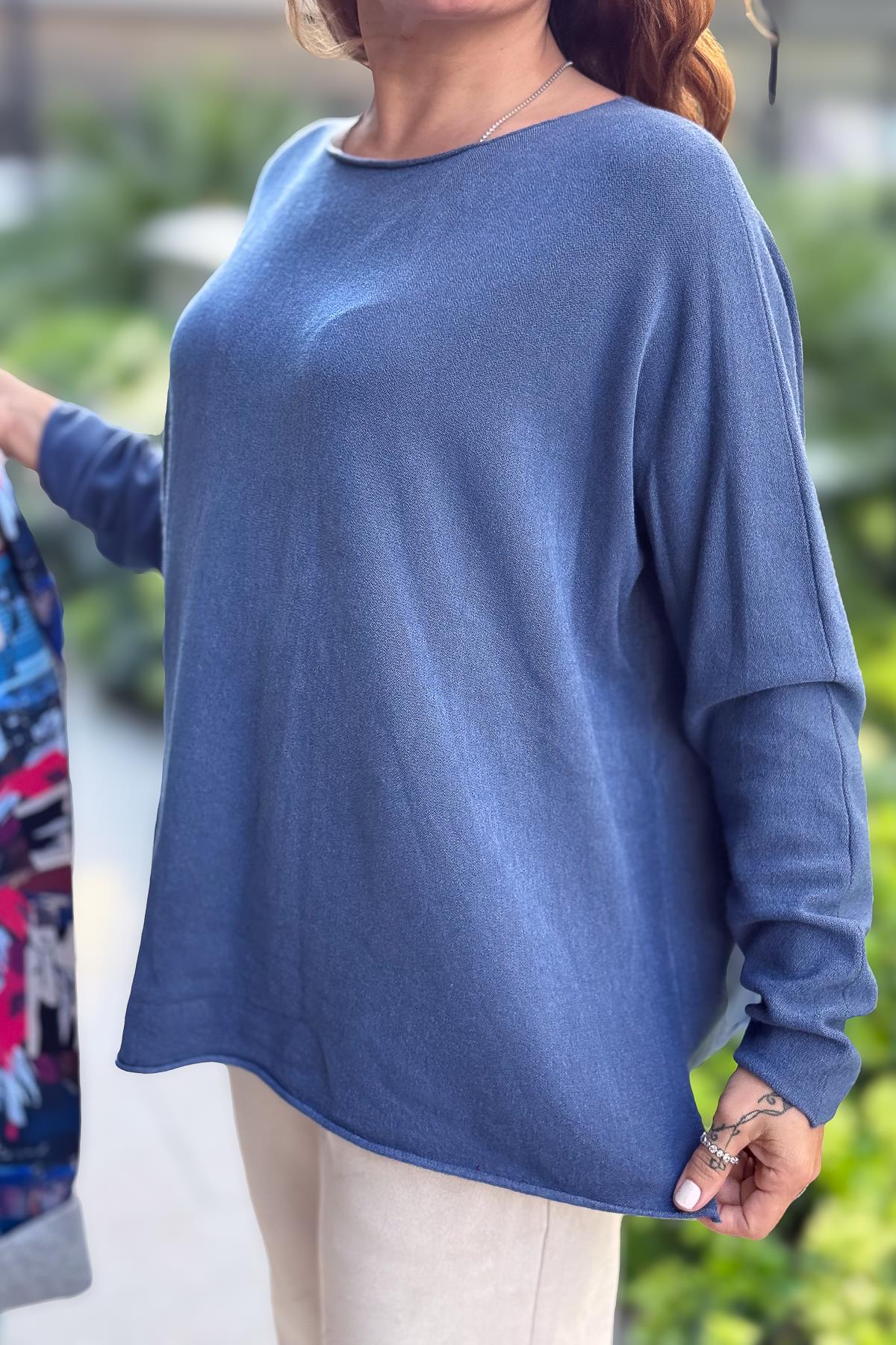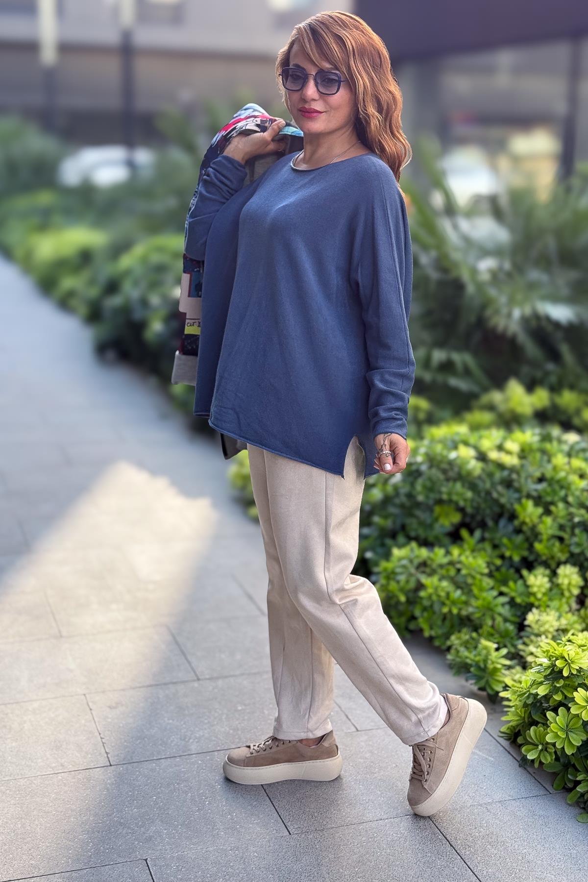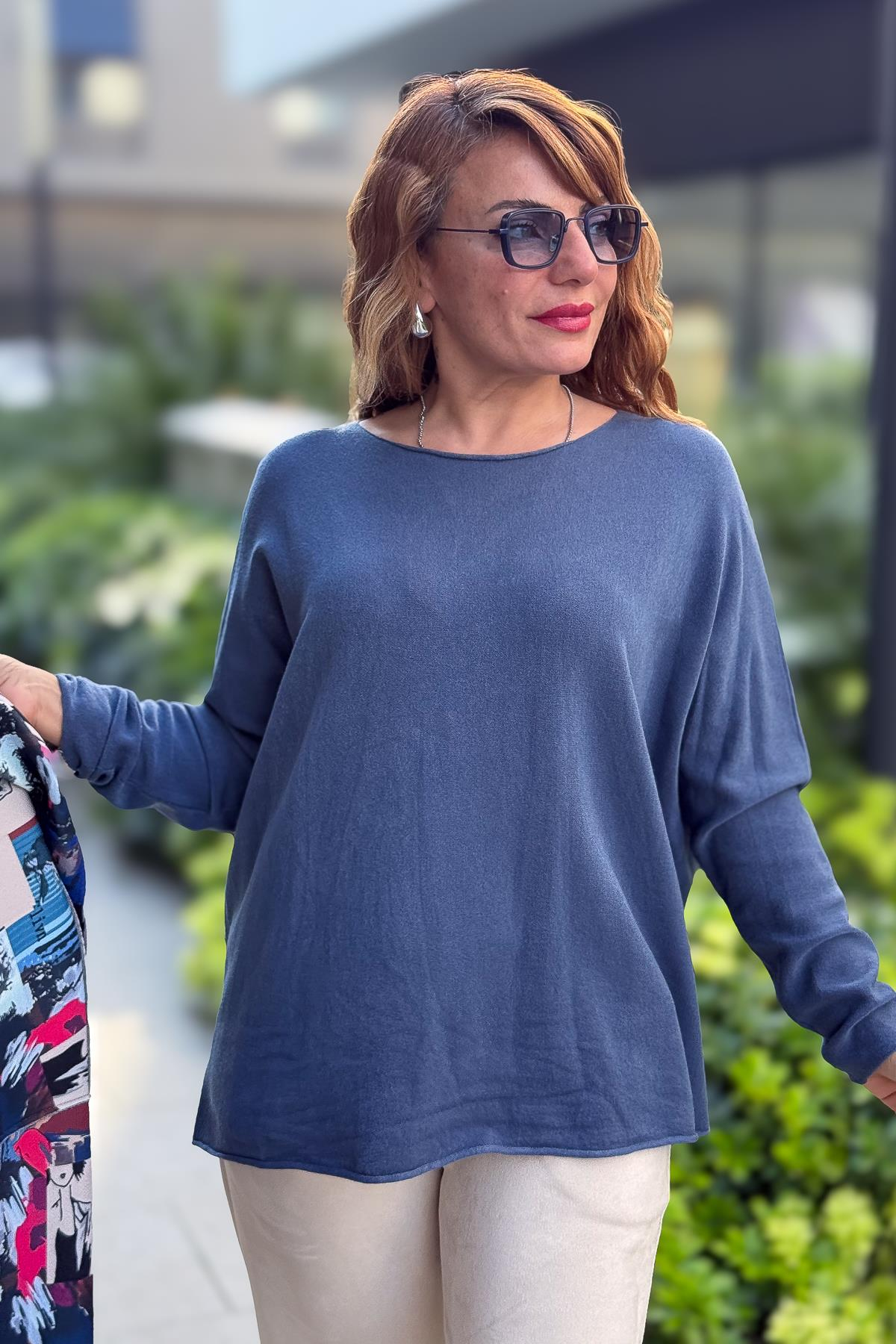 Kayık Yaka Kuzu Yünü Triko İndigo Renk