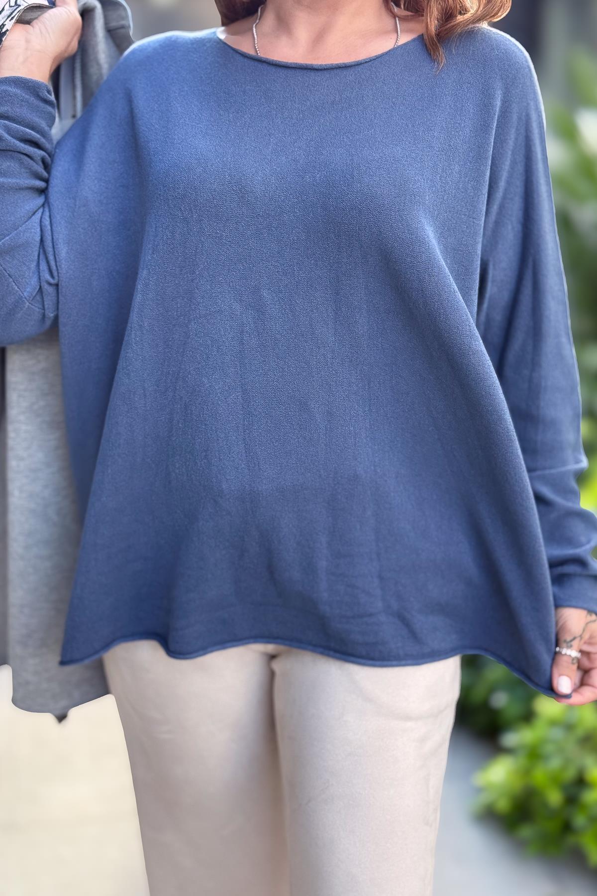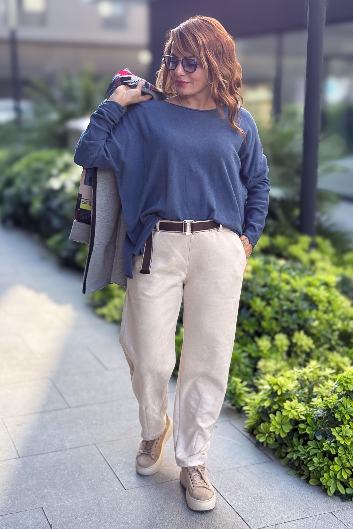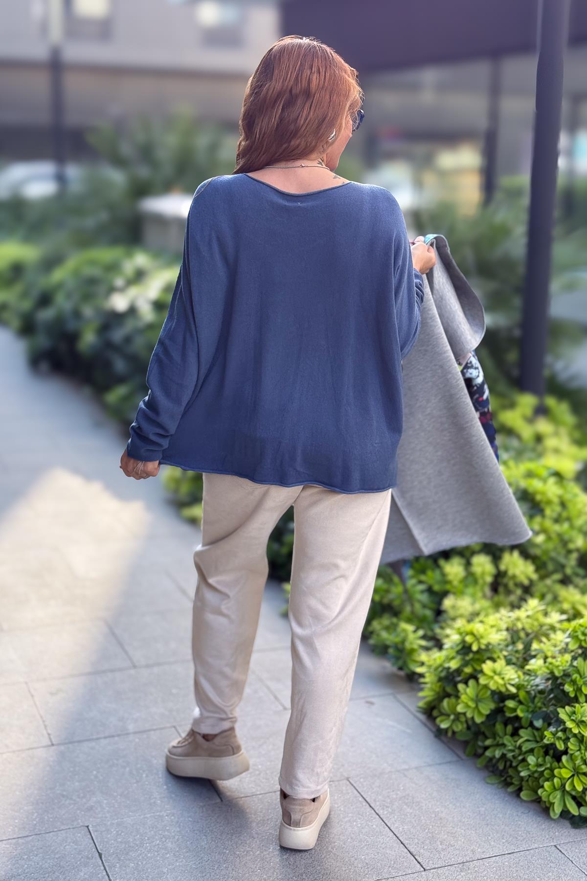 Kayık Yaka Kuzu Yünü Triko İndigo Renk