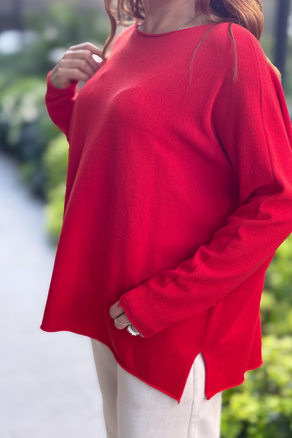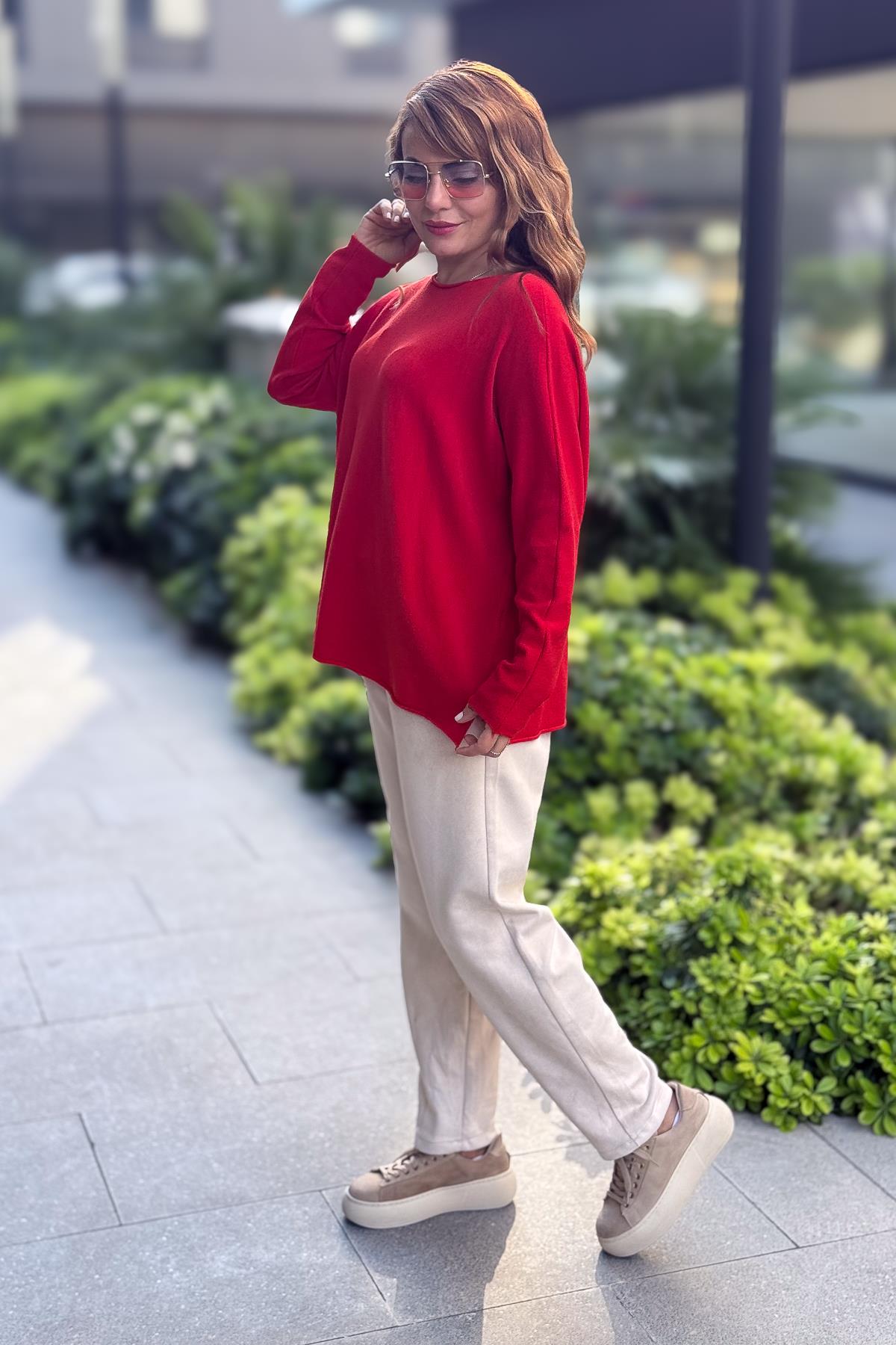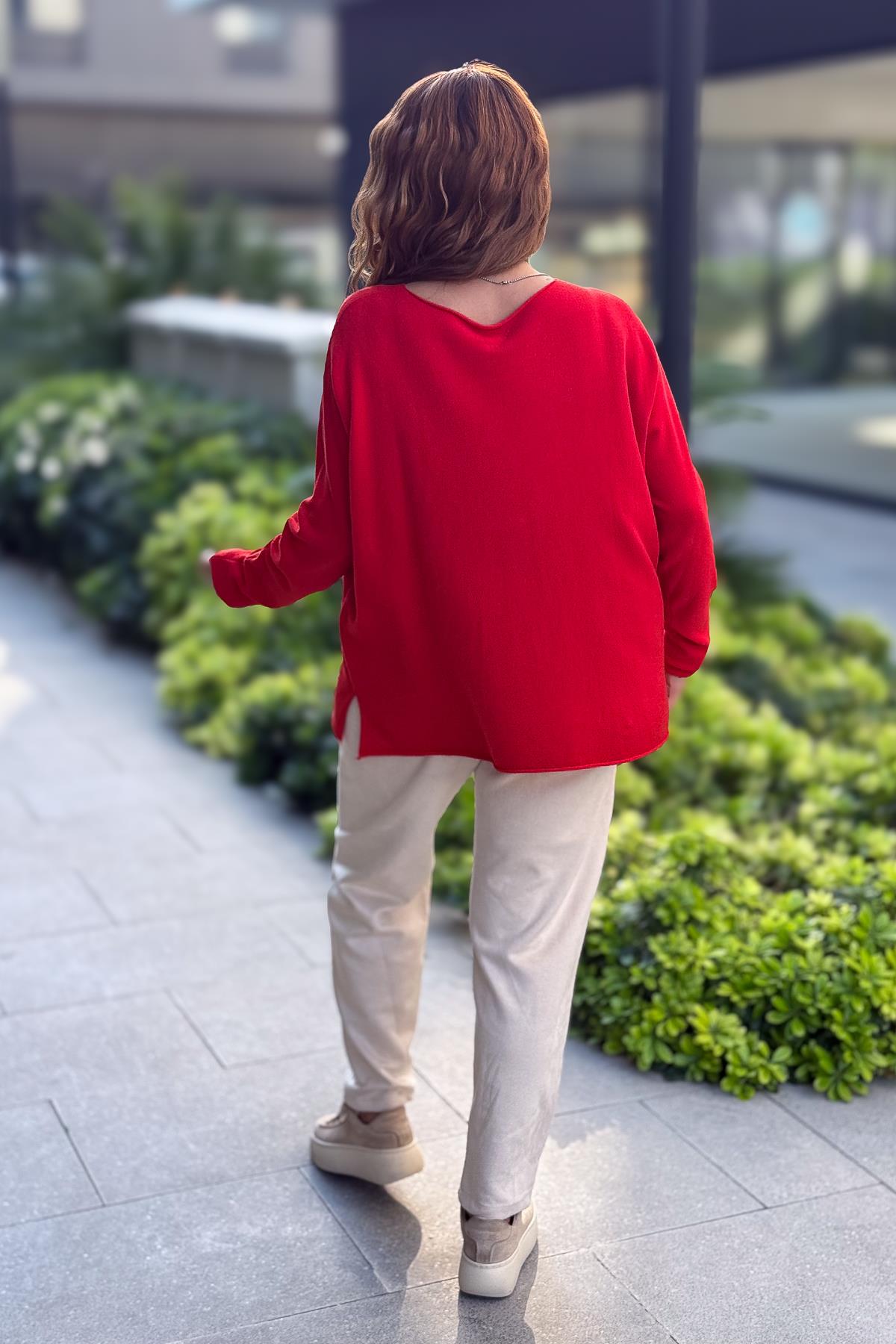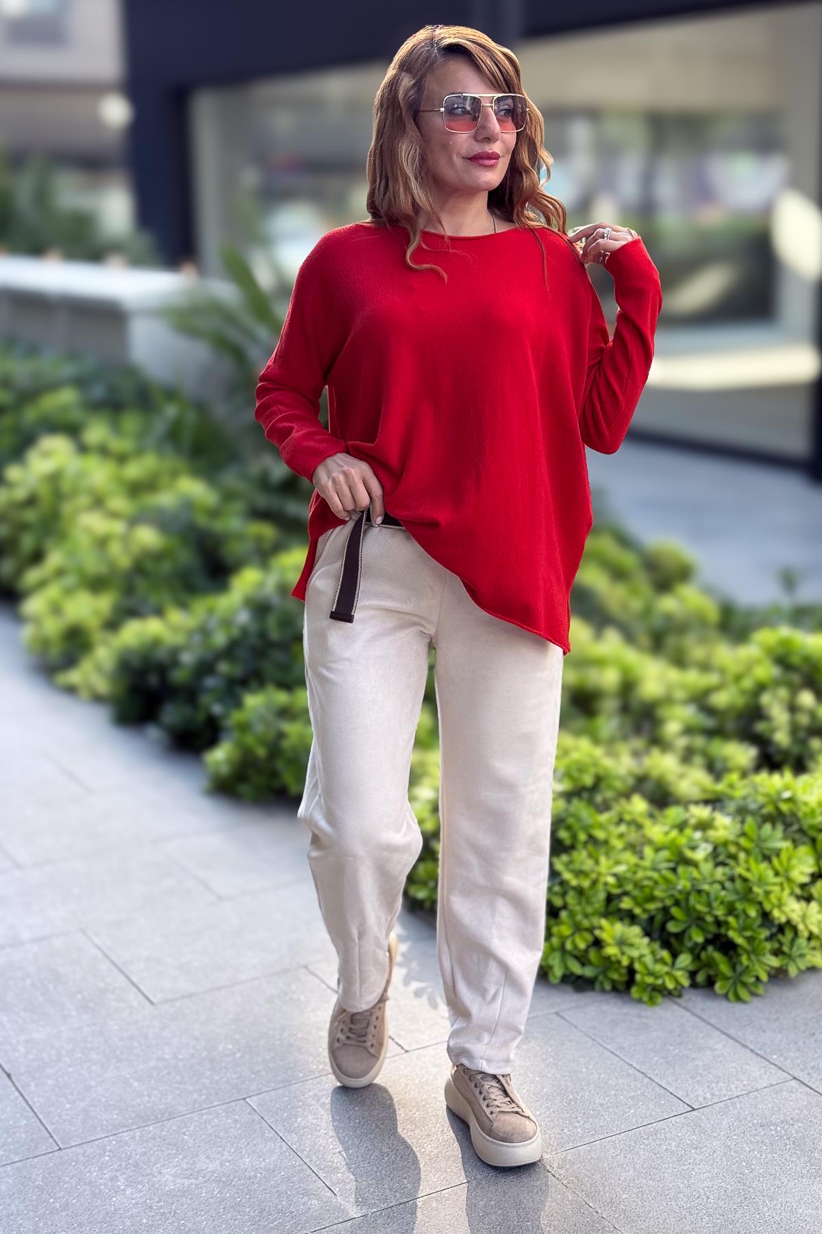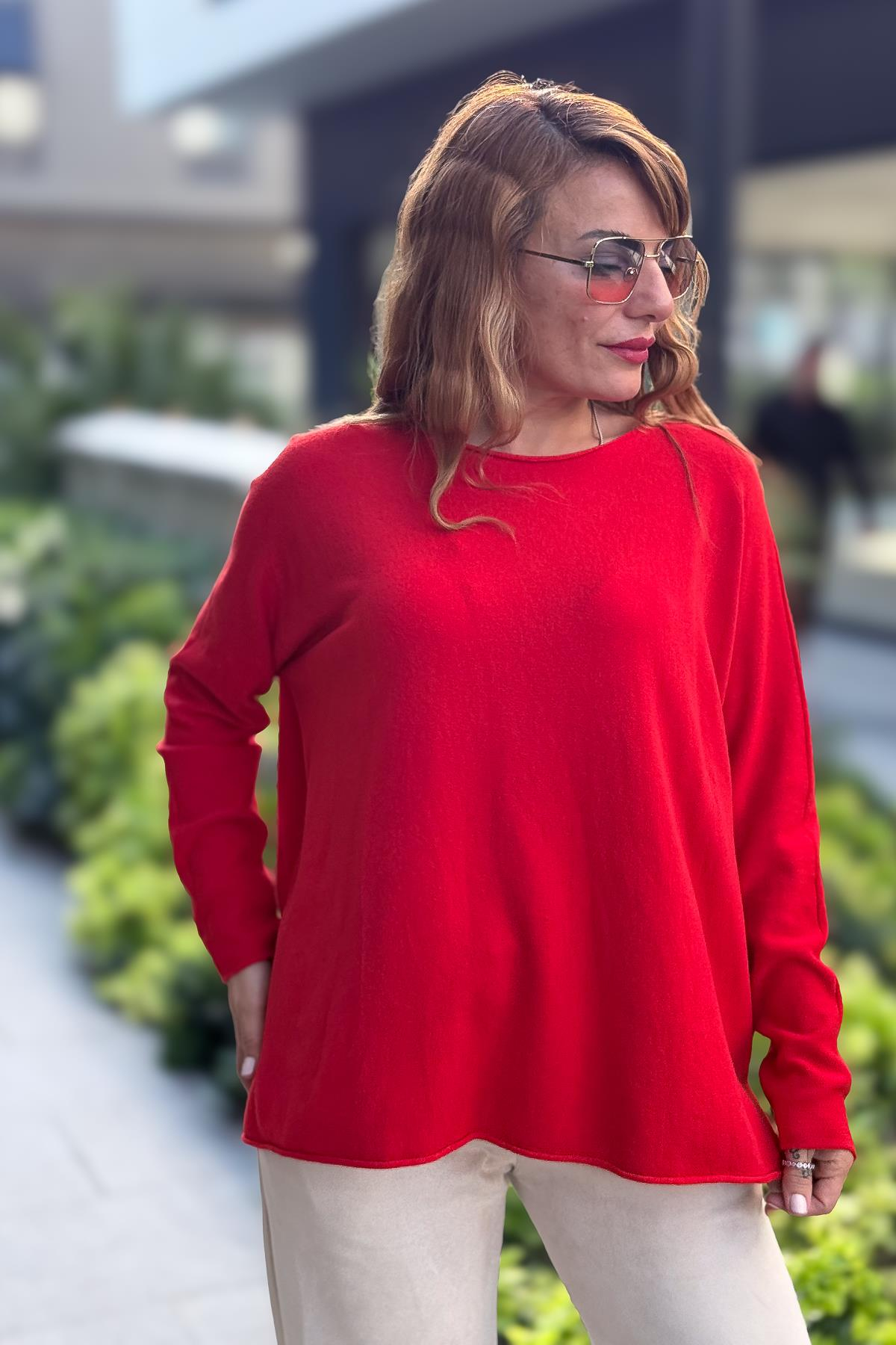 Kayık Yaka Kuzu Yünü Triko Kırmızı Renk
