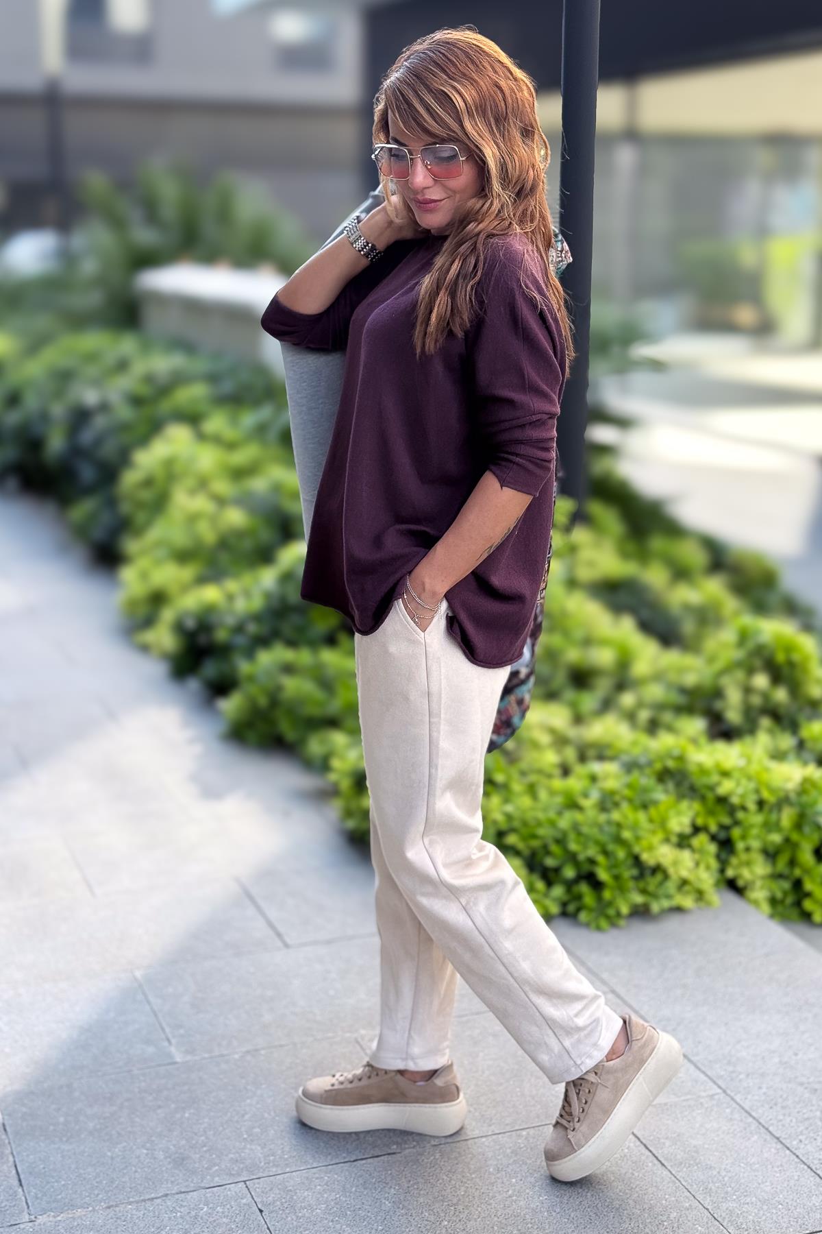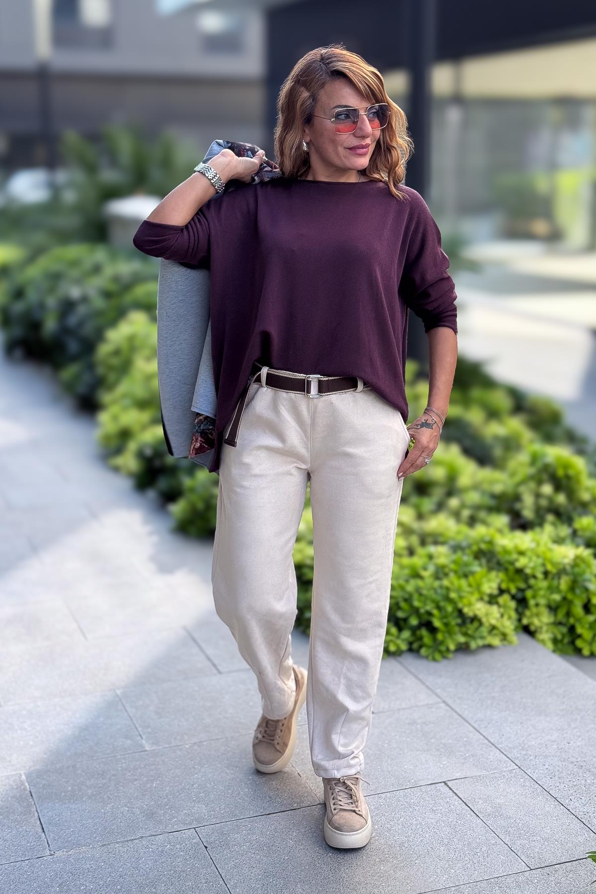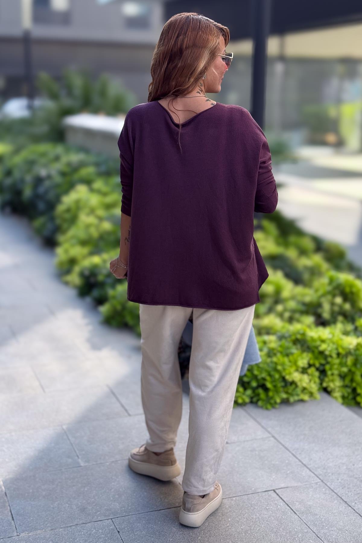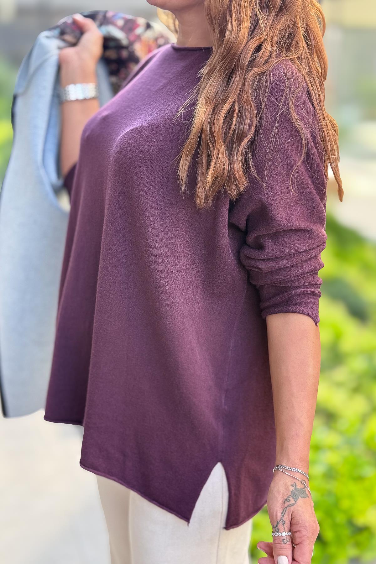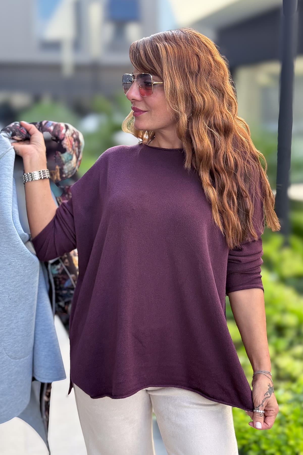 Kayık Yaka Kuzu Yünü Triko Mürdüm Renk