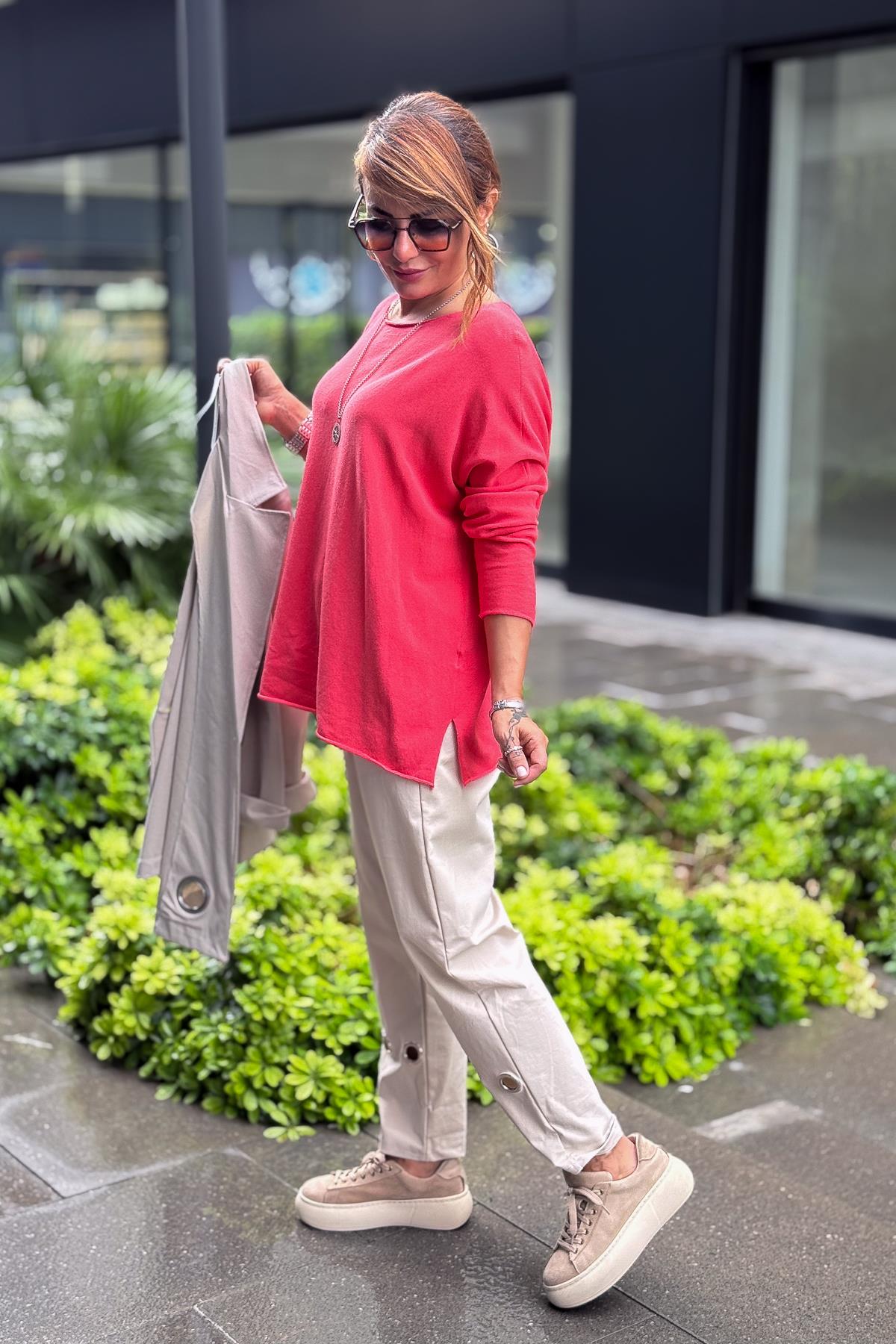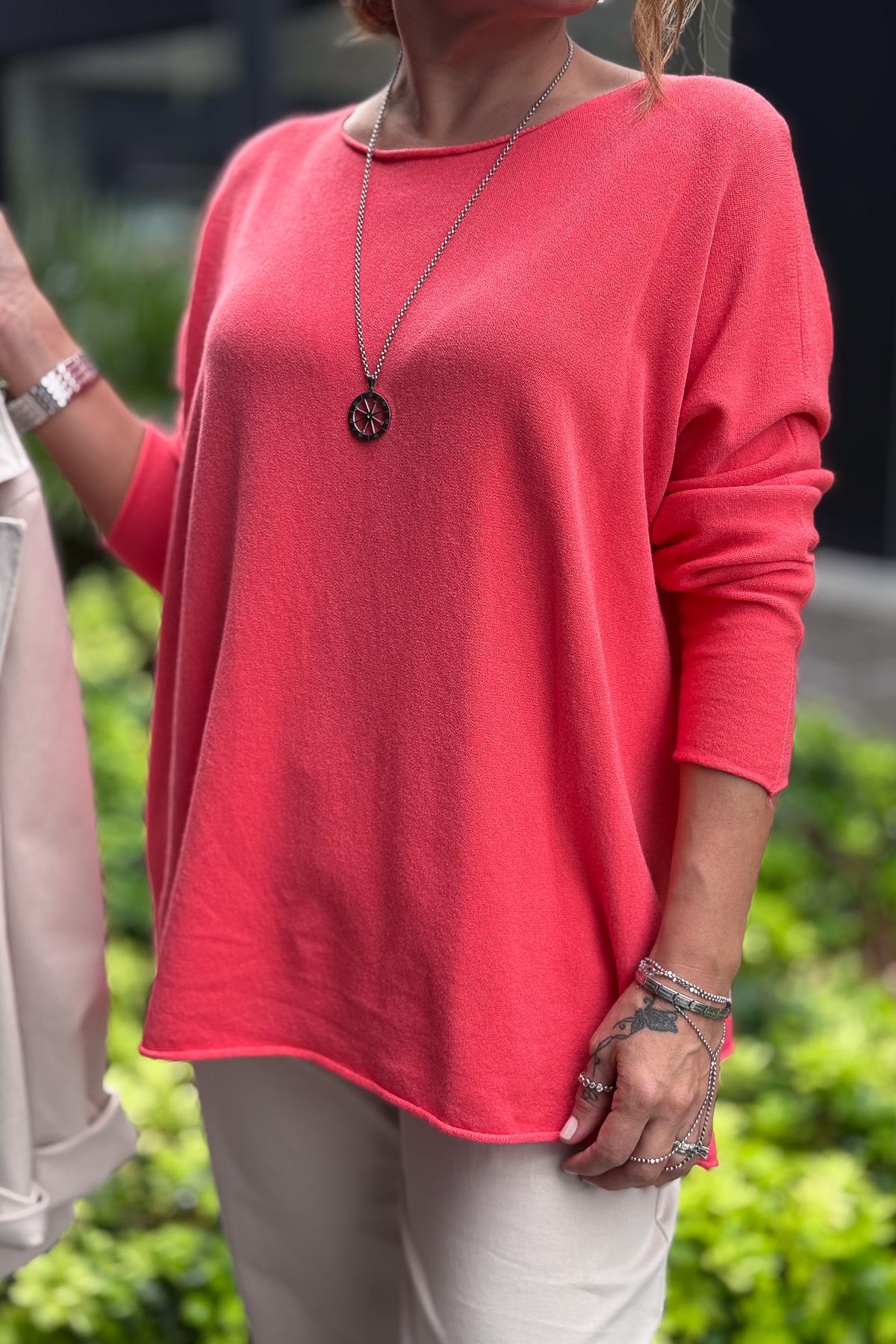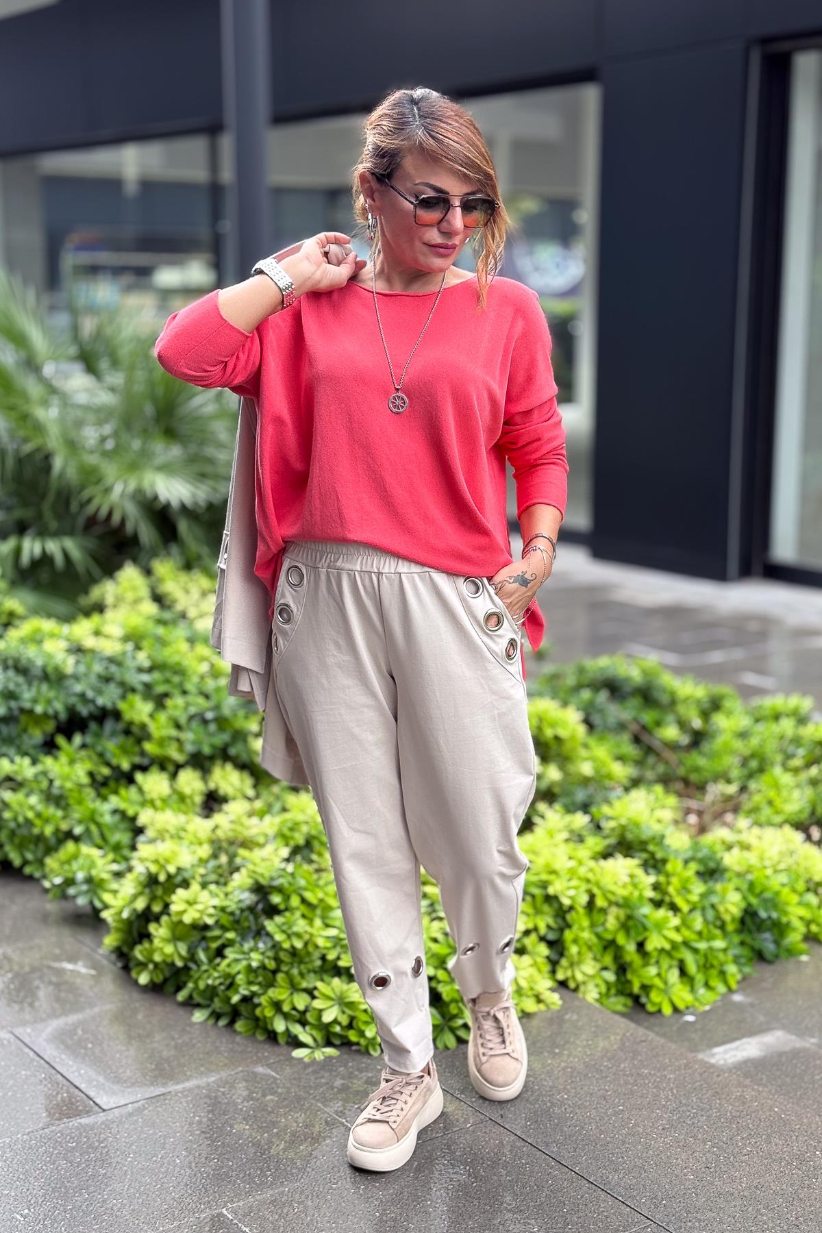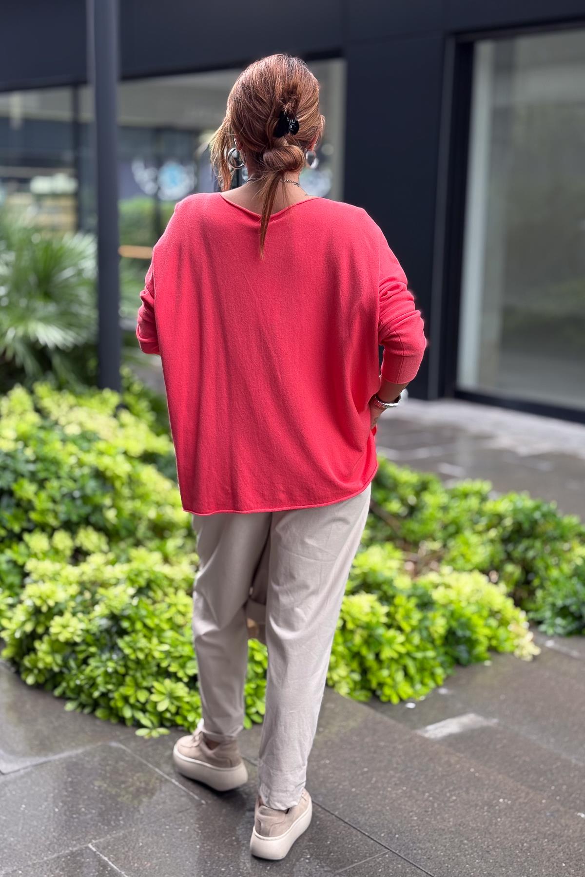 Kayık Yaka Kuzu Yünü Triko Nar Çiçeği Renk