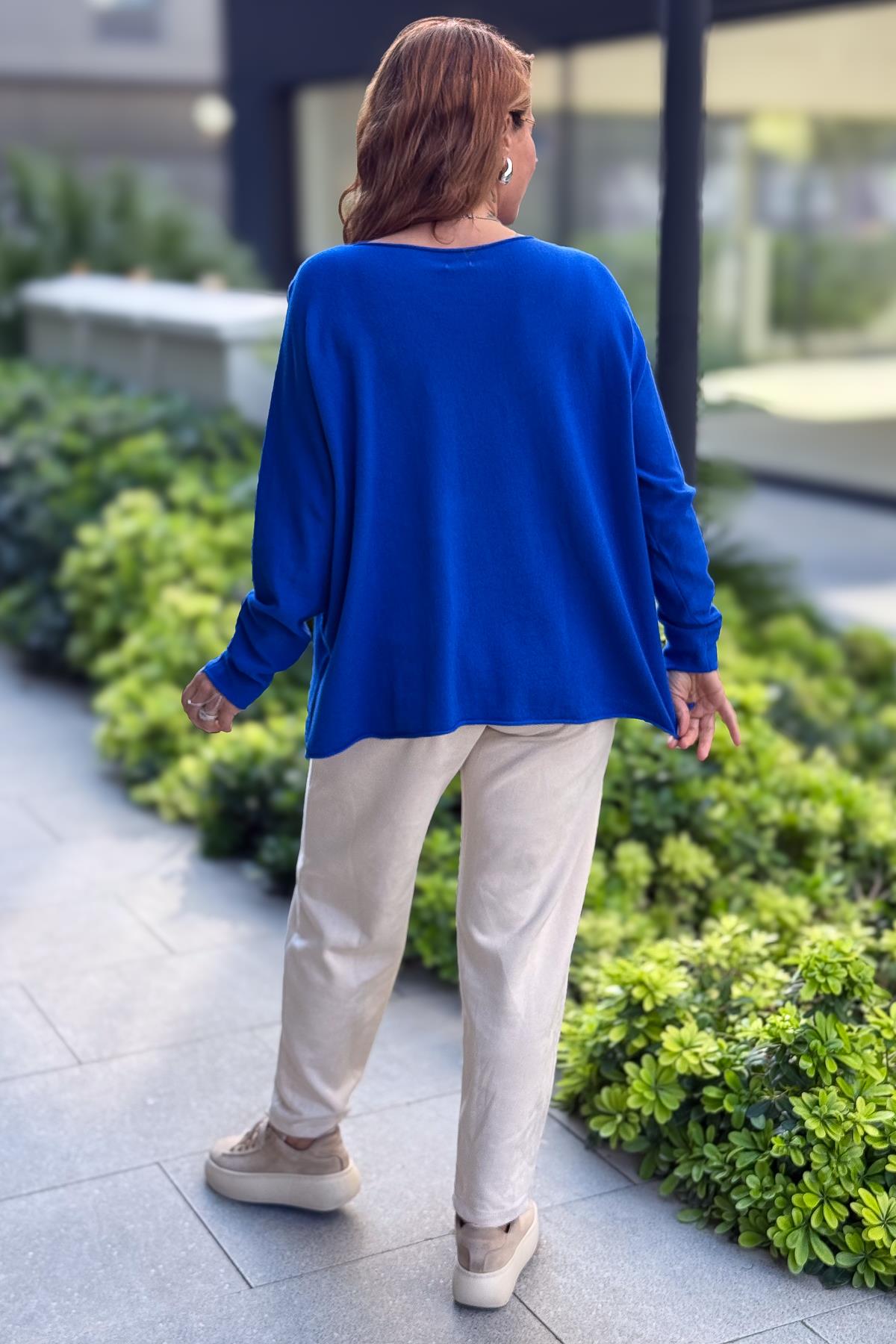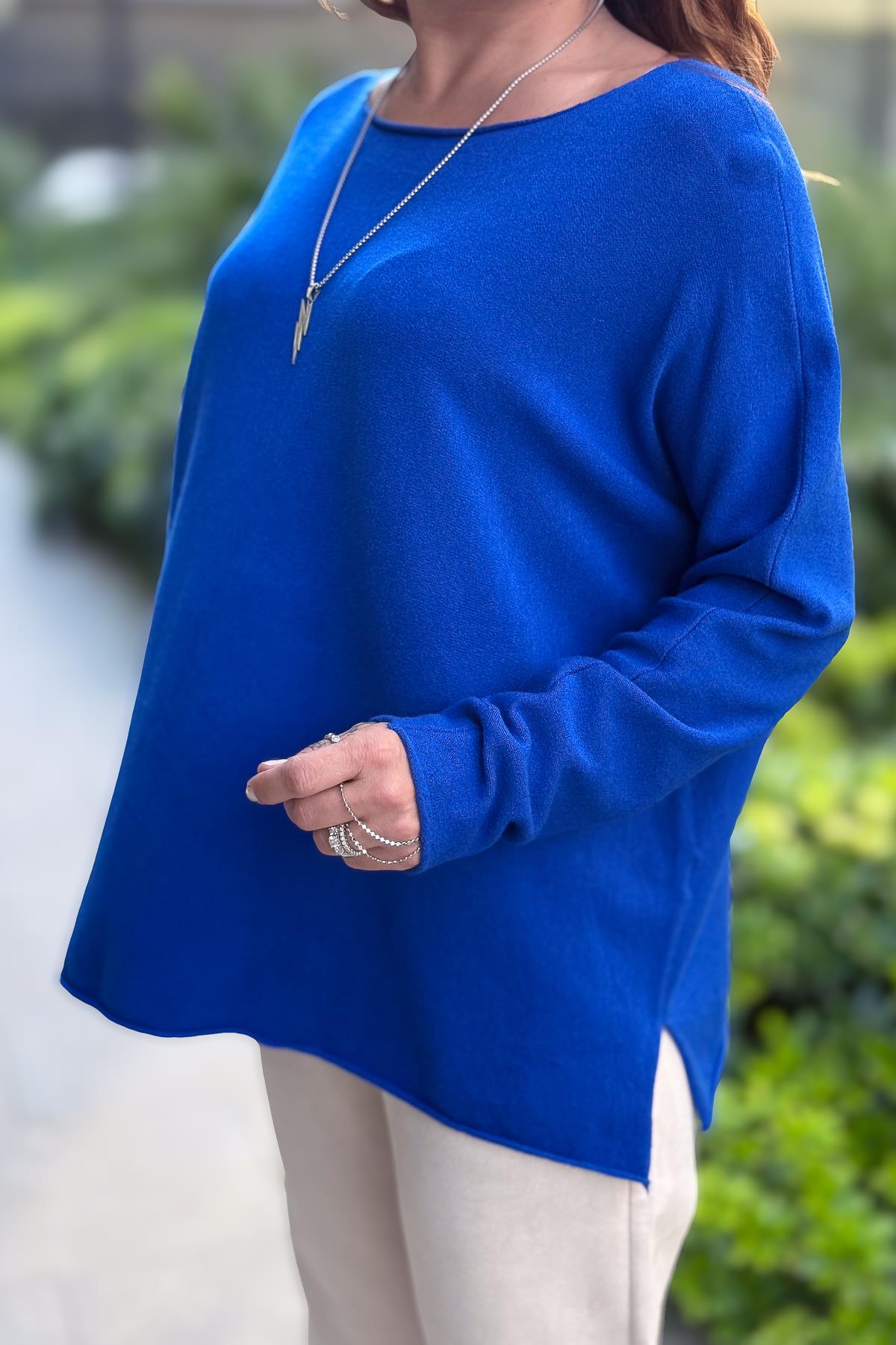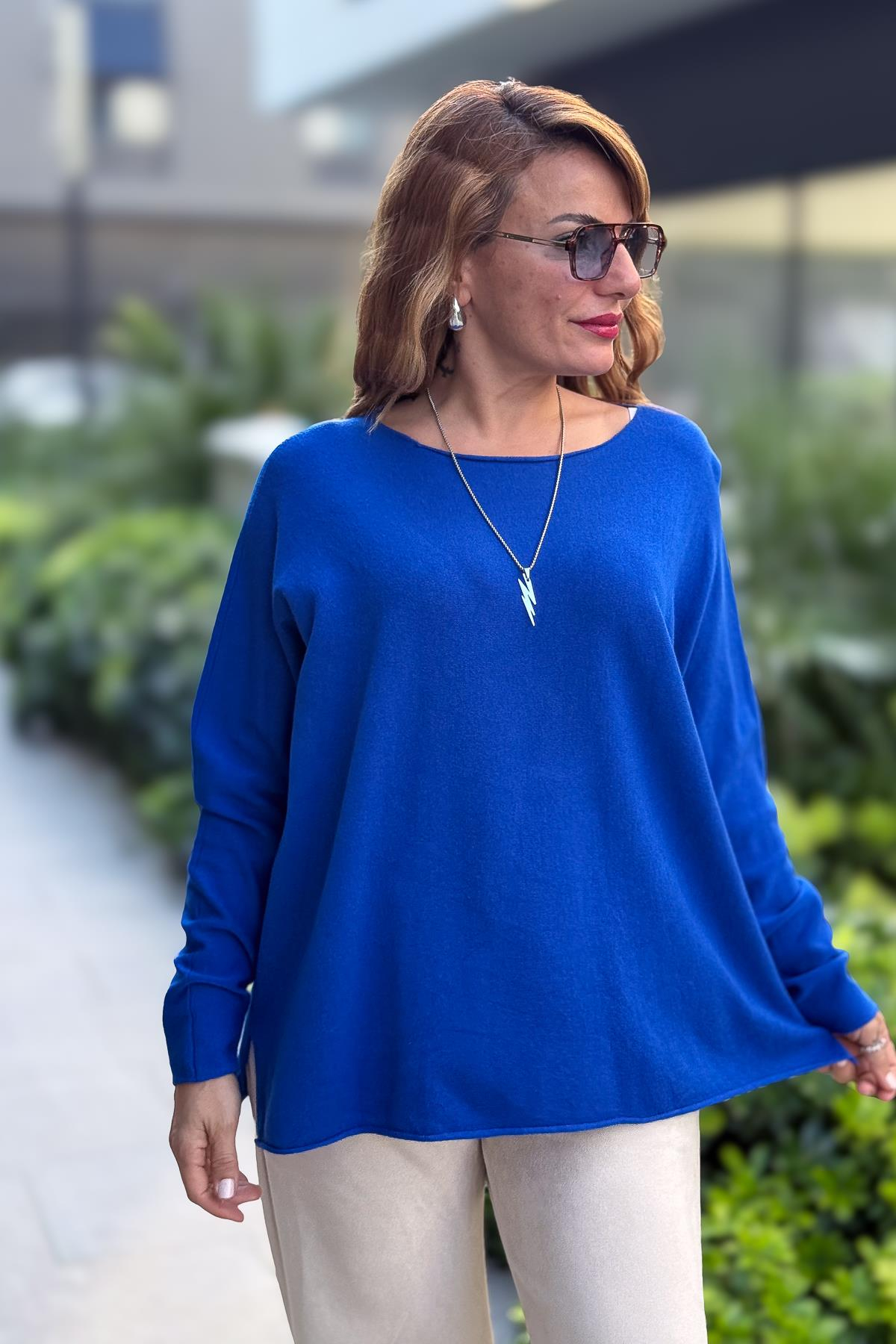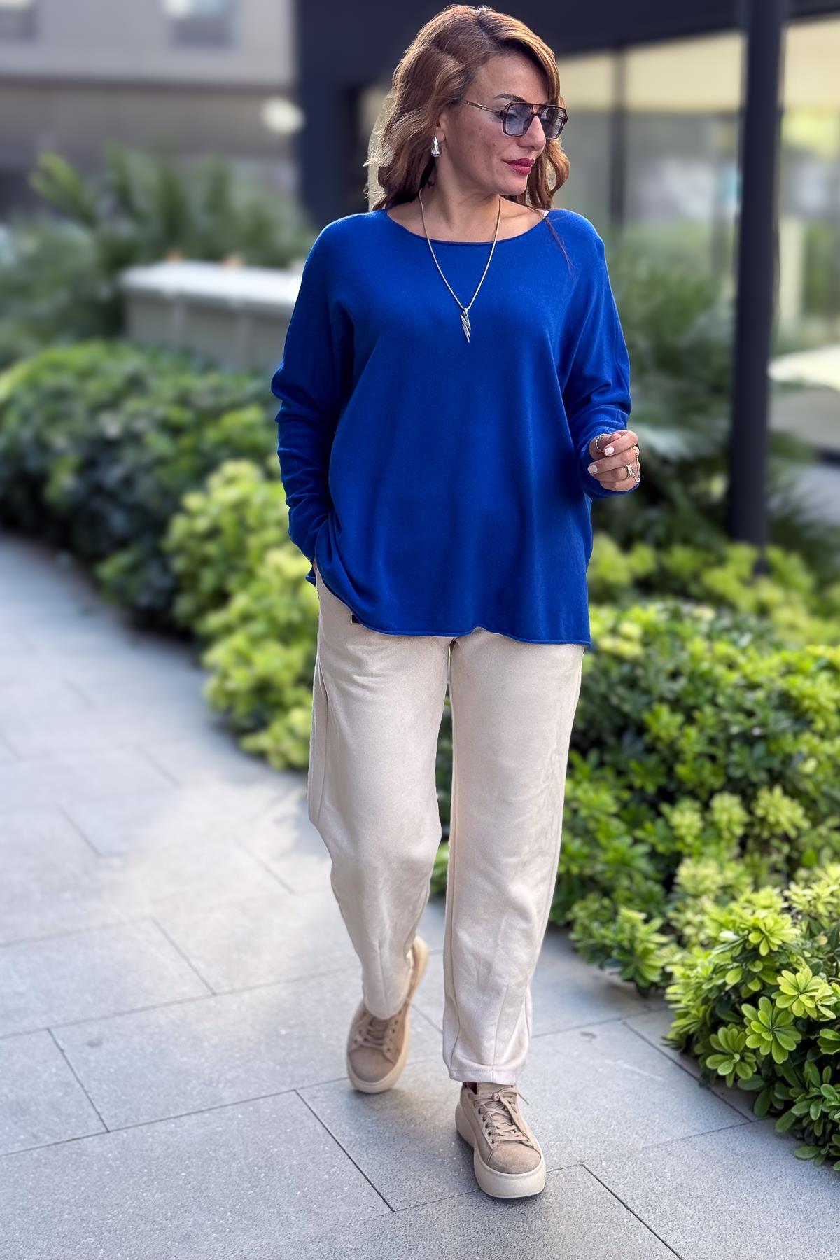 Kayık Yaka Kuzu Yünü Triko Saks Renk
