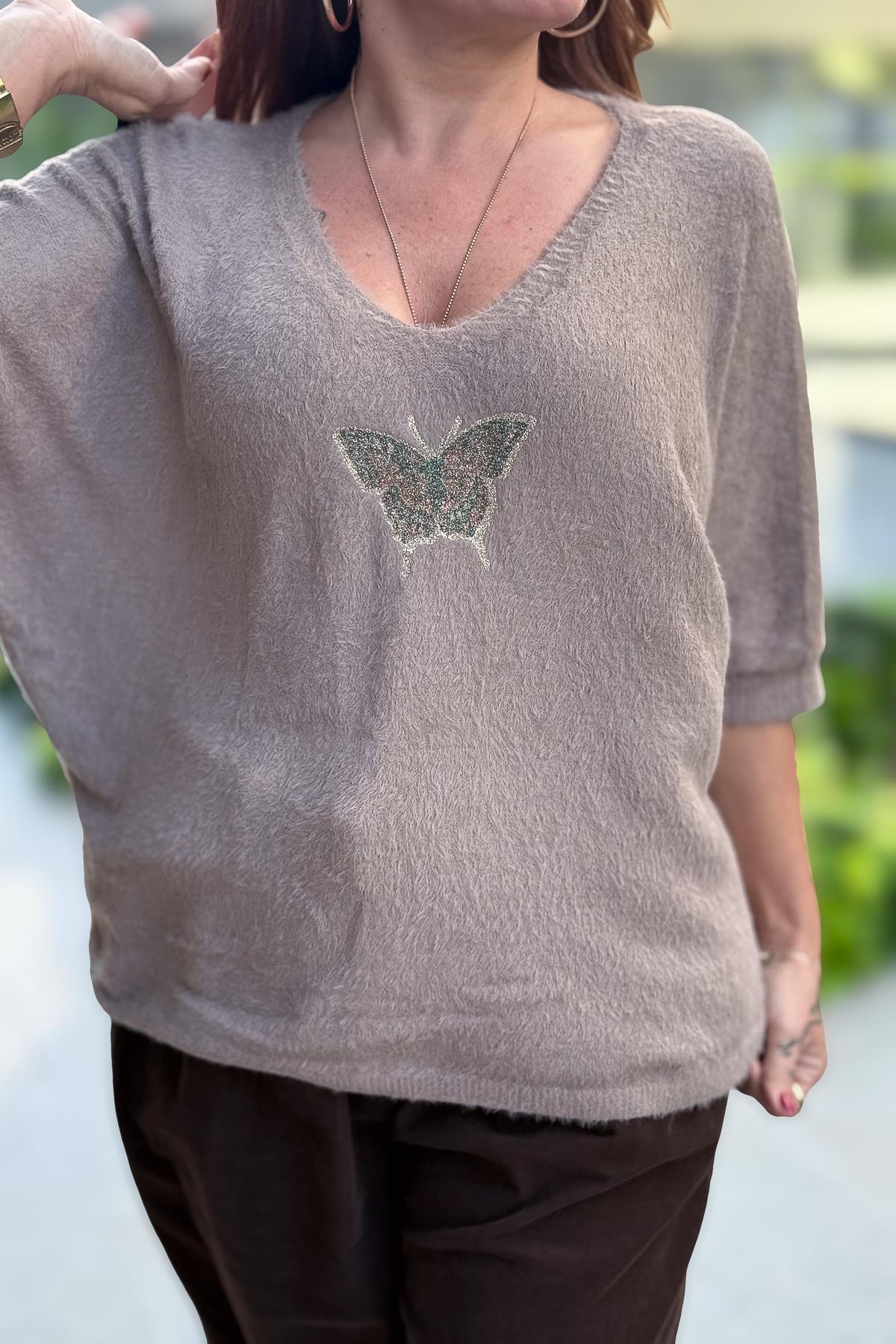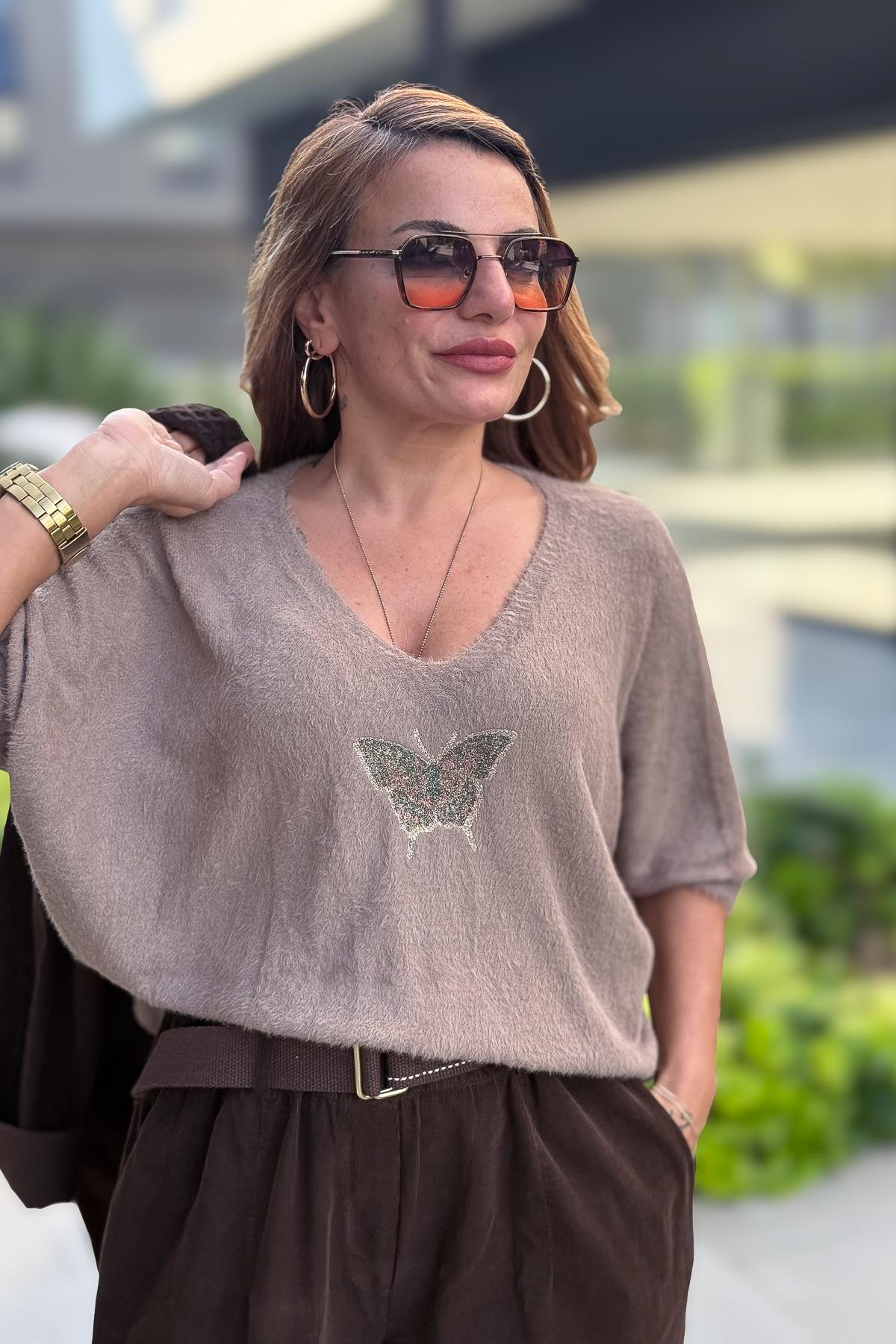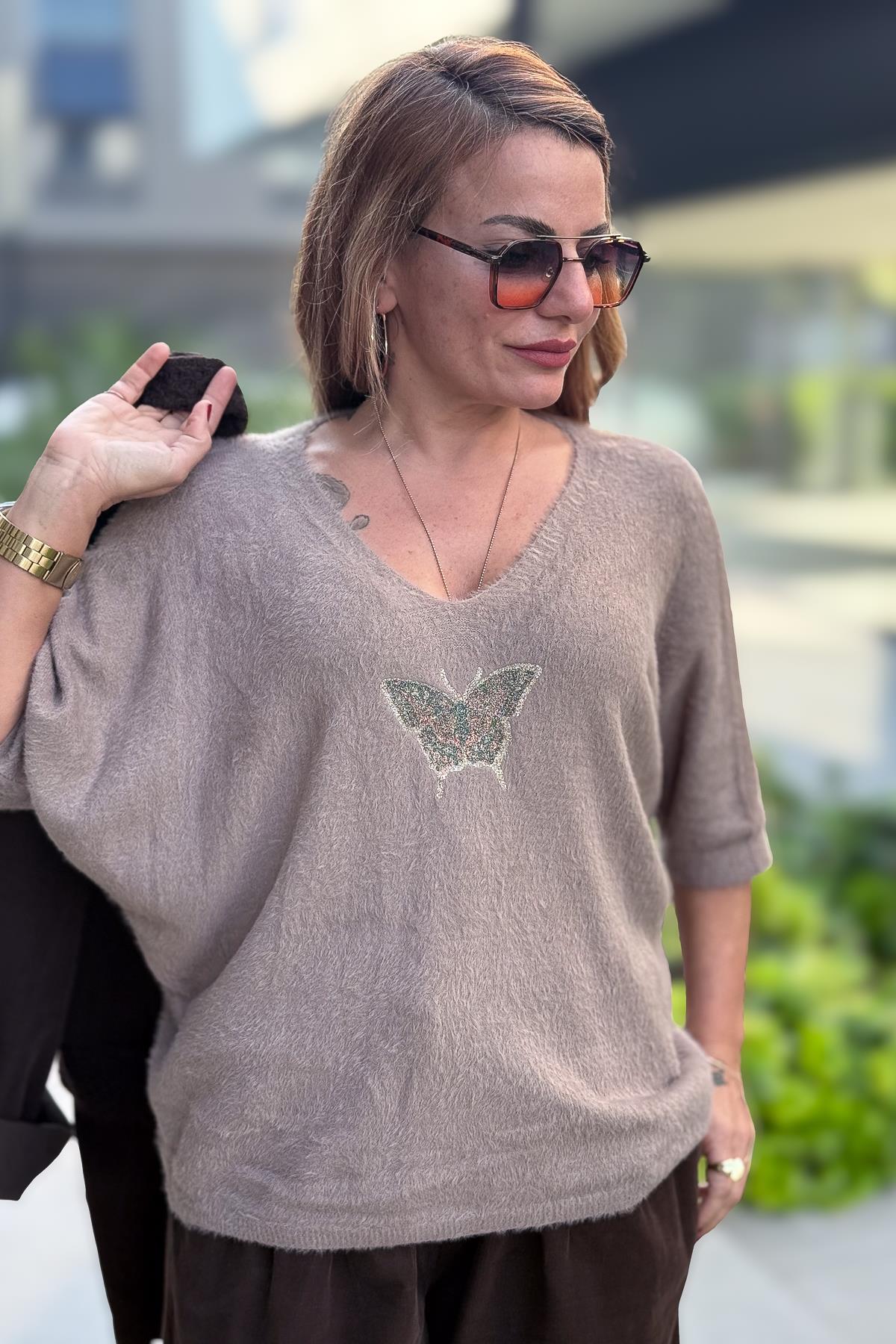 Kelebek Baskılı Yarım Kol Angora Kazak Vizon Renk