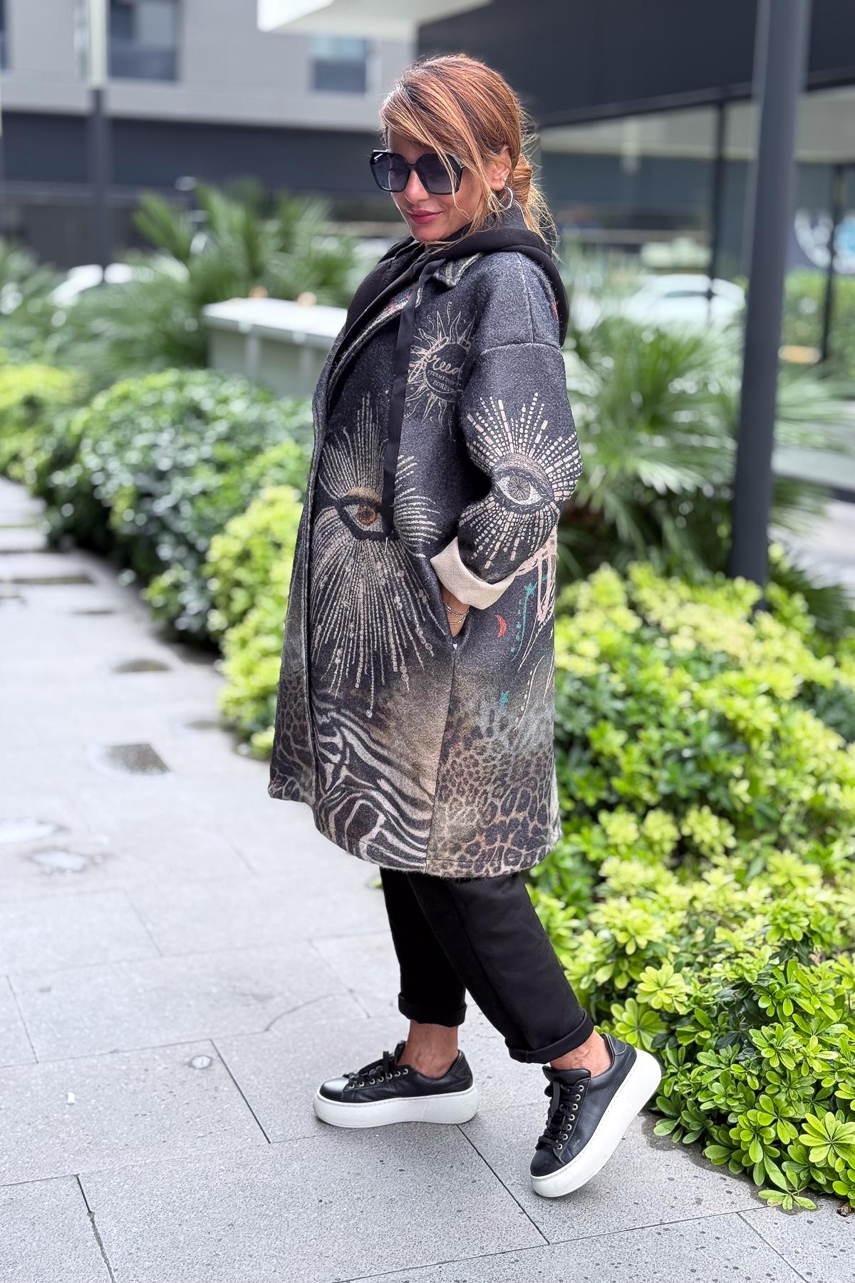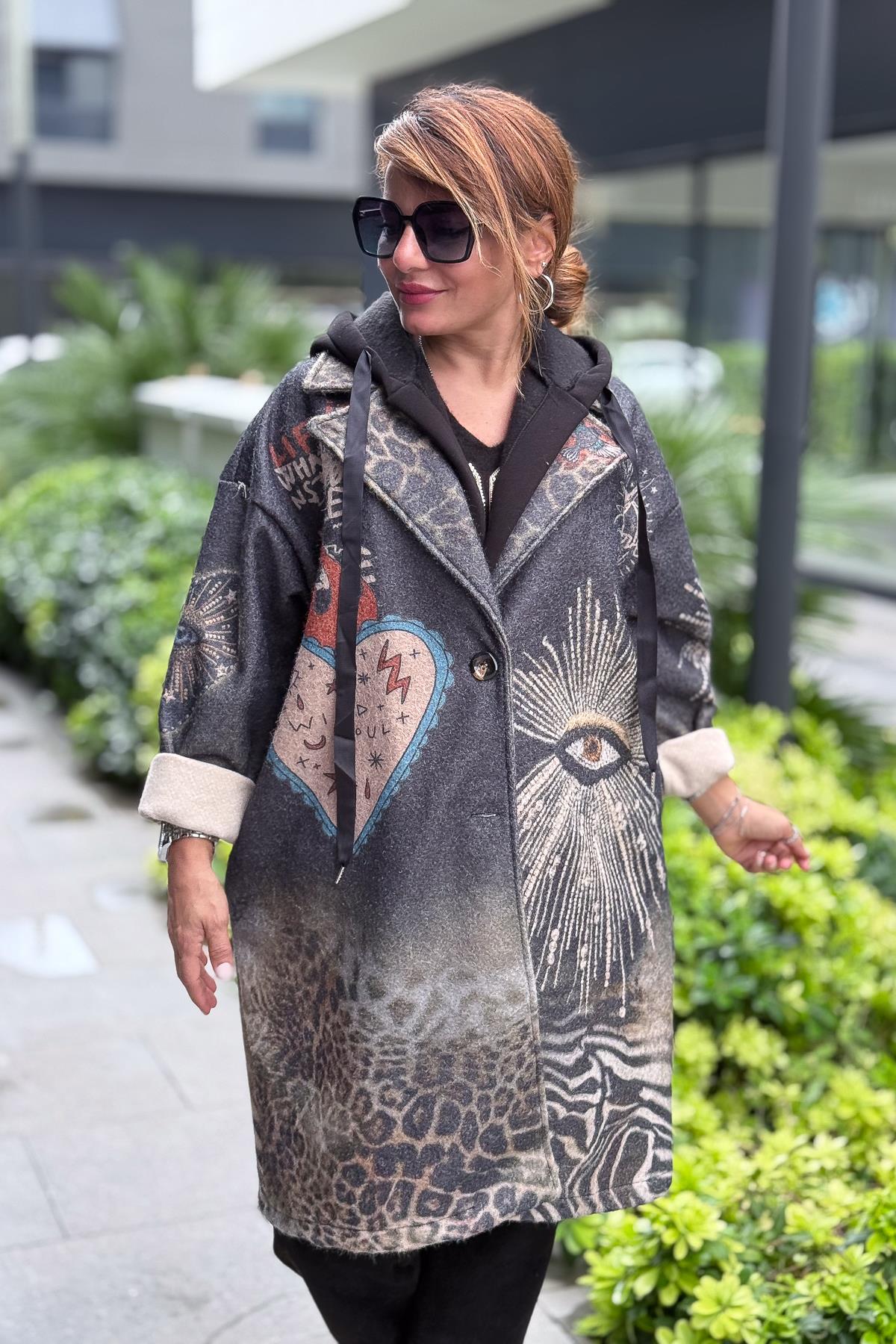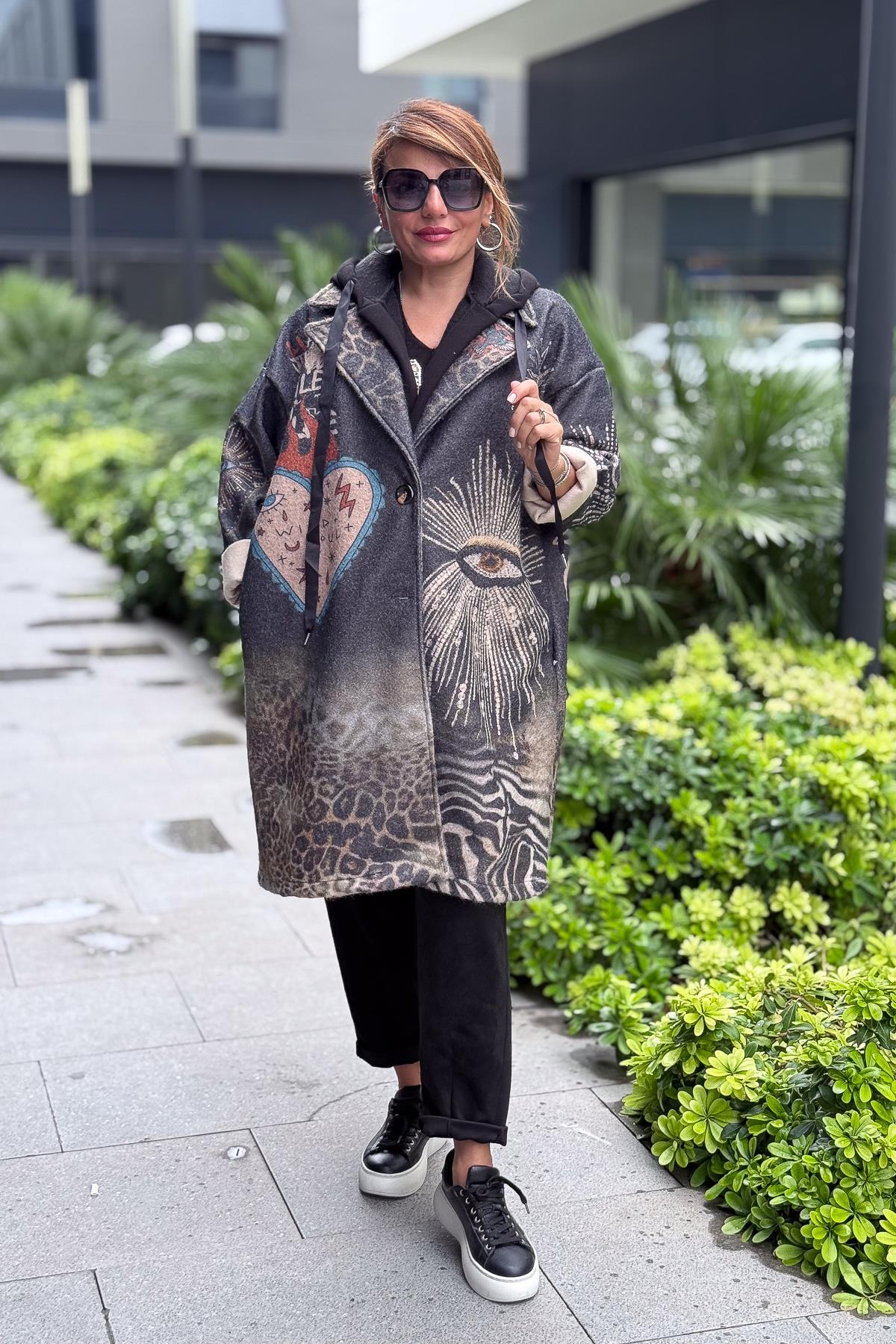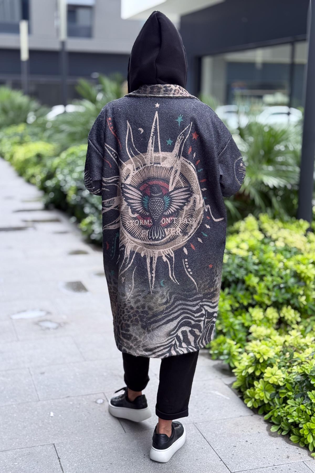Kuş Desenli Kapüşonlu Uzun Keçe Kaban Antresit Renk