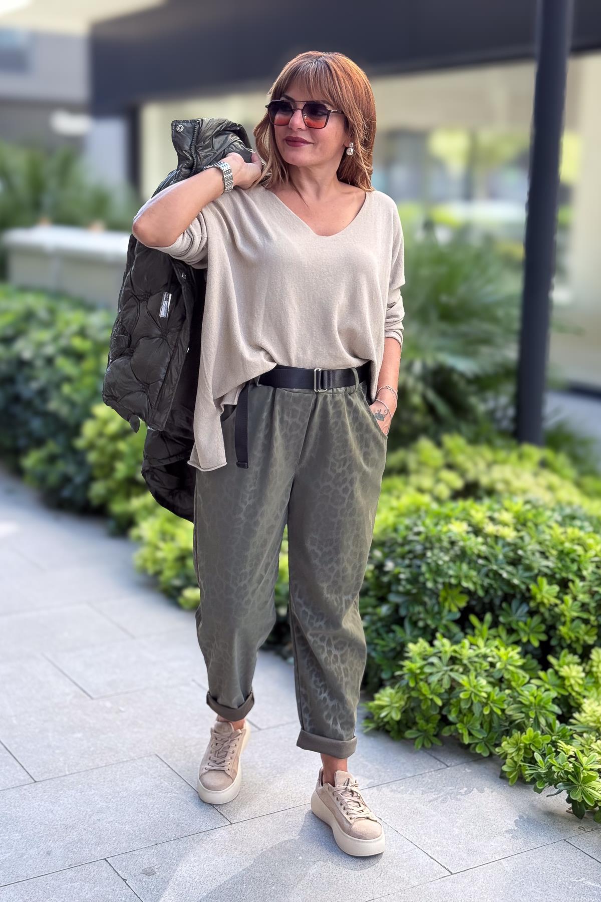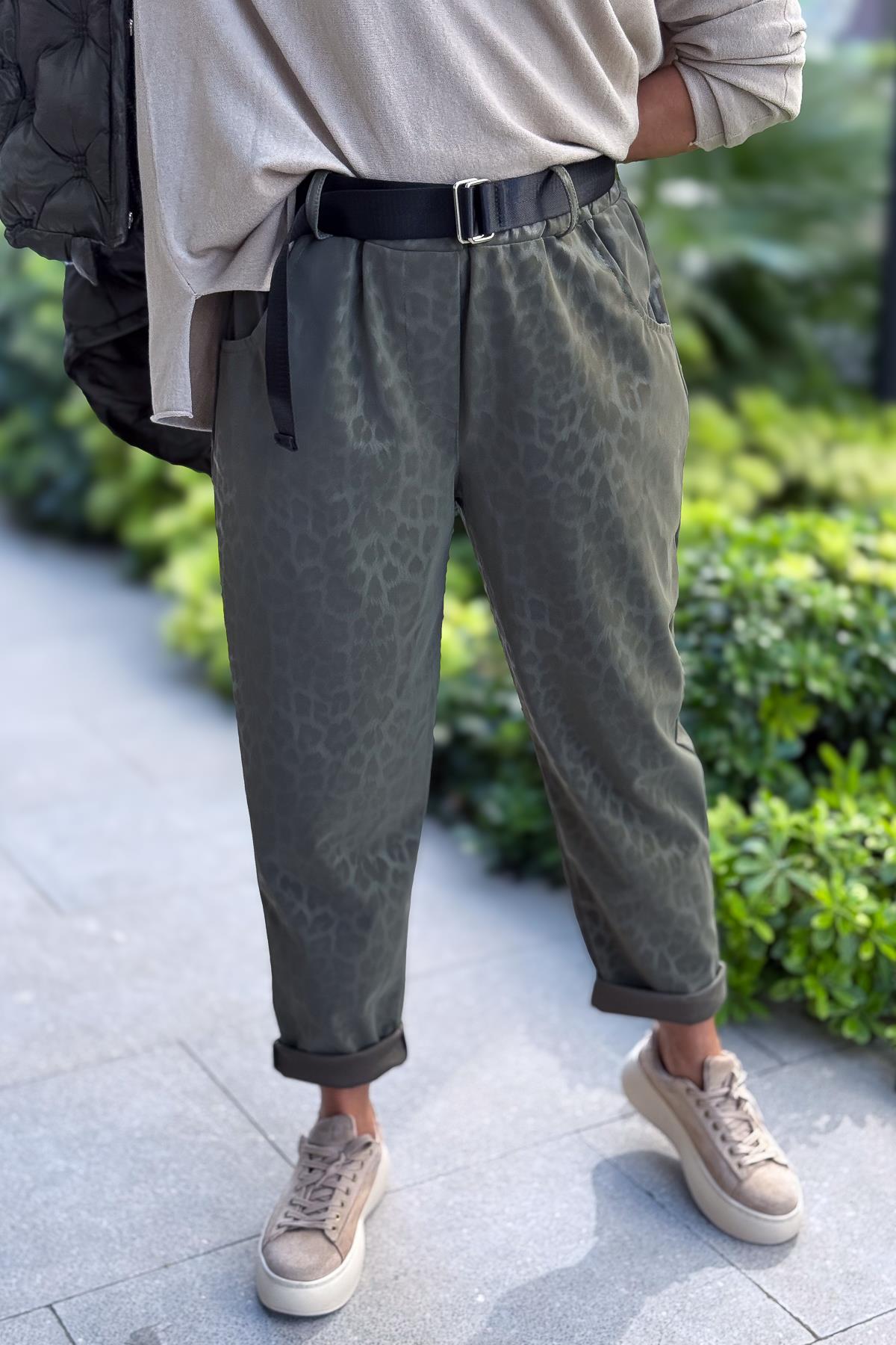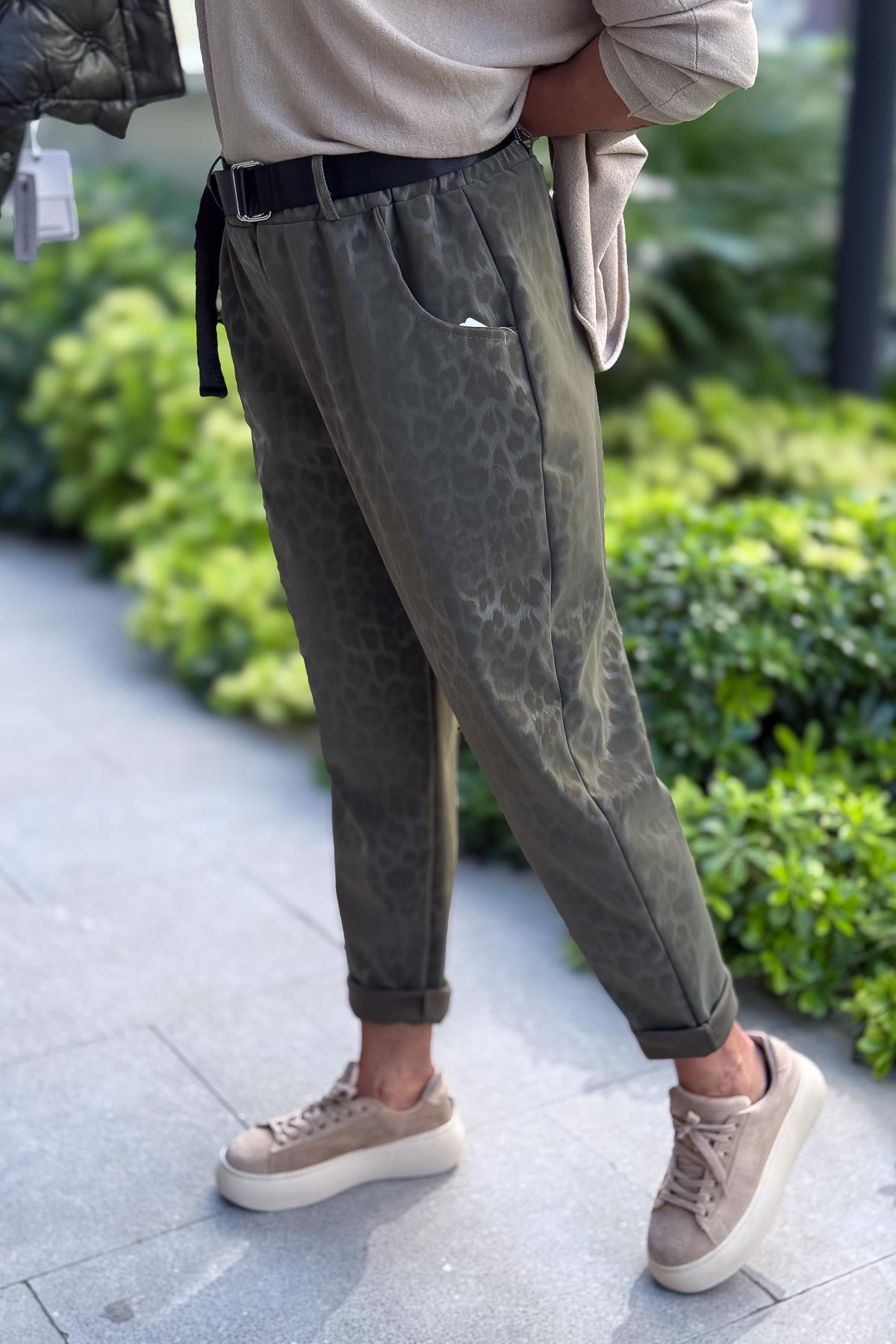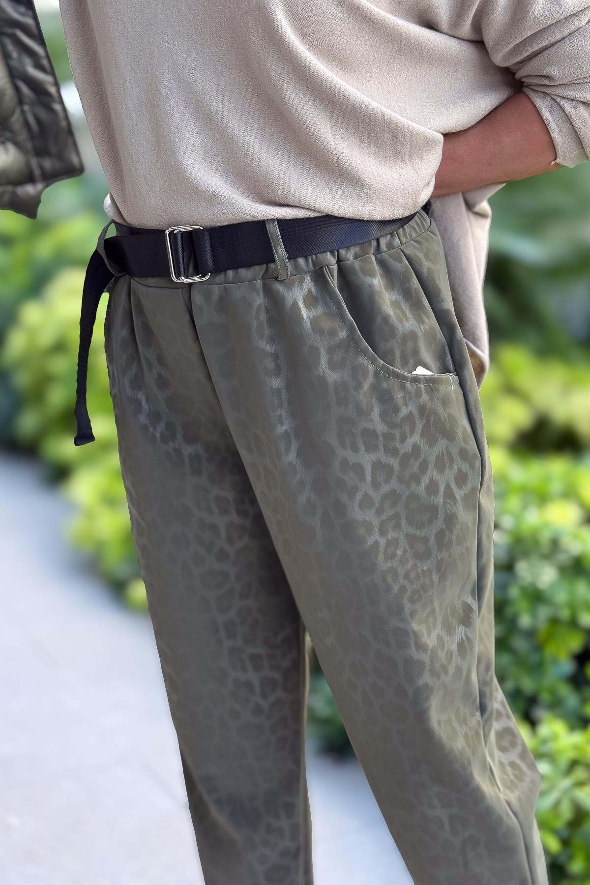 Leopar Desenli Deri Görünümlü Pantolon Haki Renk