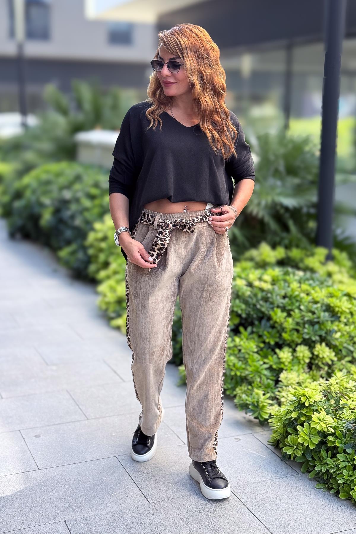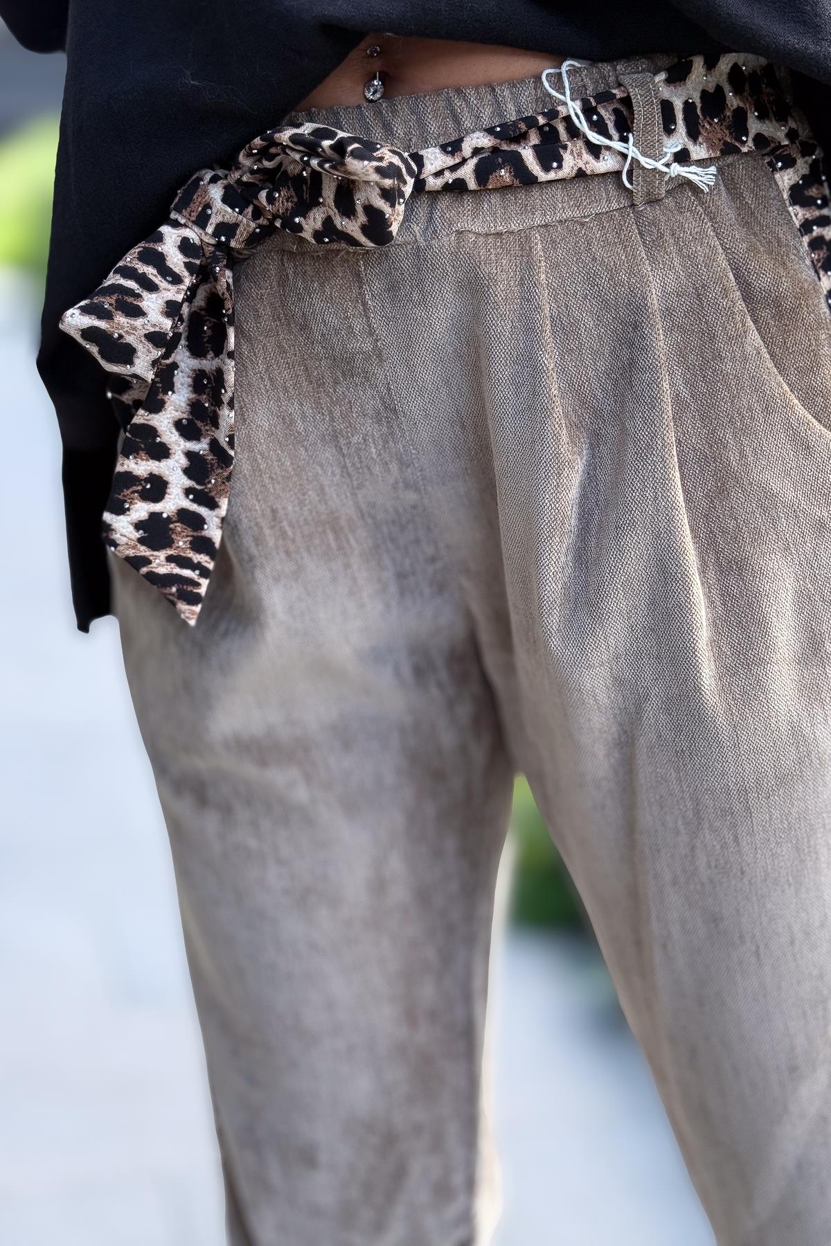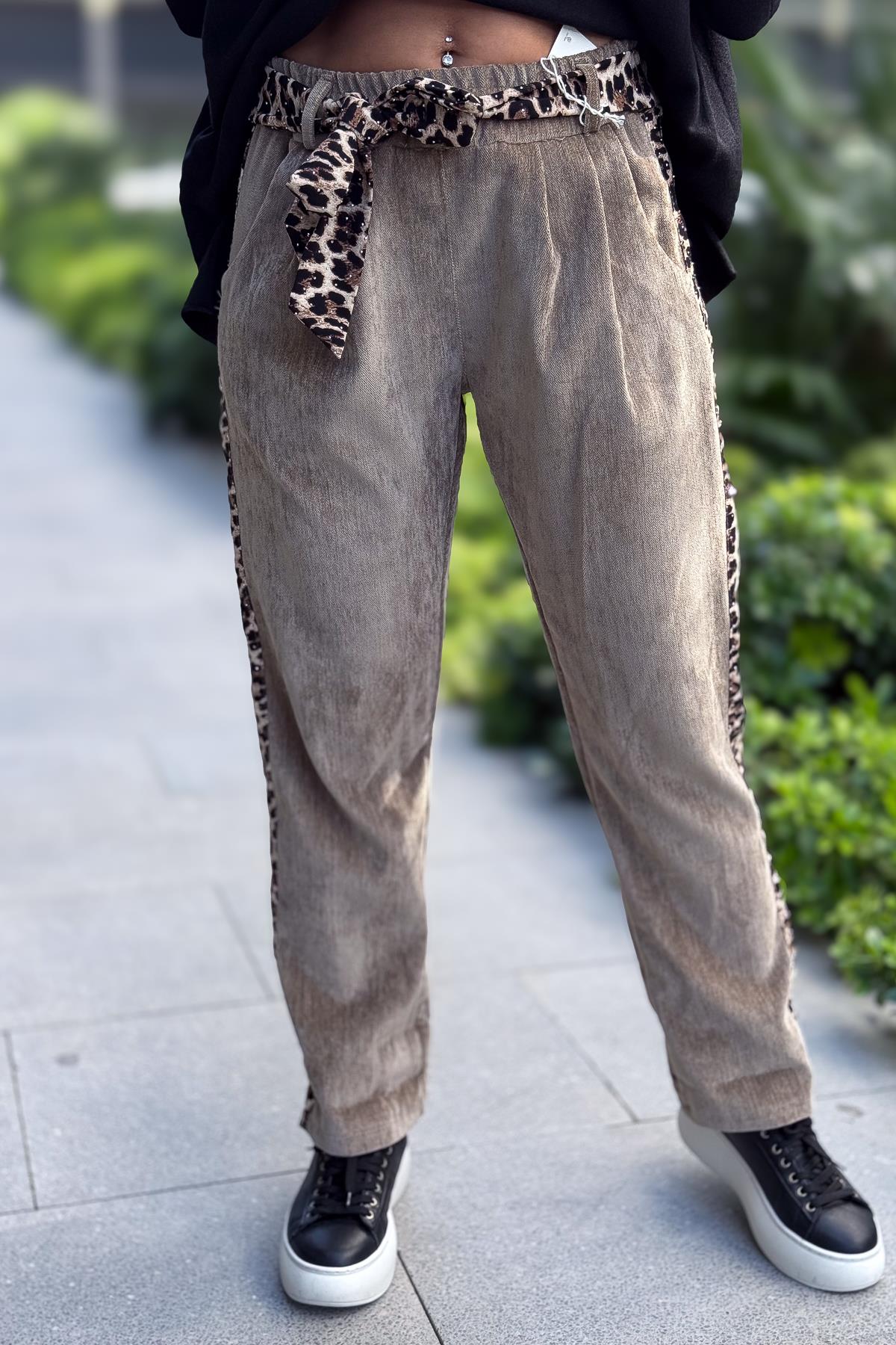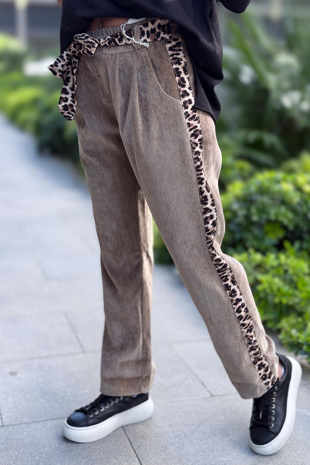 Leopar Kemer Ve Şeritli Pik Detaylı Kadife Pantolon Koyu Bej Renk