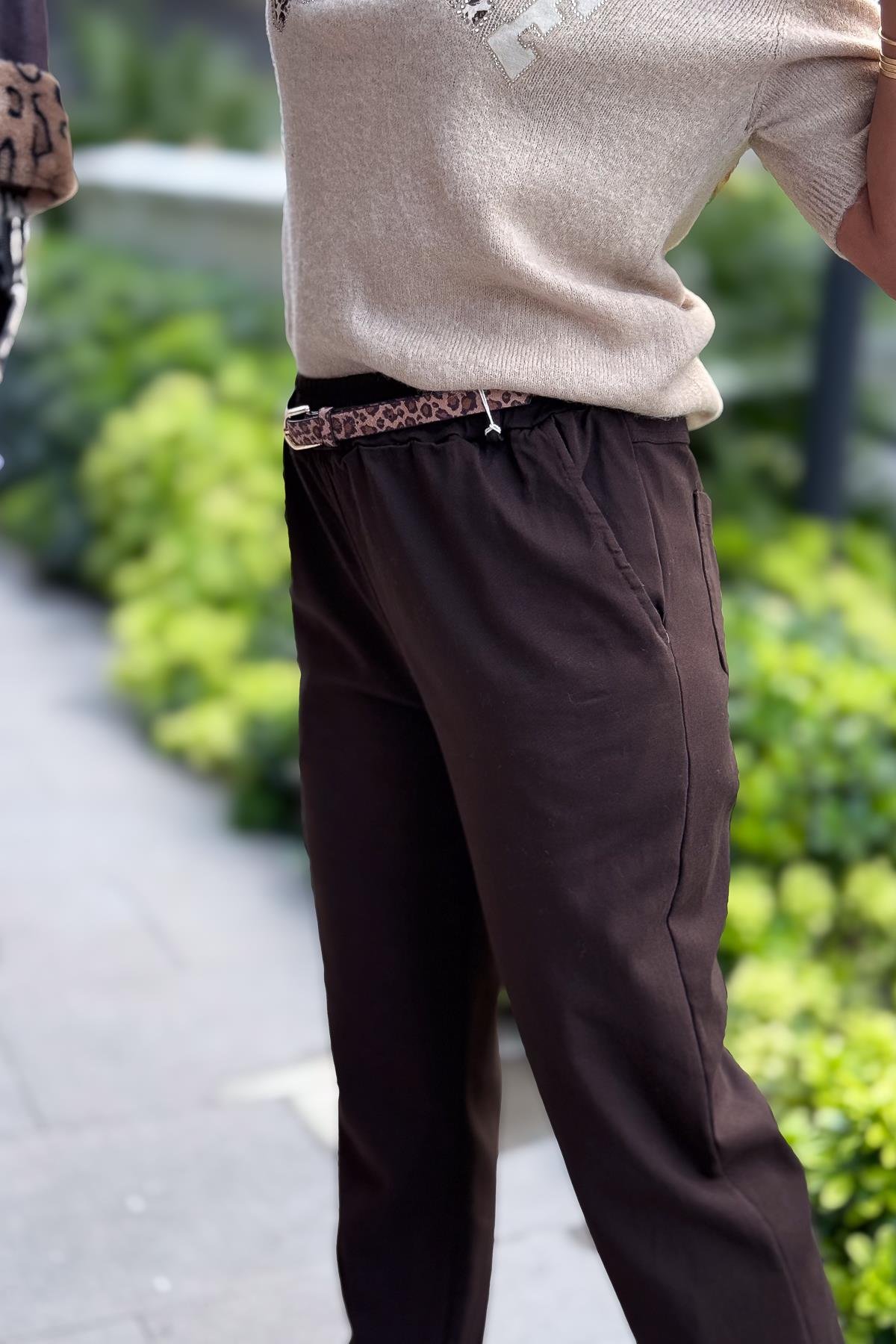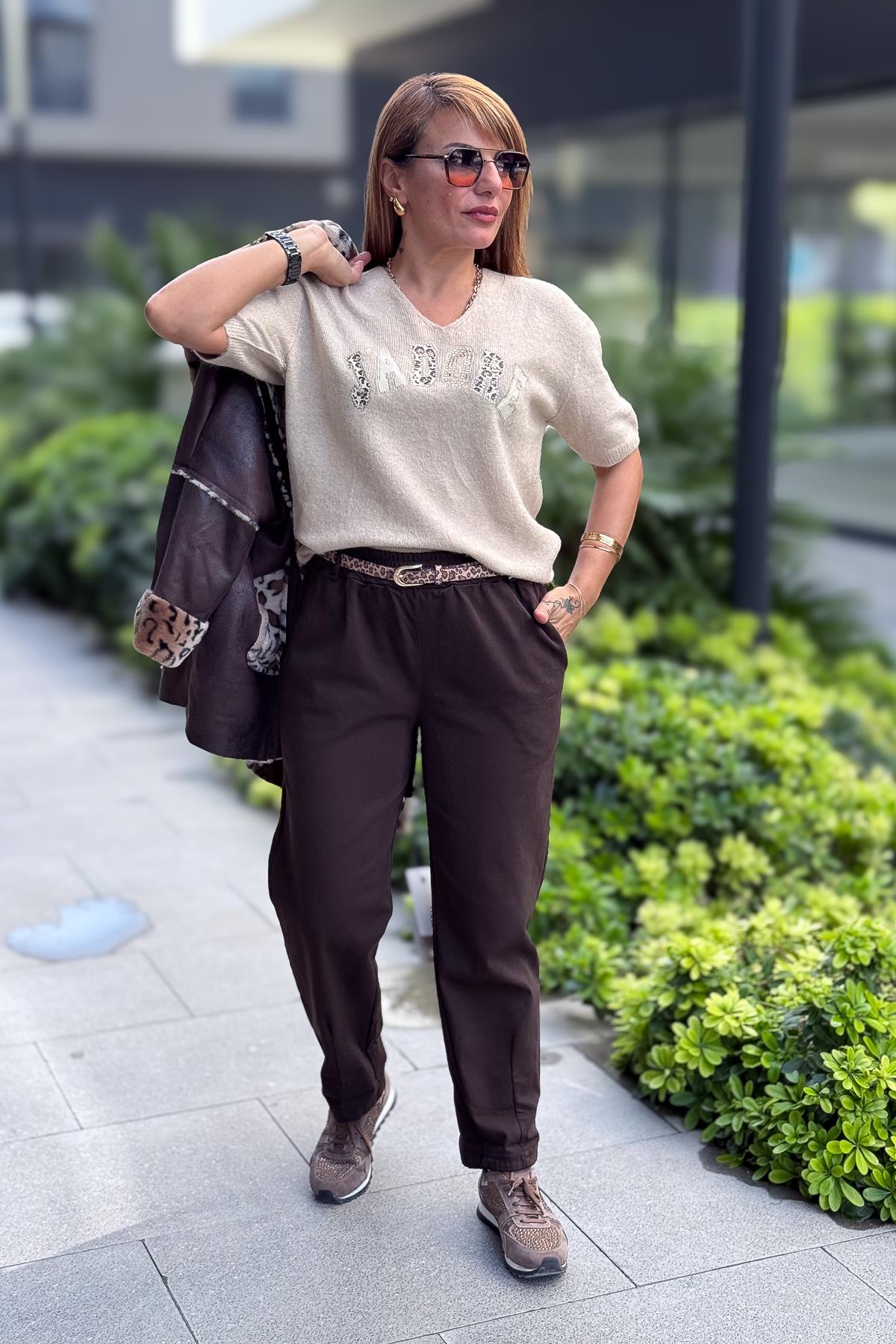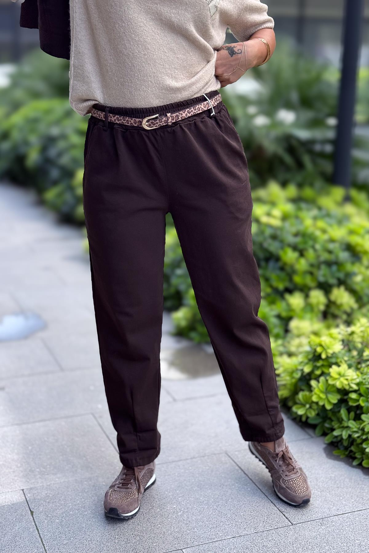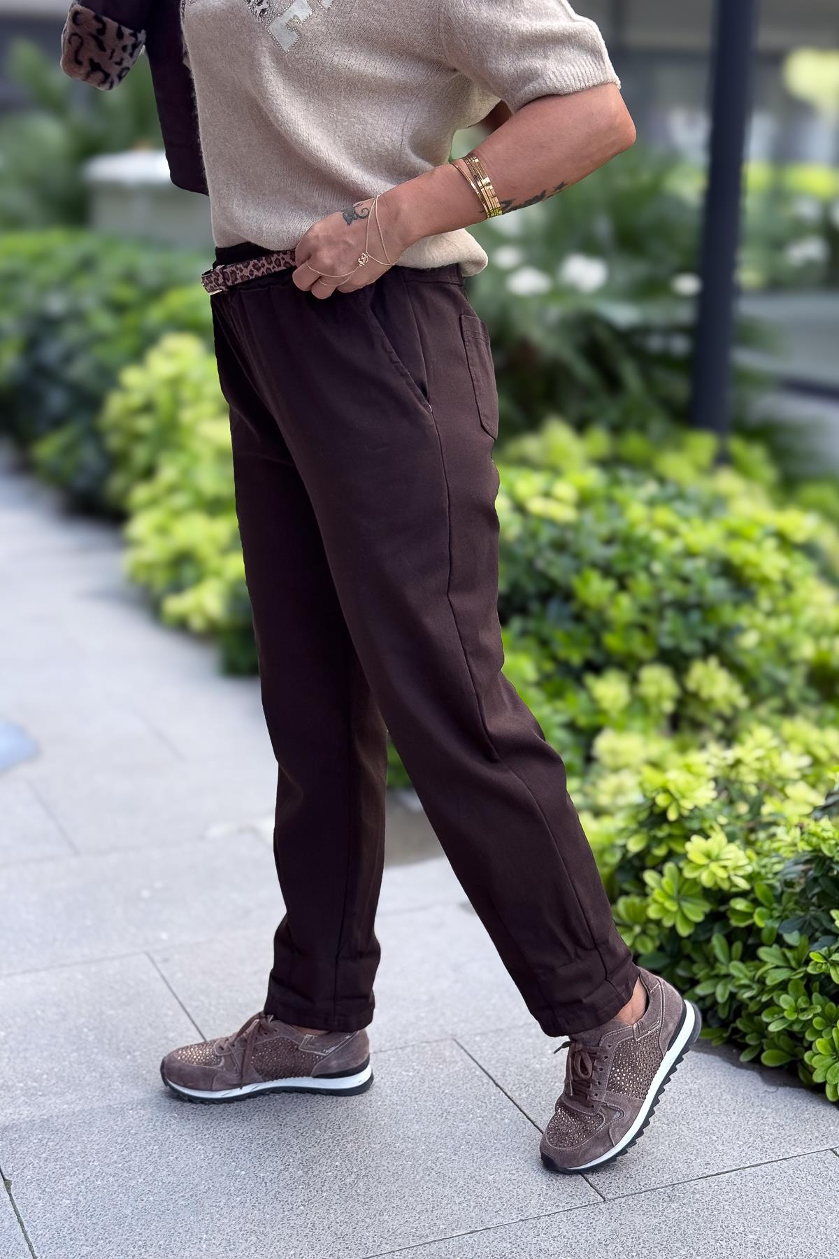 Leopar Kemerli Beli Lastikli Kanvas Pantolon Acı Kahve Renk