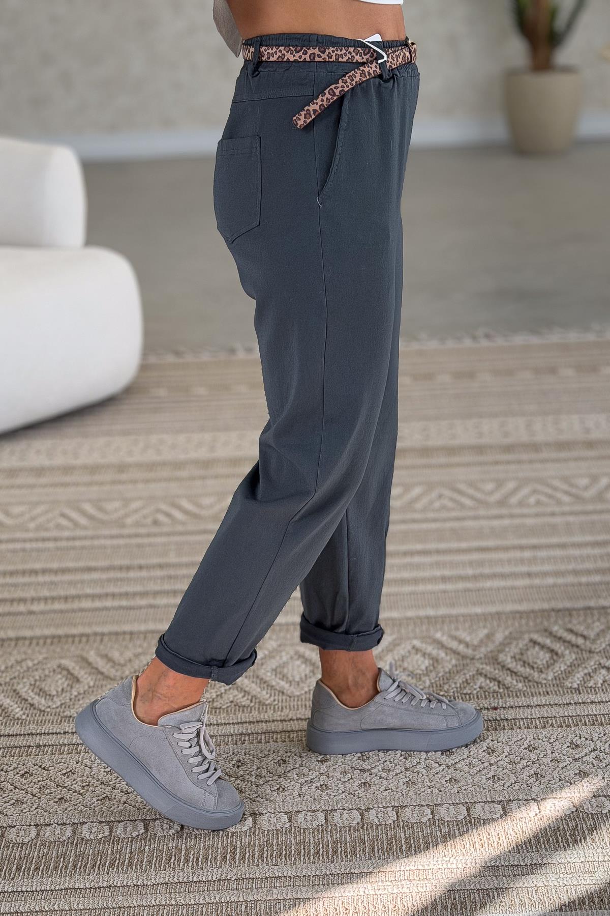 Leopar Kemerli Beli Lastikli Kanvas Pantolon Antresit Renk