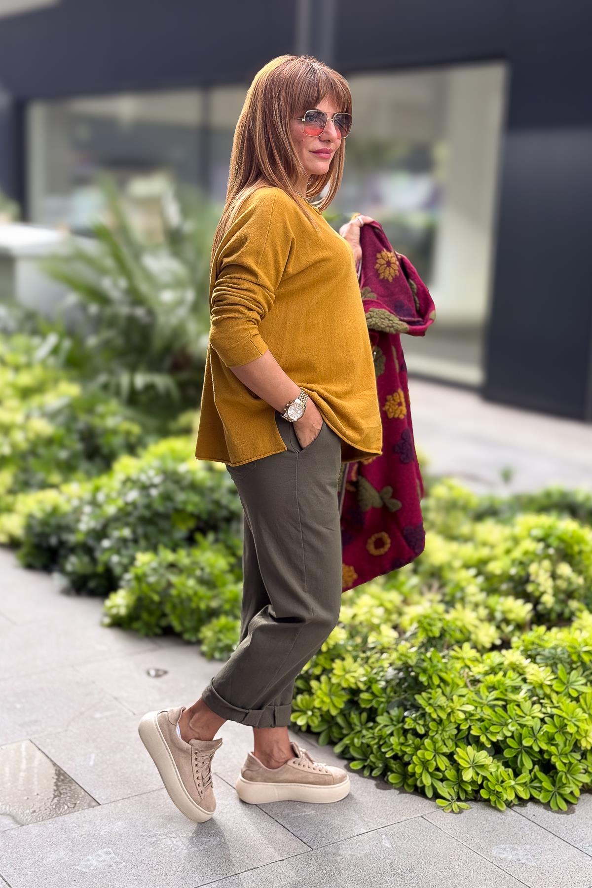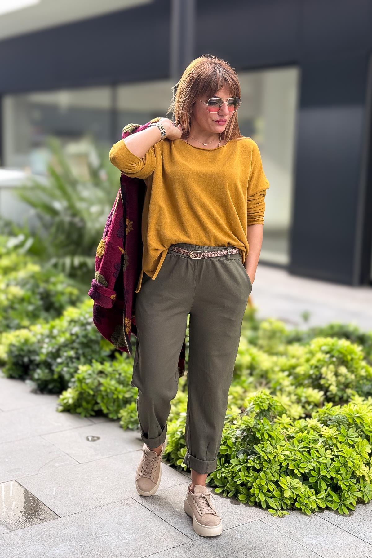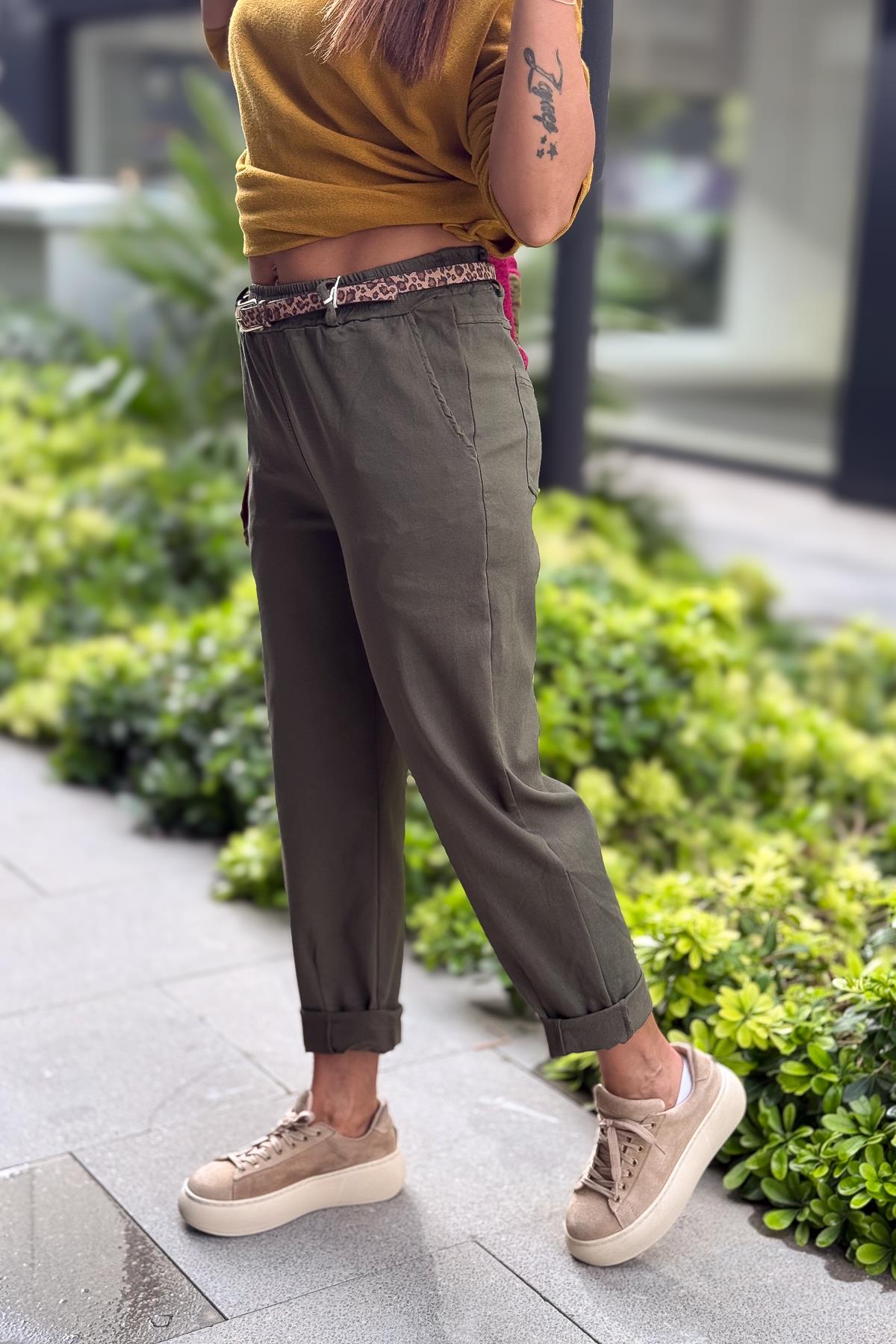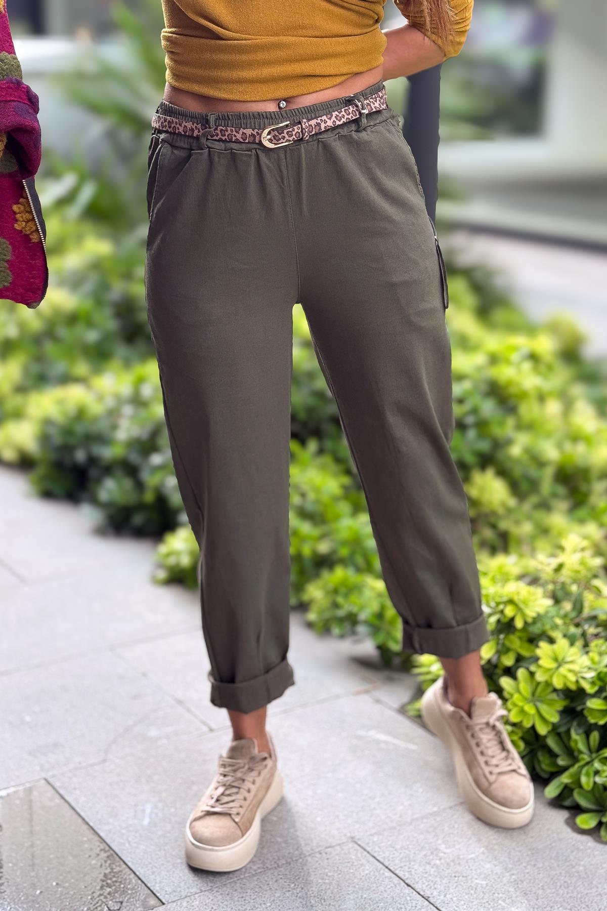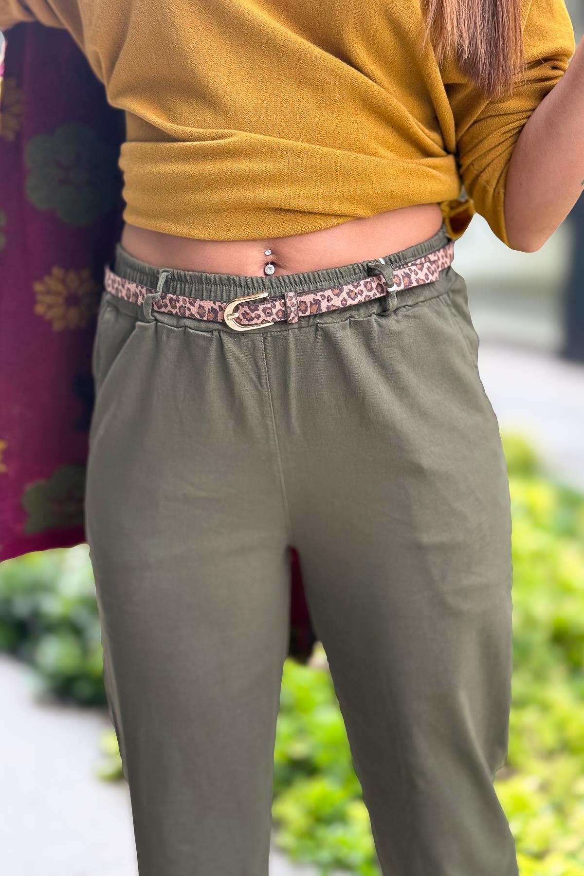 Leopar Kemerli Beli Lastikli Kanvas Pantolon Haki Renk