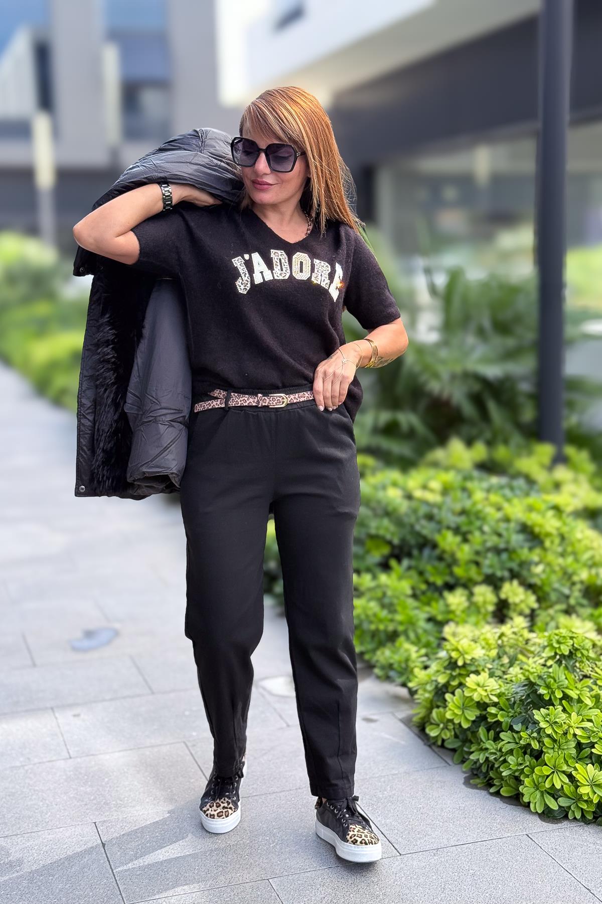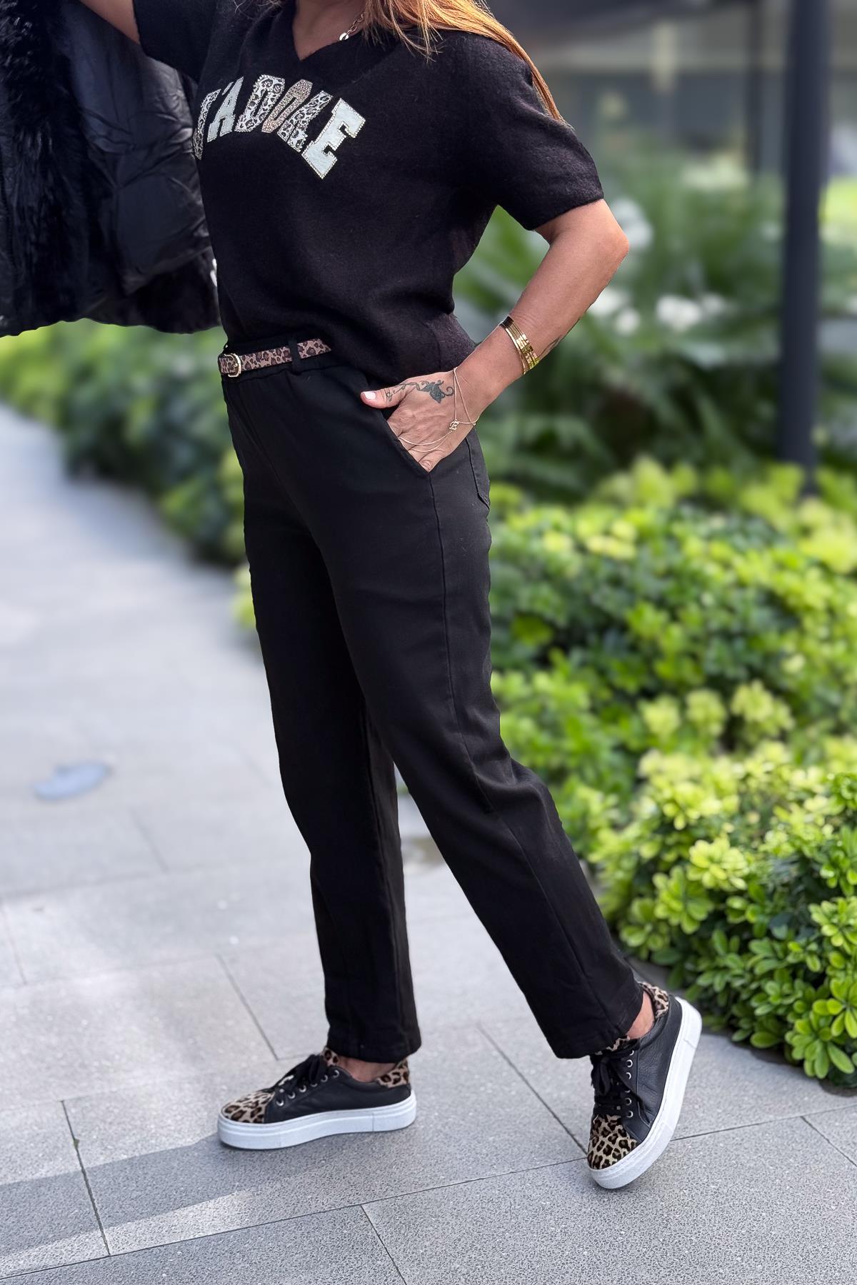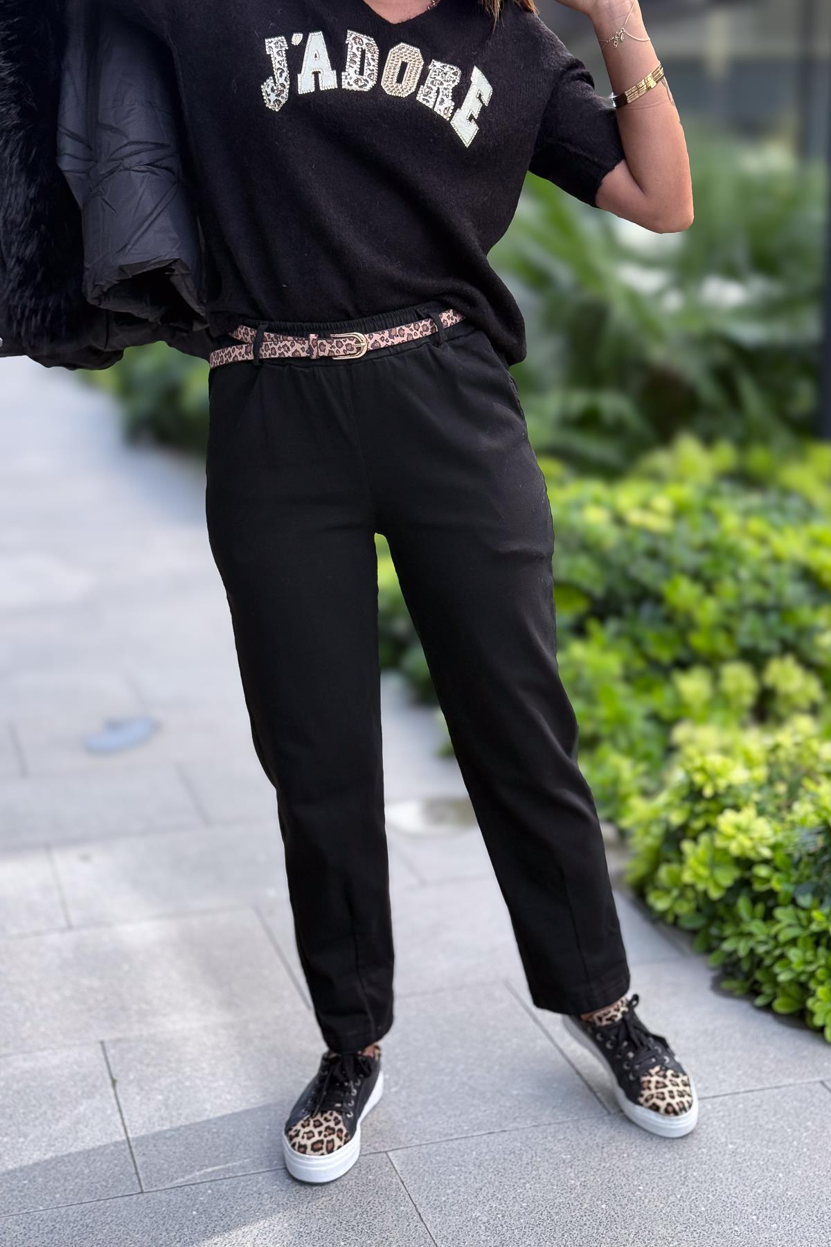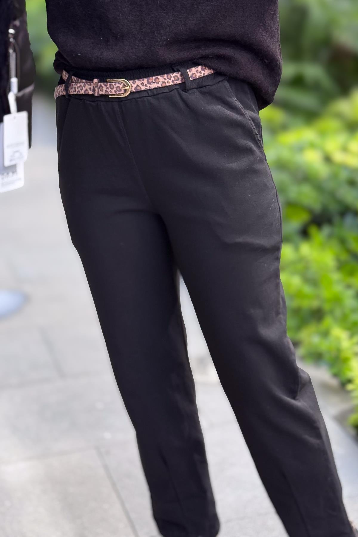 Leopar Kemerli Beli Lastikli Kanvas Pantolon Siyah Renk